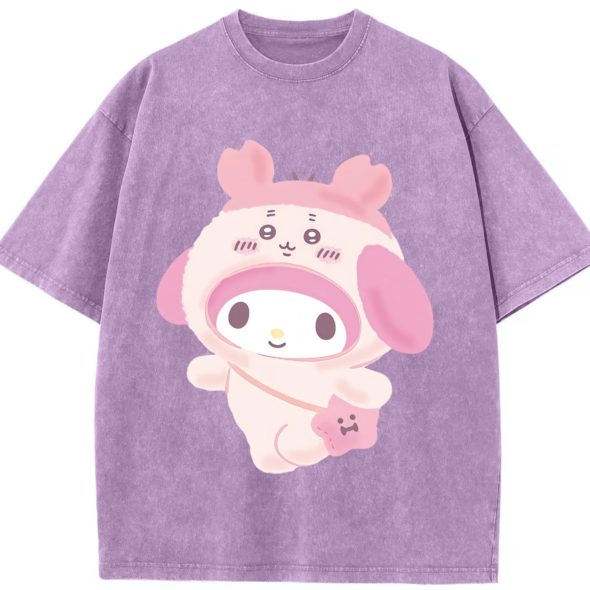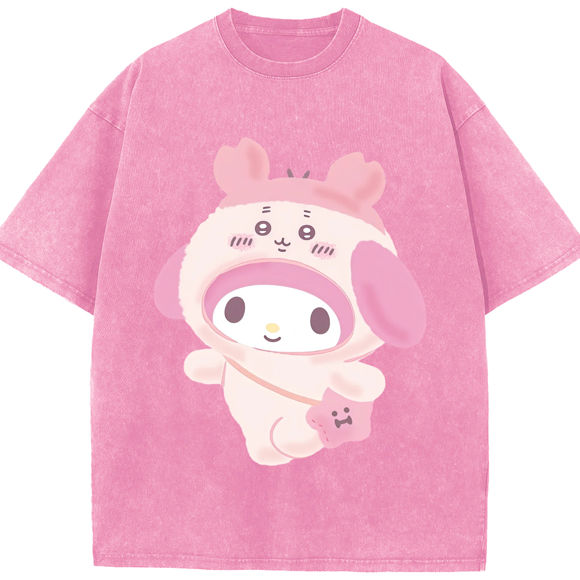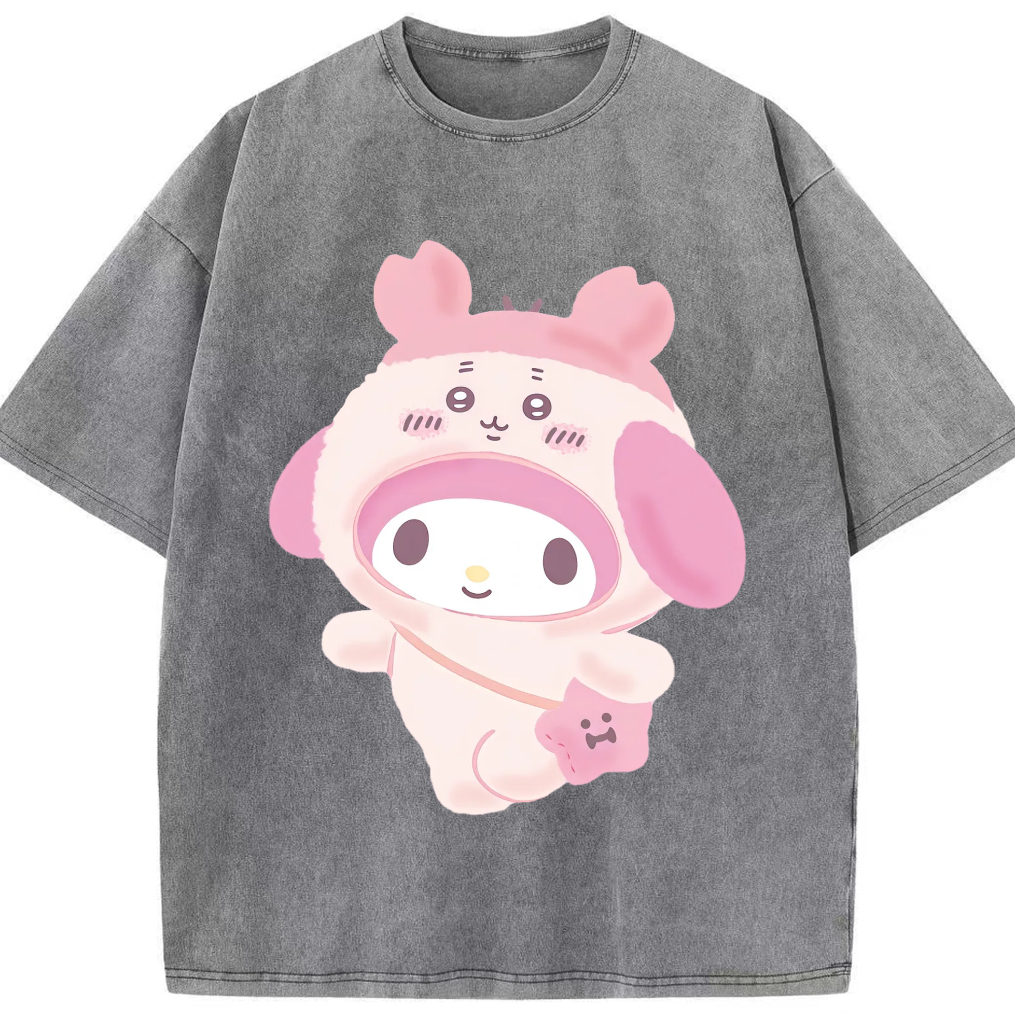 マイメロディ&ちいかわ - 綿100% ヴィンテージ風 半袖Tシャツ ・ 背面プリント ・ 柔らか肌触り ・ 通気性 快適 ・ スポーツ カジュアル 外出用