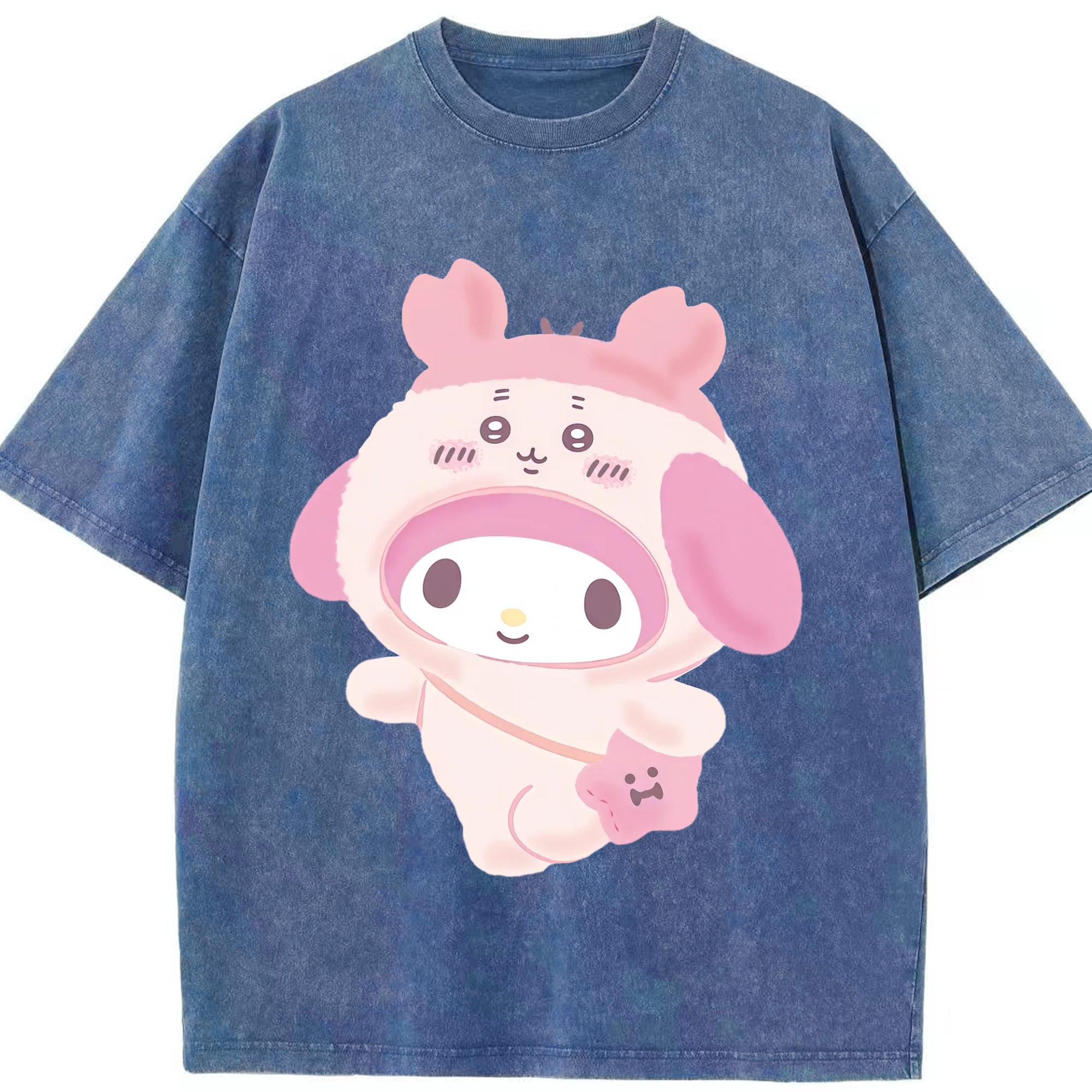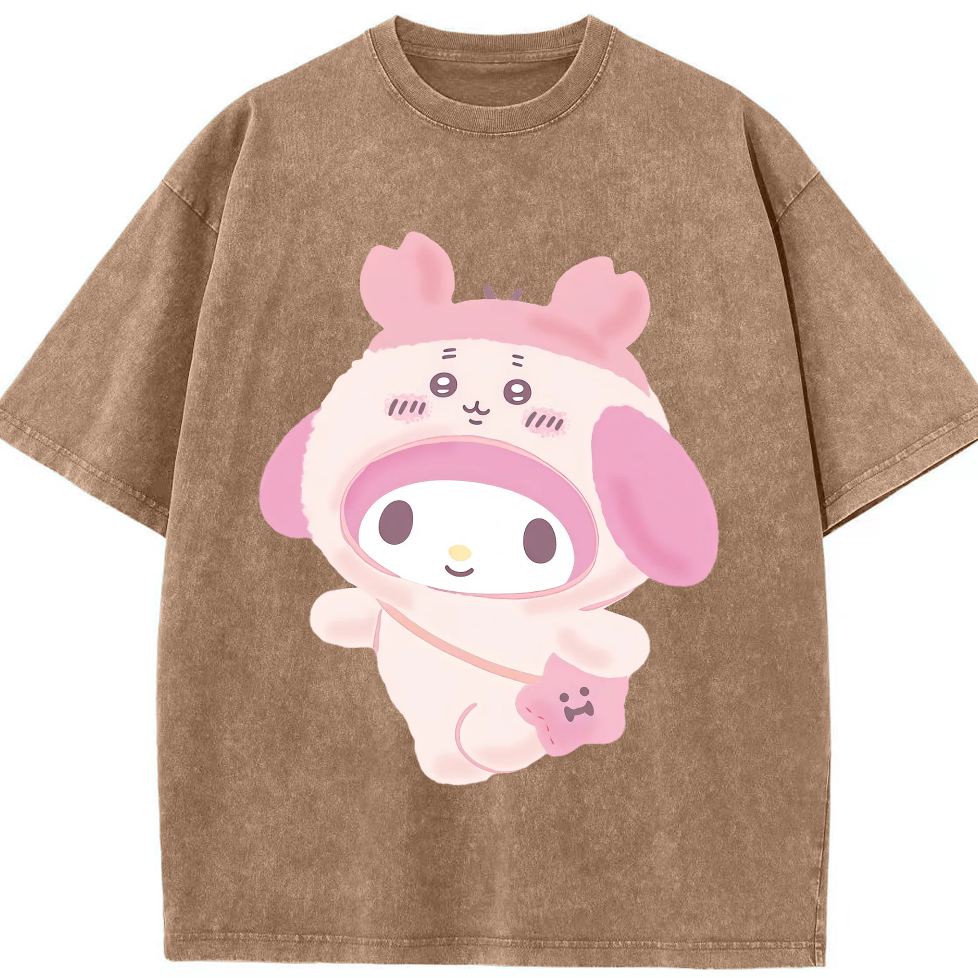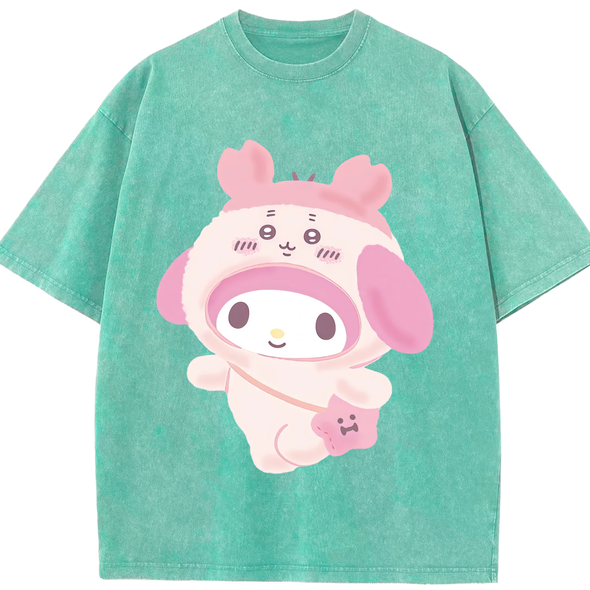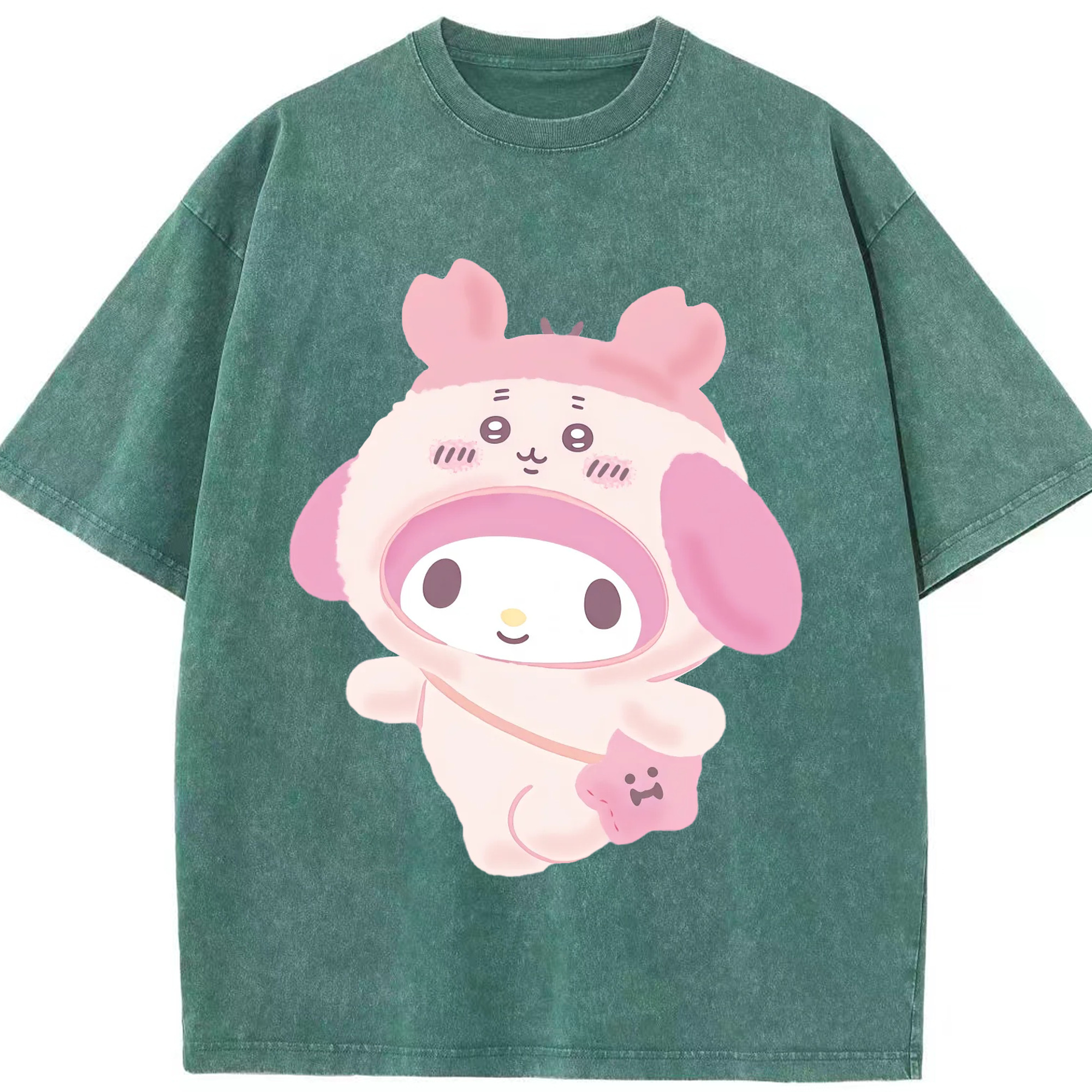 マイメロディ&ちいかわ - 綿100% ヴィンテージ風 半袖Tシャツ ・ 背面プリント ・ 柔らか肌触り ・ 通気性 快適 ・ スポーツ カジュアル 外出用