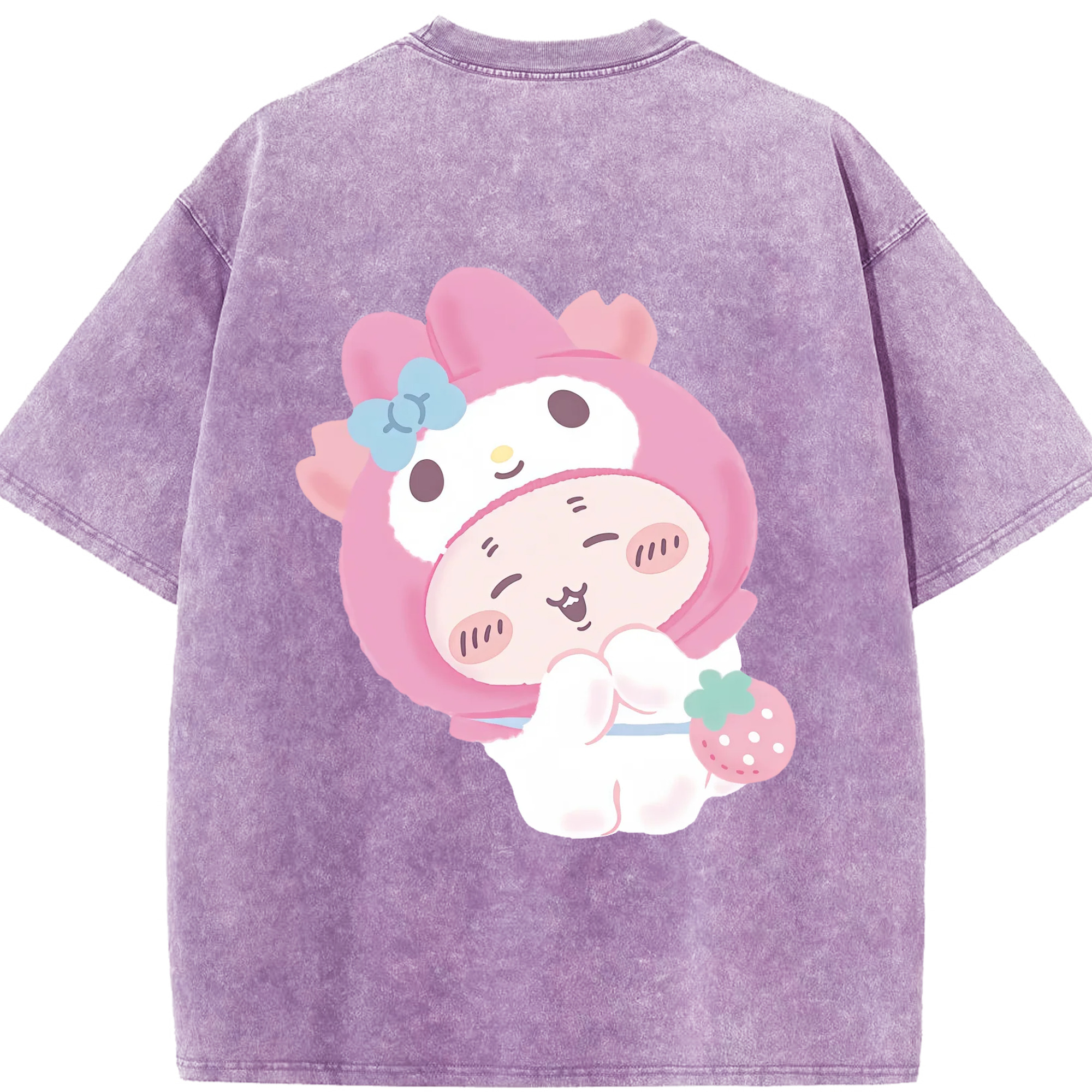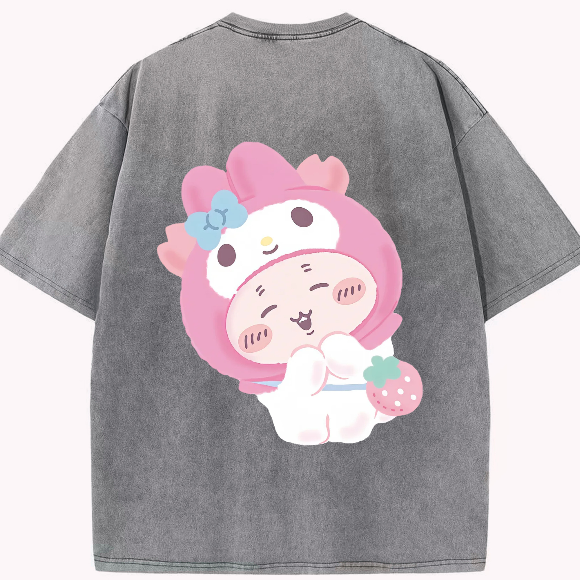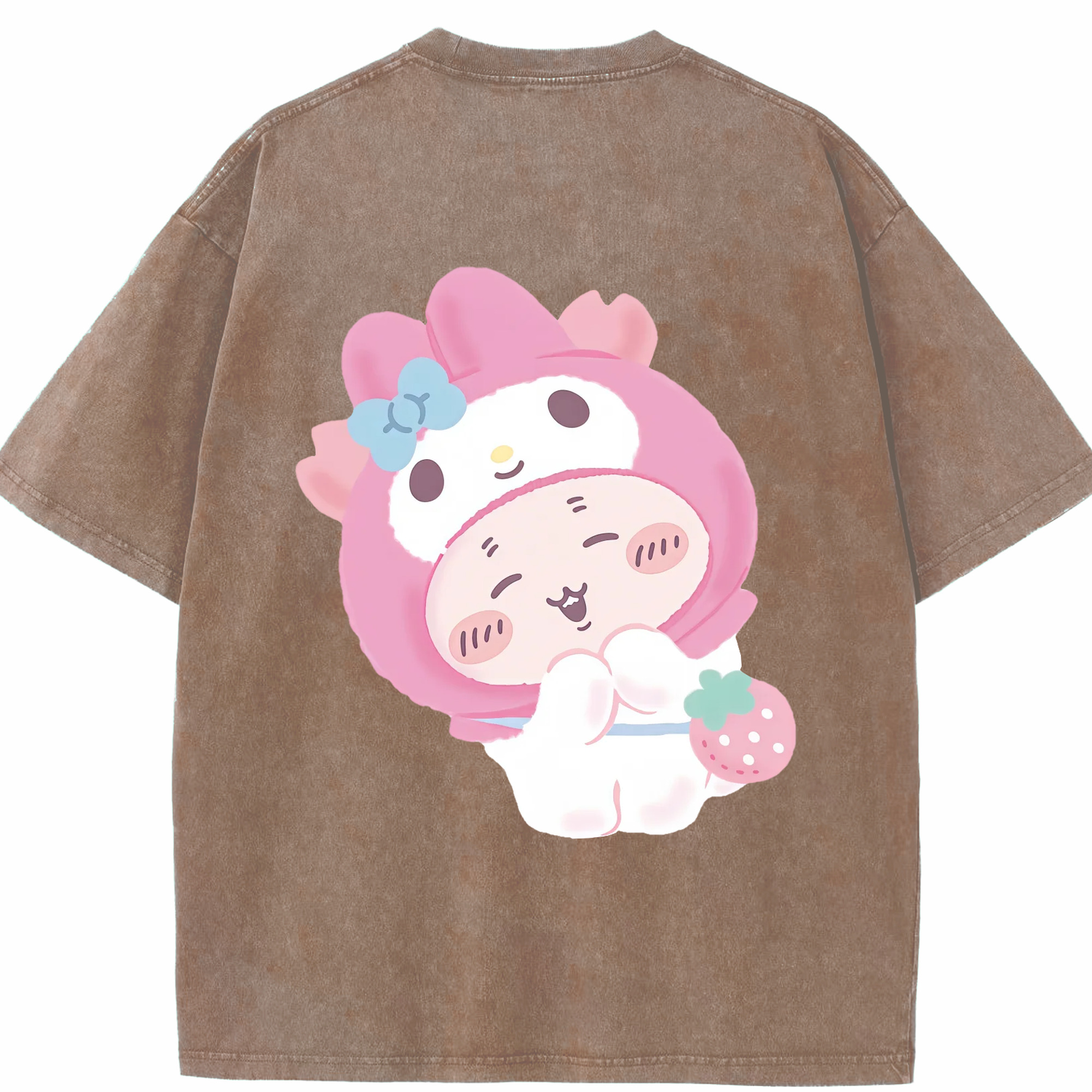 マイメロディ&ちいかわ - 綿100% ヴィンテージ風 半袖Tシャツ ・ フロントプリント ・ 柔らか肌触り ・ 通気性 快適 ・ スポーツ カジュアル 外出用