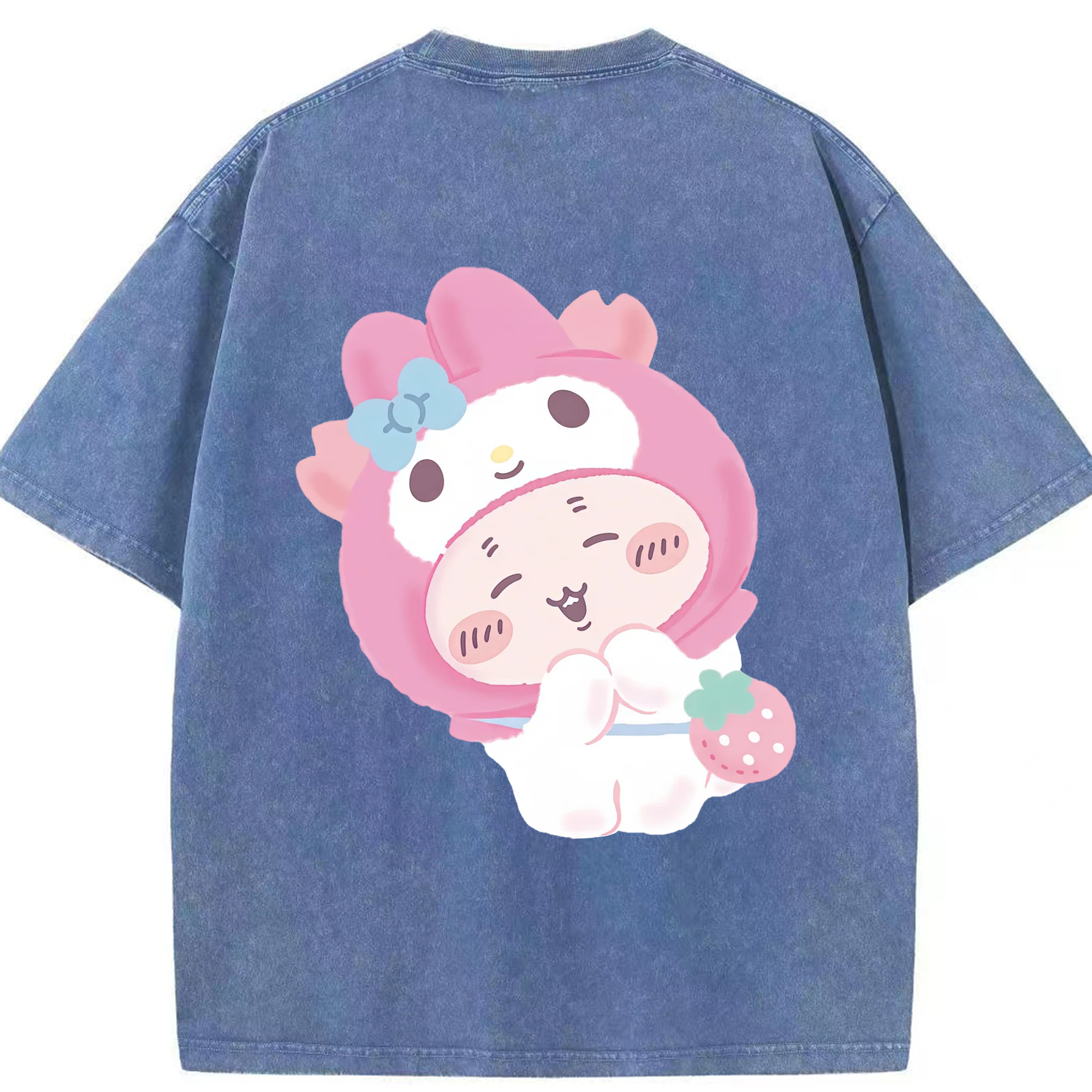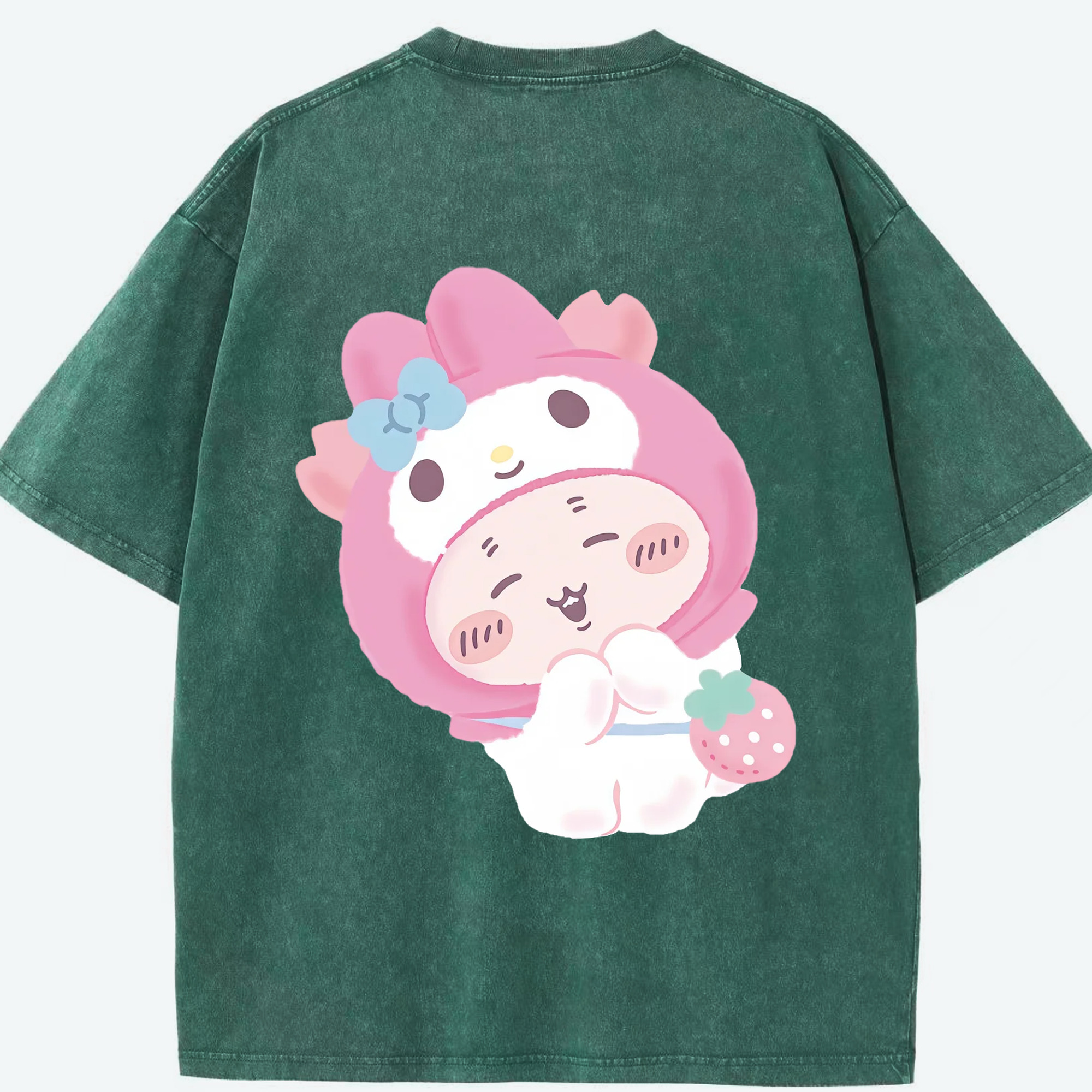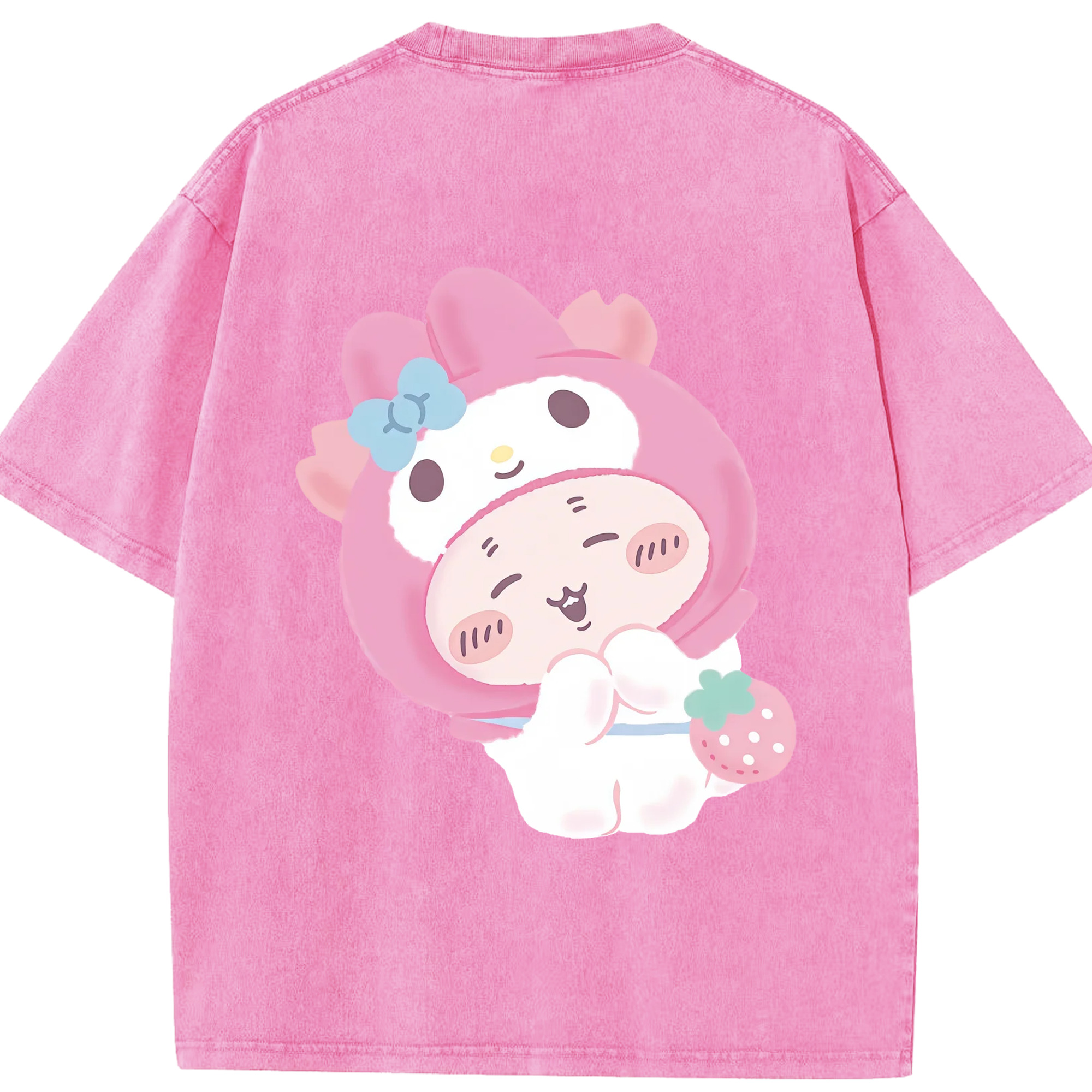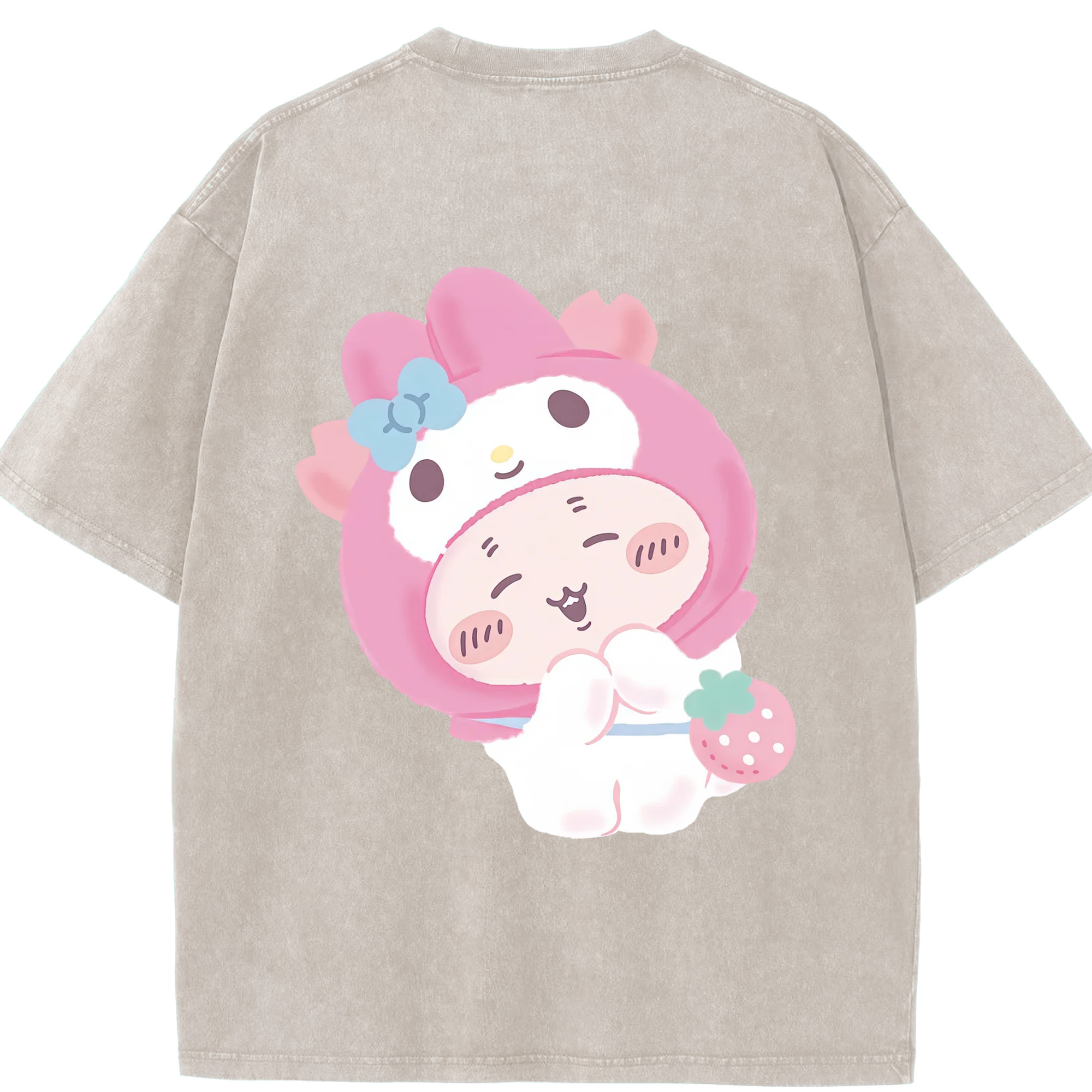 マイメロディ&ちいかわ - 綿100% ヴィンテージ風 半袖Tシャツ ・ フロントプリント ・ 柔らか肌触り ・ 通気性 快適 ・ スポーツ カジュアル 外出用