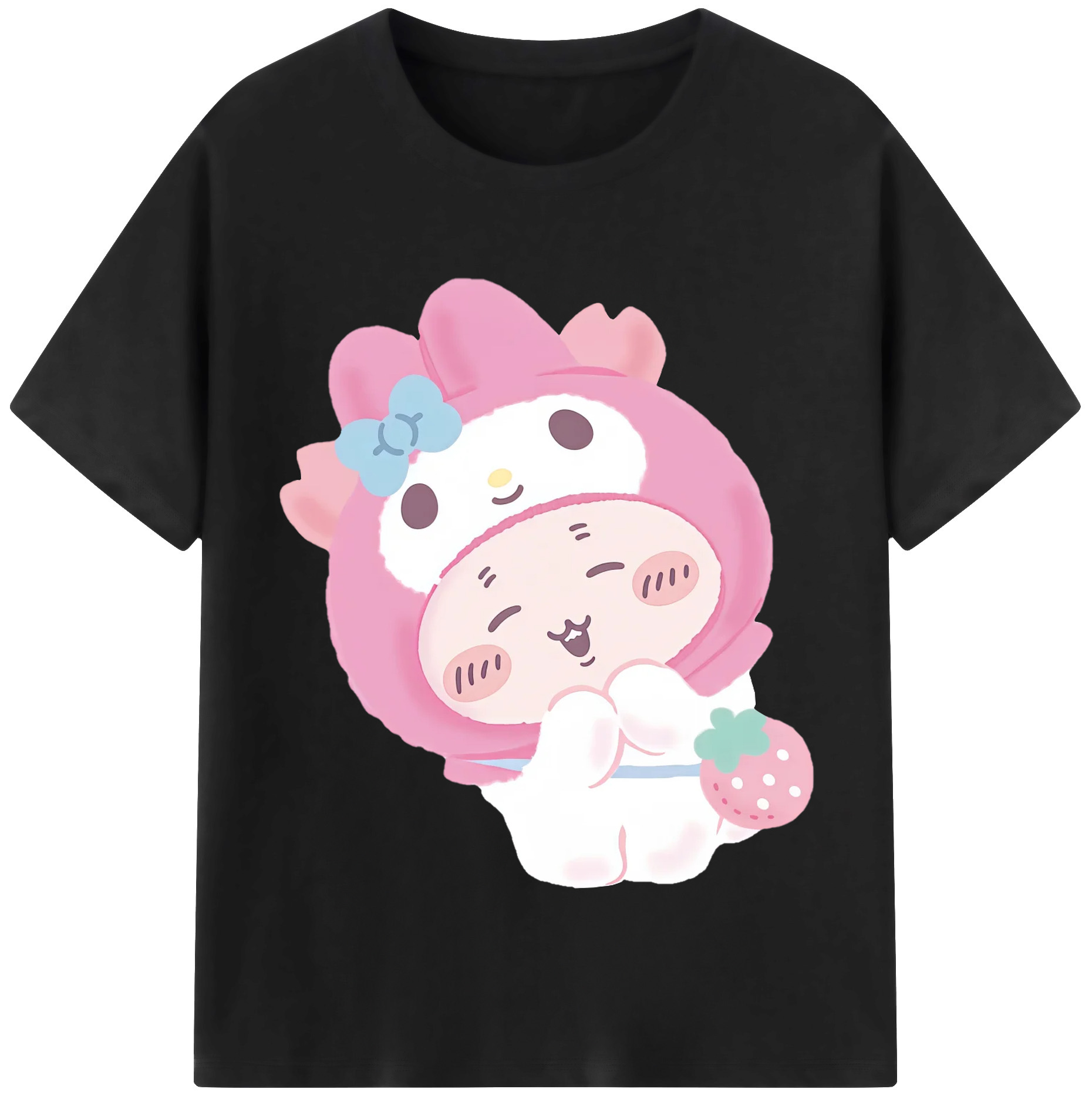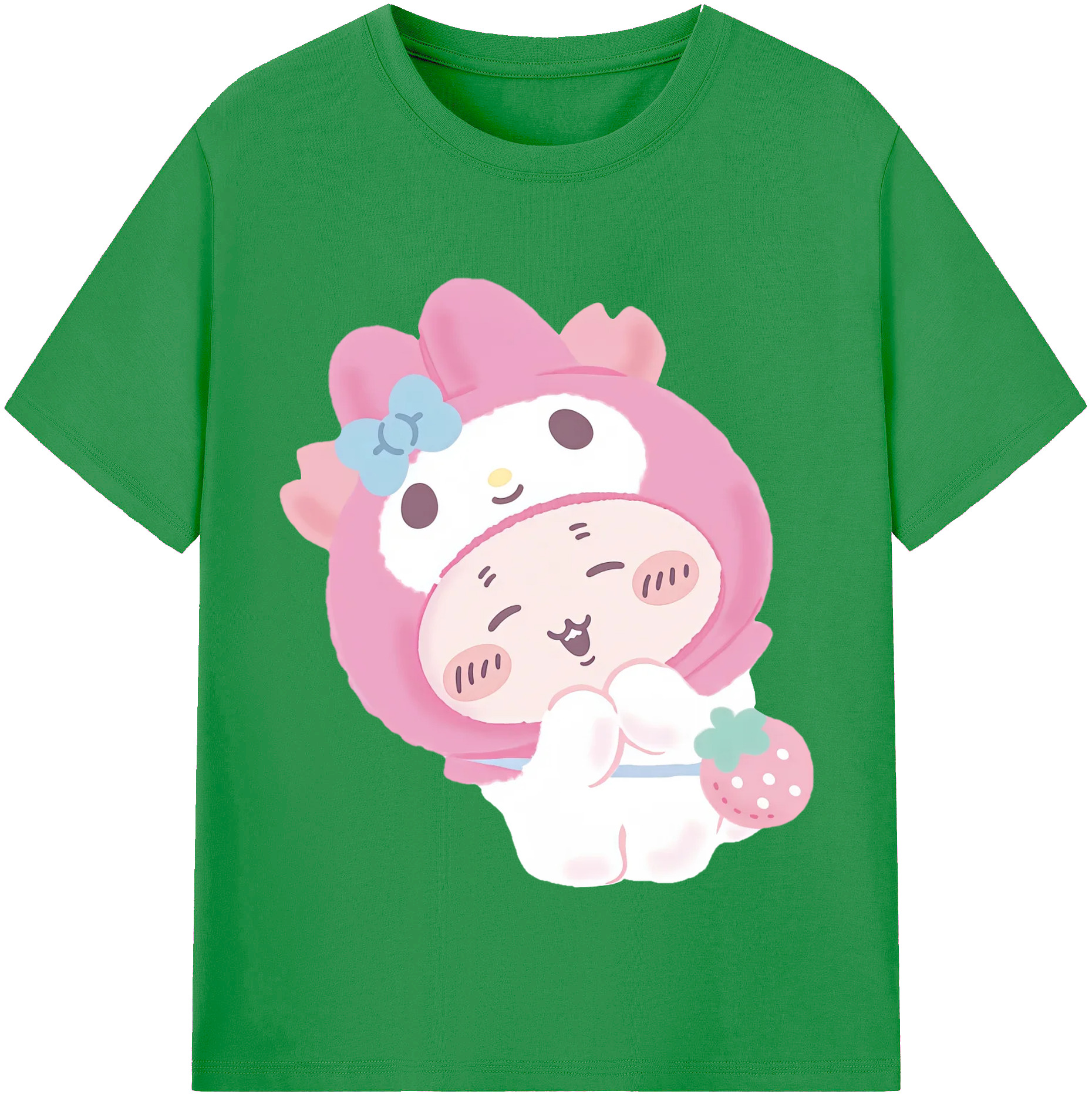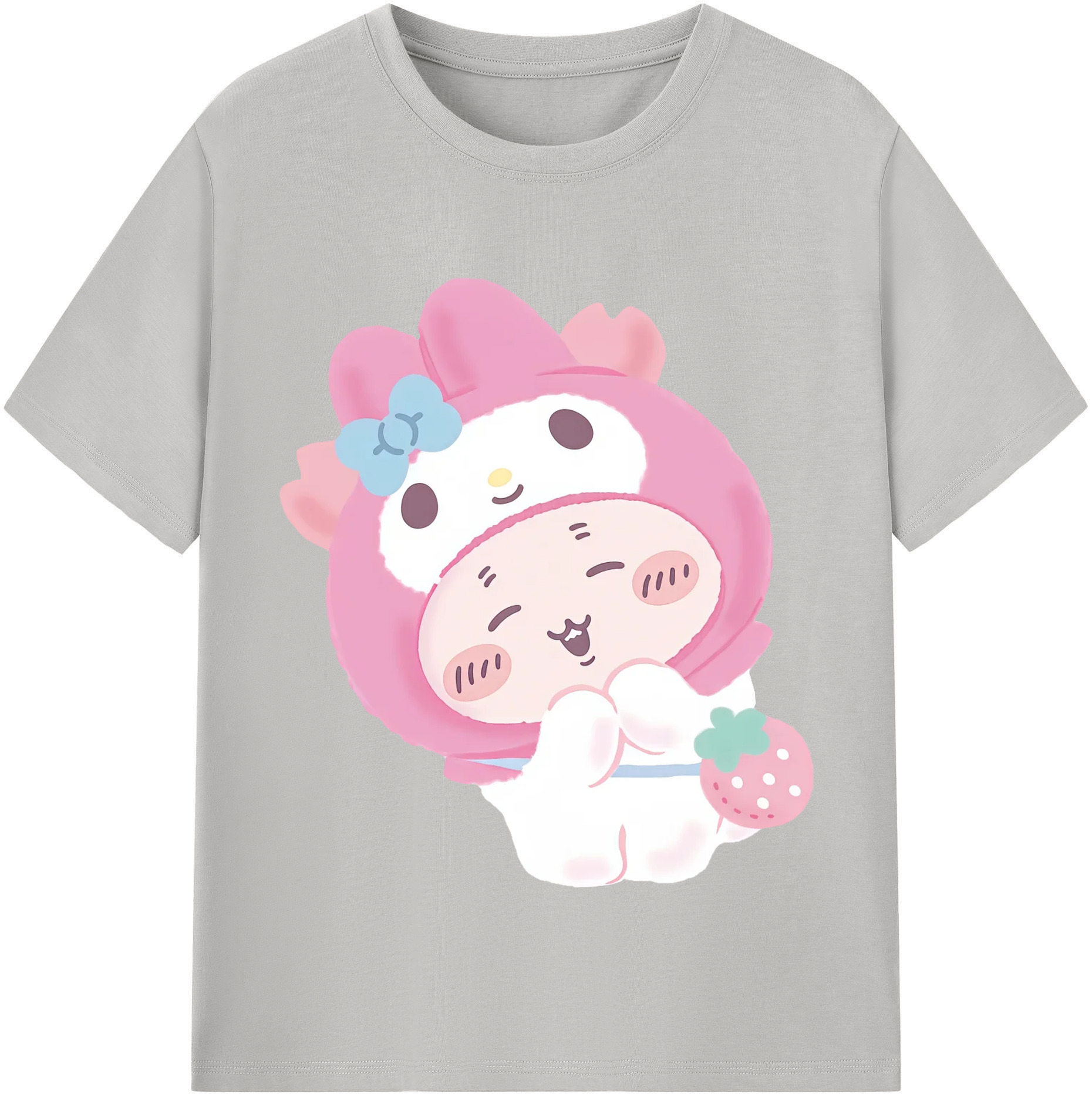 マイメロディ&ちいかわ - レディースカジュアルプリントTシャツ ・ 綿100% ・ クルーネック ・ フロントプリント ・ 柔らかく快適 ・ フィットネス カジュアル 旅行用