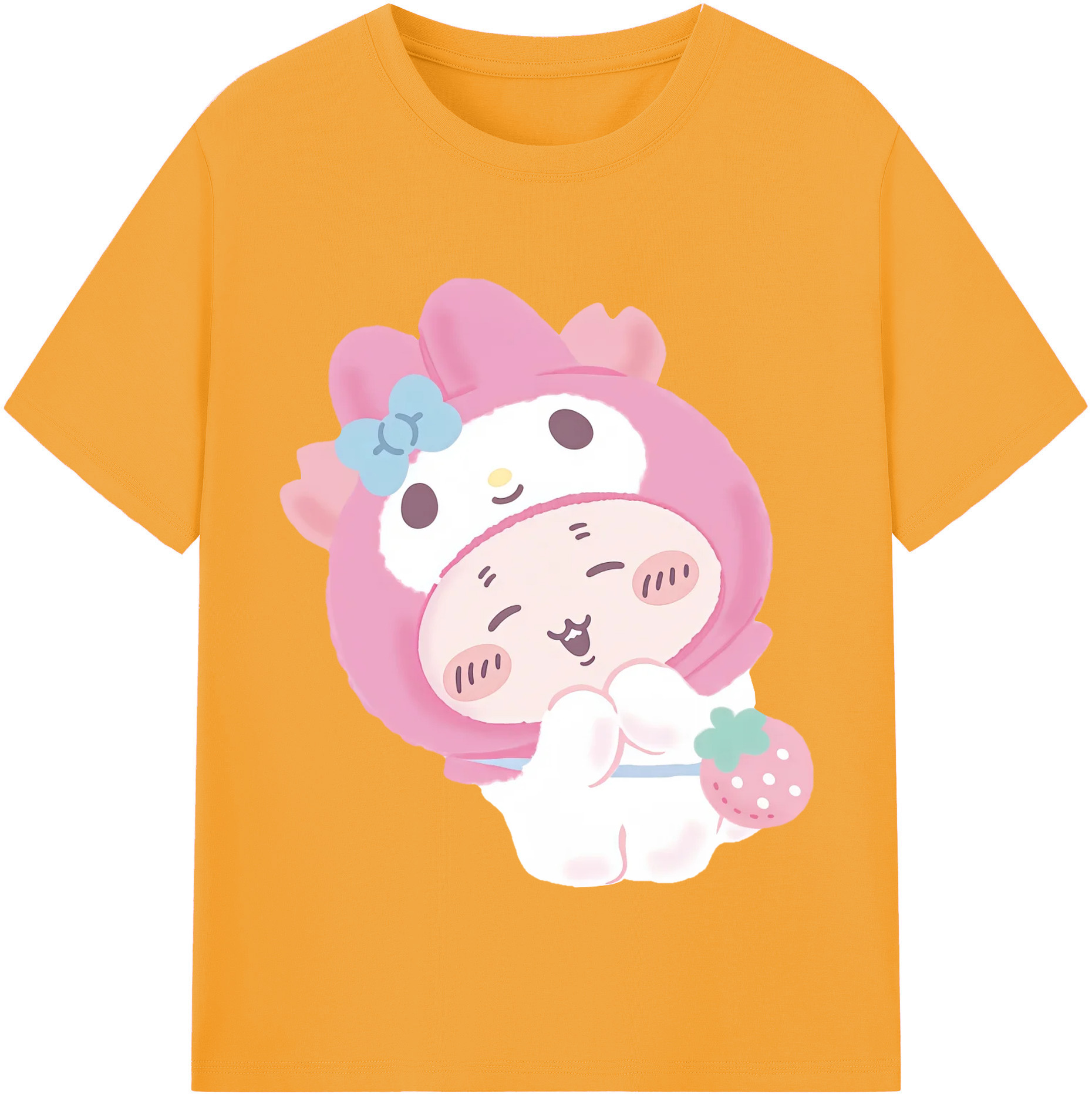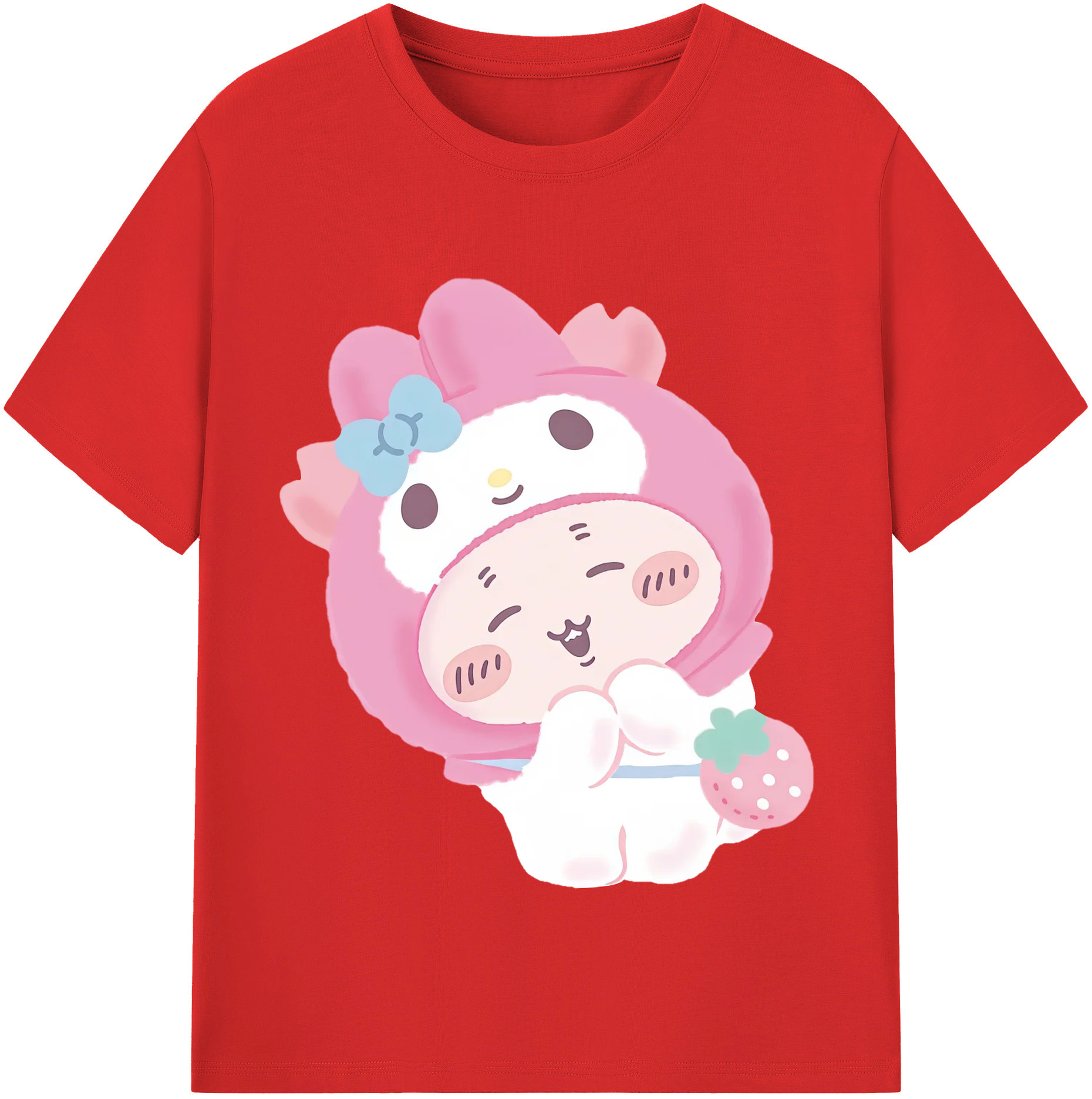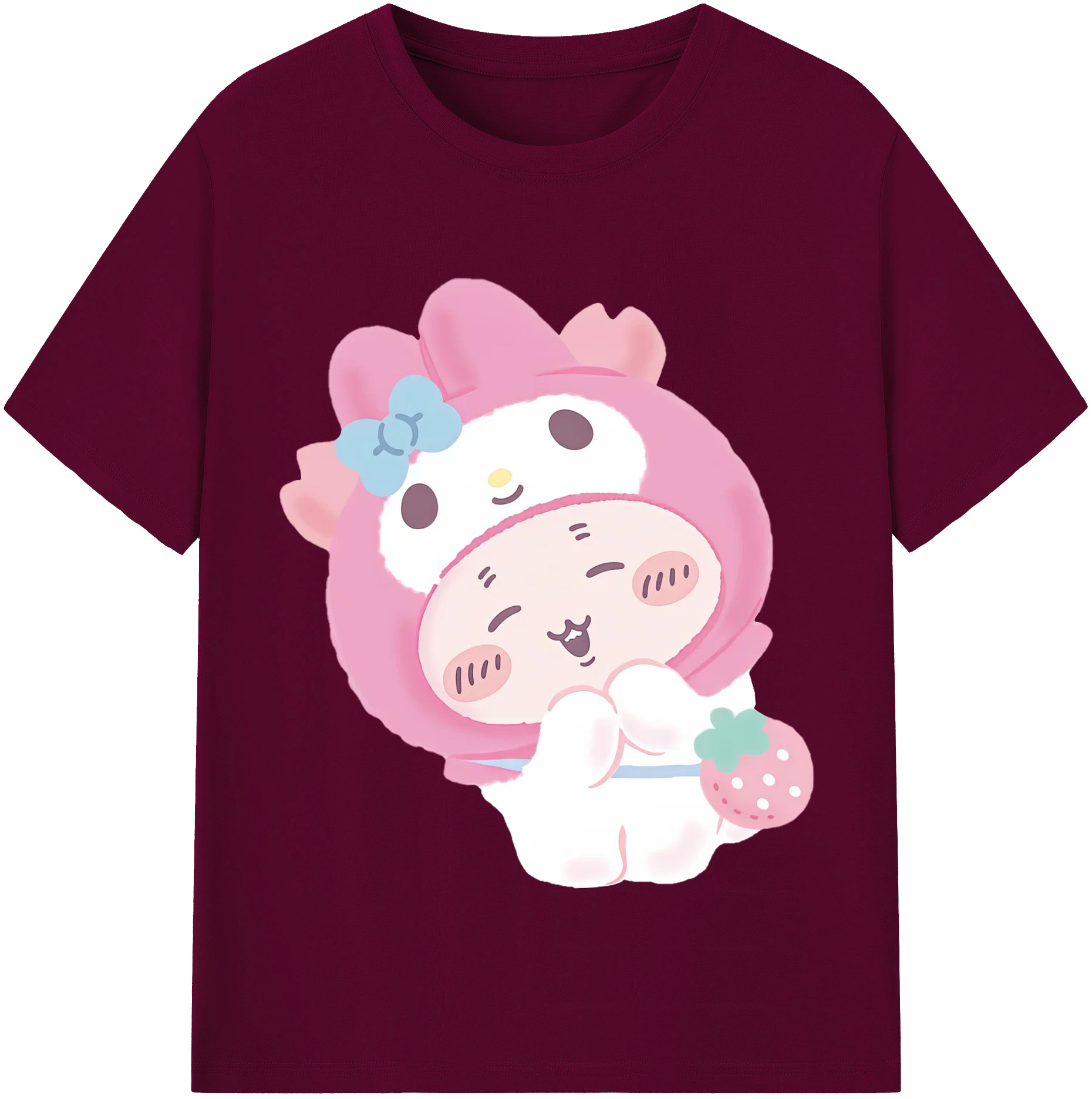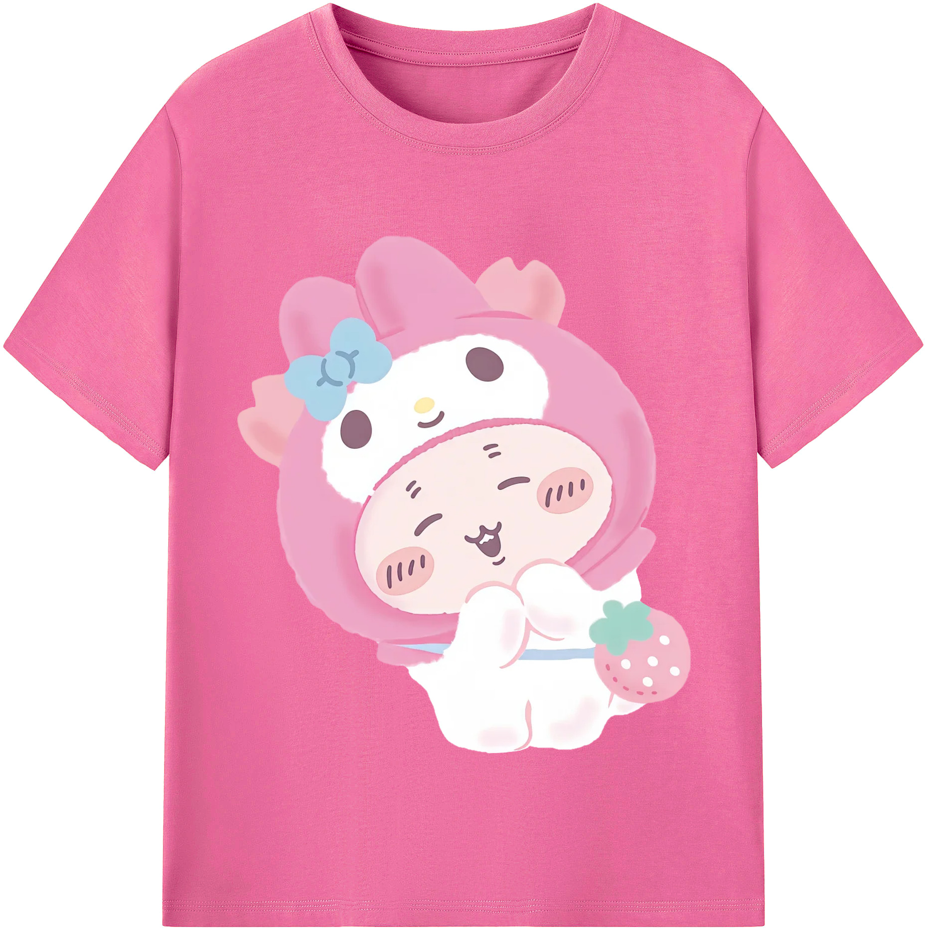 マイメロディ&ちいかわ - レディースカジュアルプリントTシャツ ・ 綿100% ・ クルーネック ・ フロントプリント ・ 柔らかく快適 ・ フィットネス カジュアル 旅行用