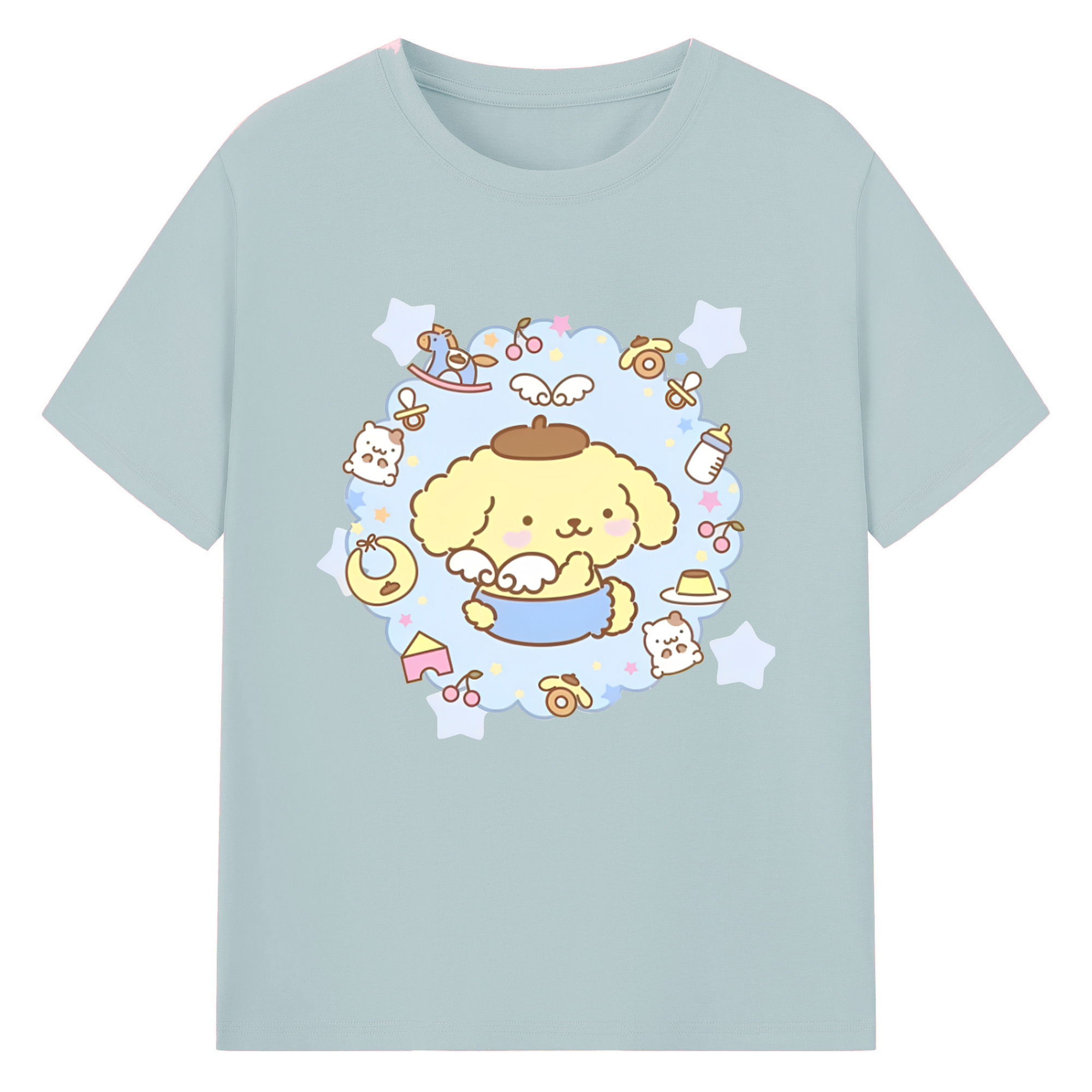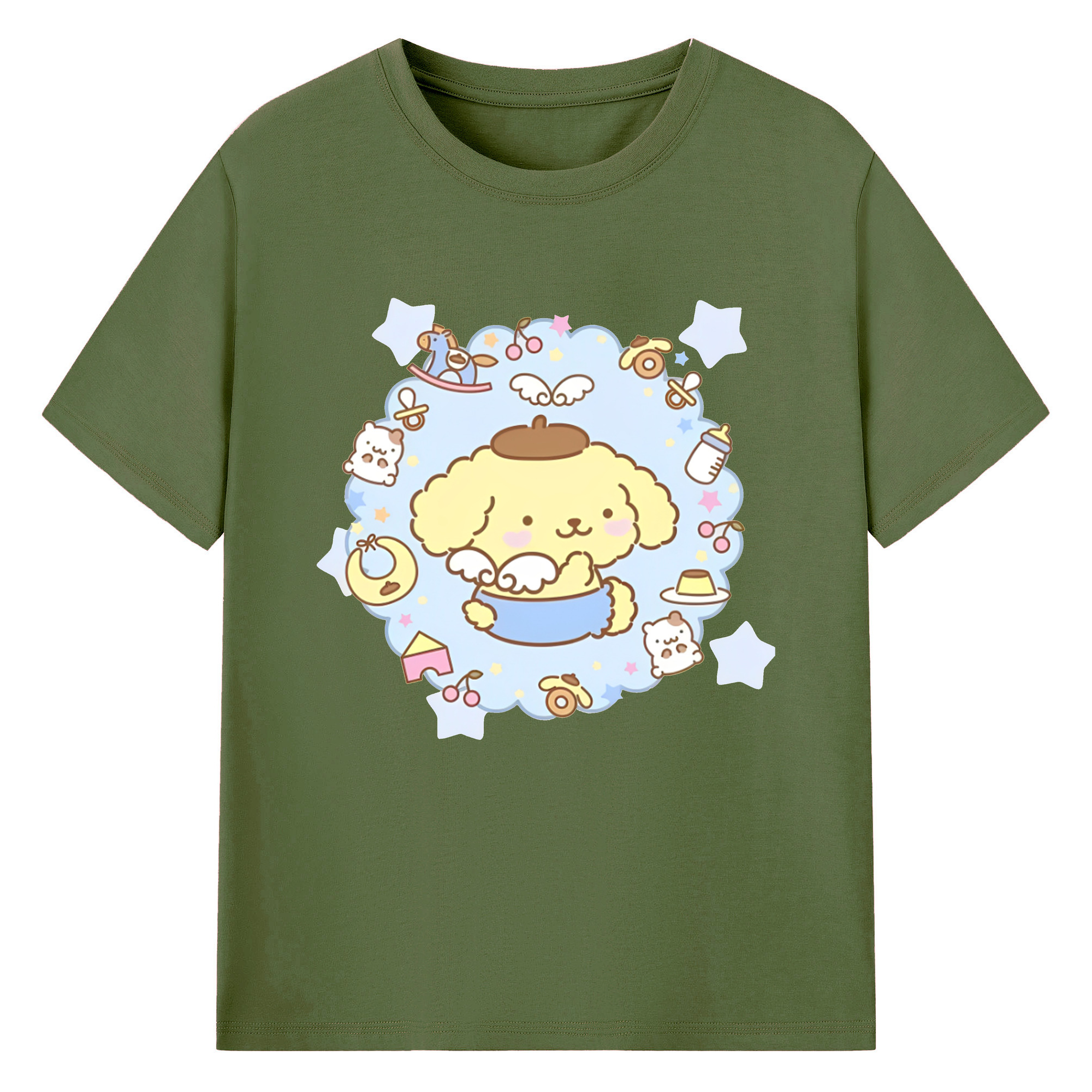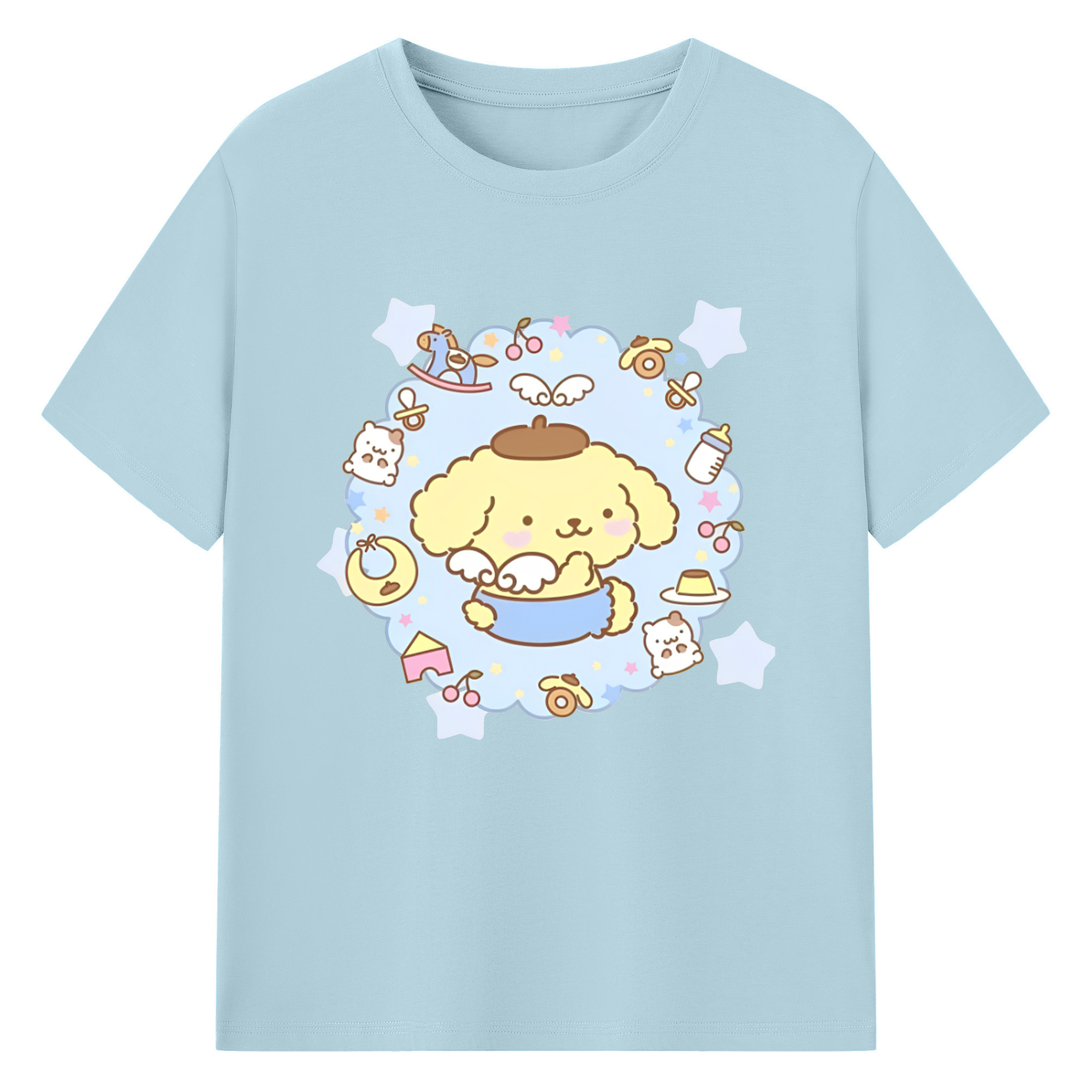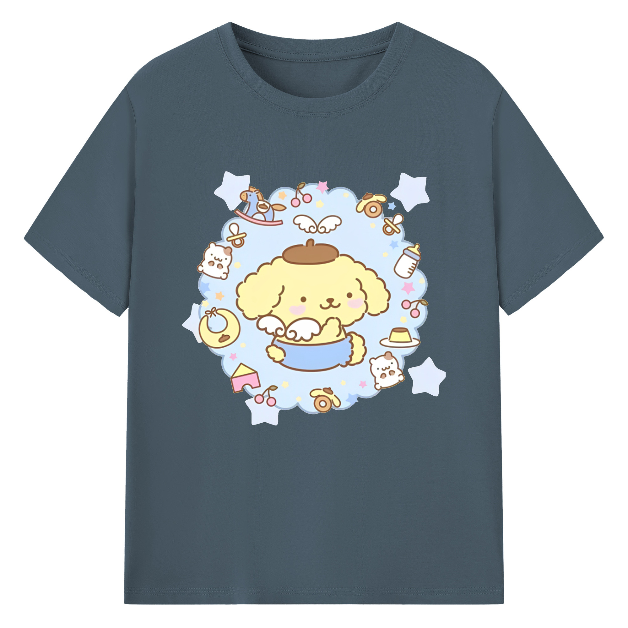 ユニークなデザインのポムポムプリン - 綿100% ヴィンテージ風 半袖Tシャツ ・ フロントプリント ・ 柔らか肌触り ・ 通気性 快適 ・ スポーツ カジュアル 外出用