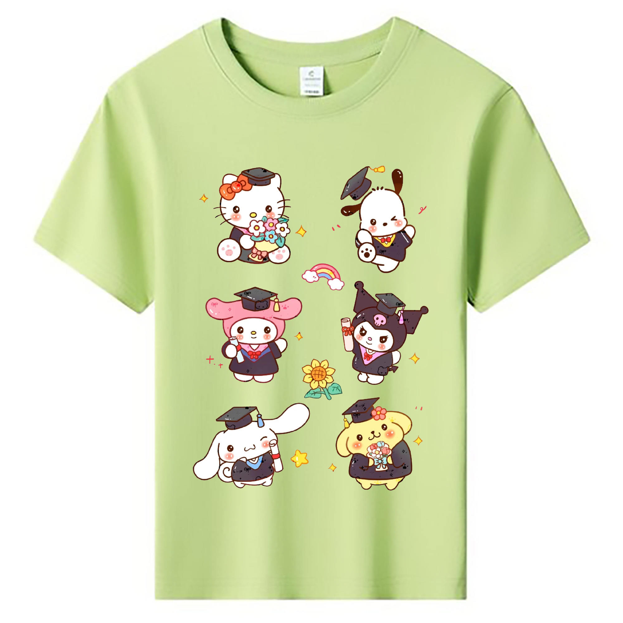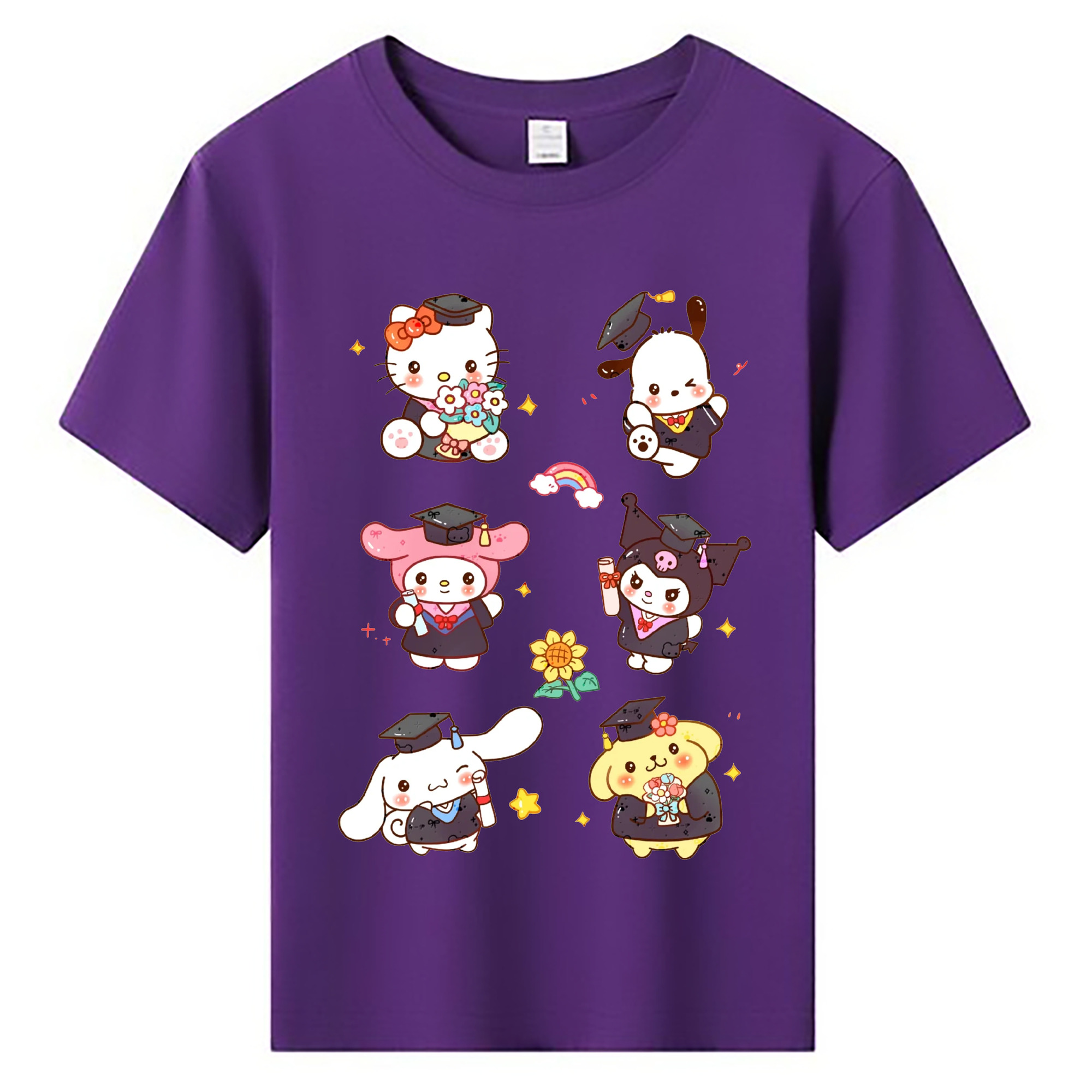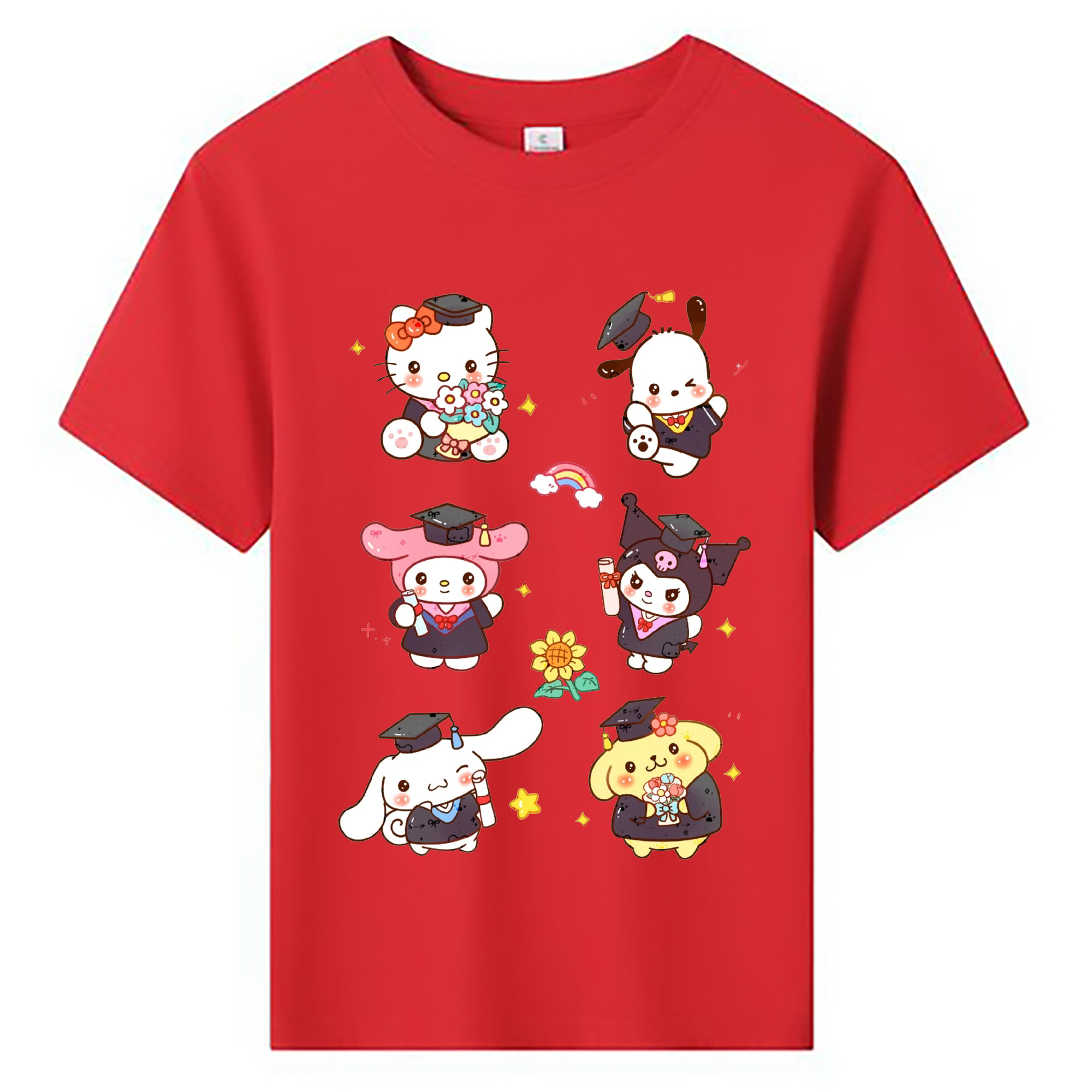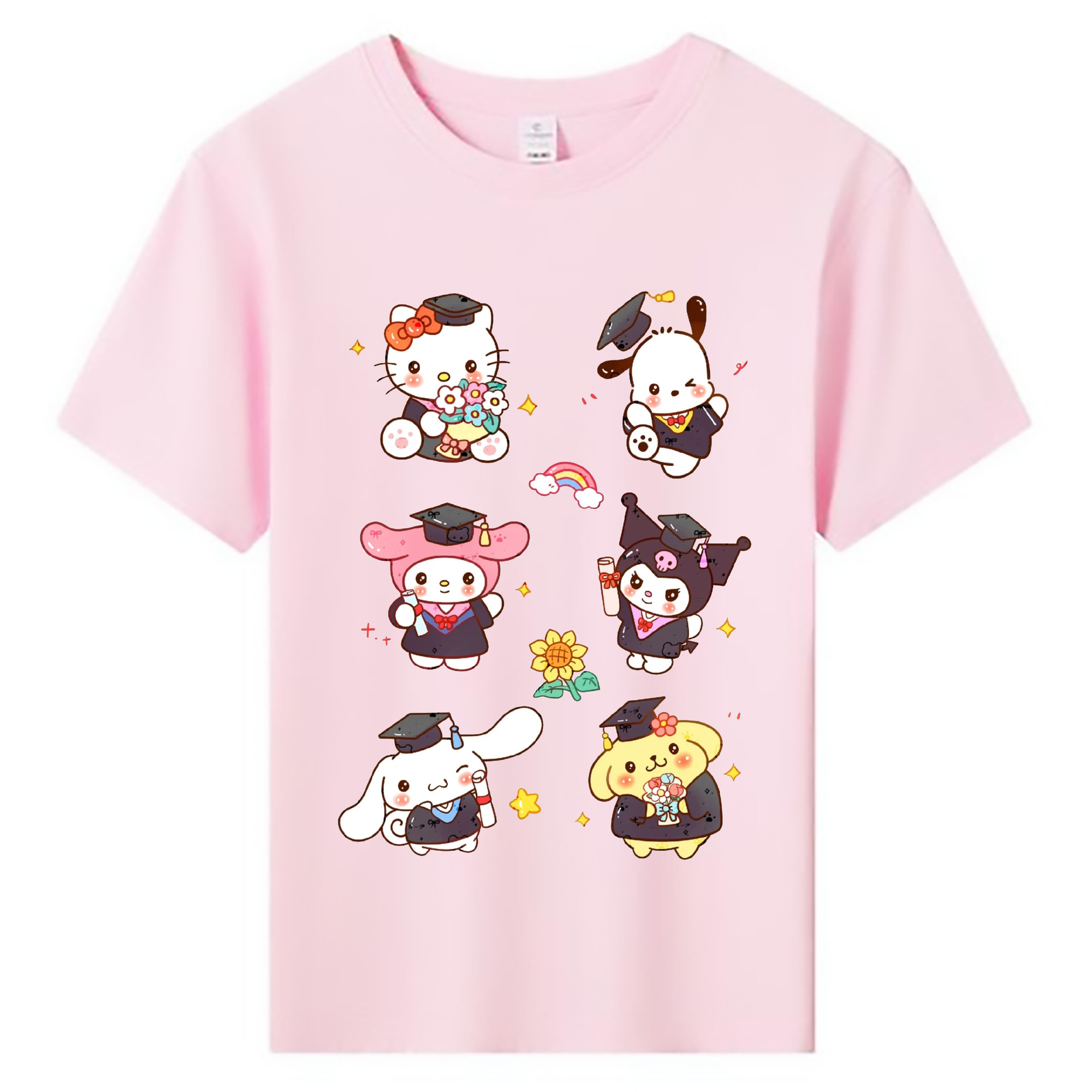 卒業シーズン×サンリオ - 綿100% ヴィンテージ風 半袖Tシャツ ・ フロントプリント ・ 柔らか肌触り ・ 通気性 快適 ・ スポーツ カジュアル 外出用
