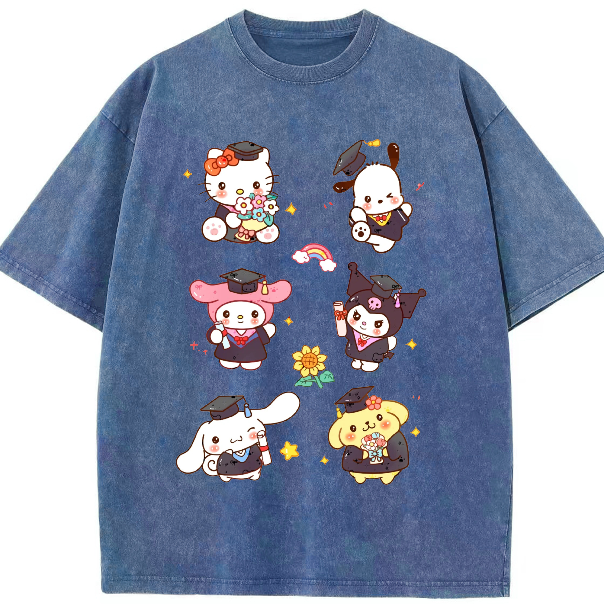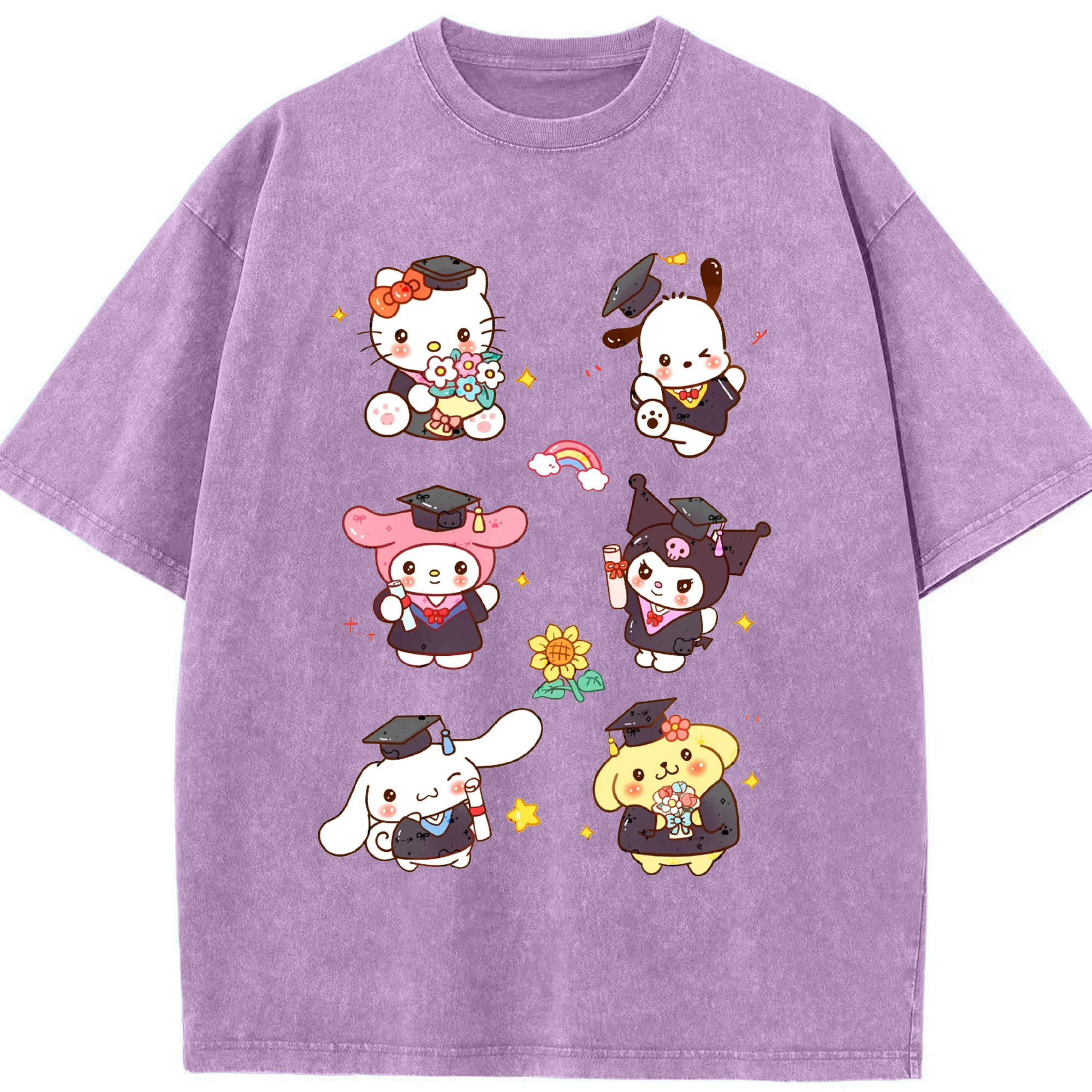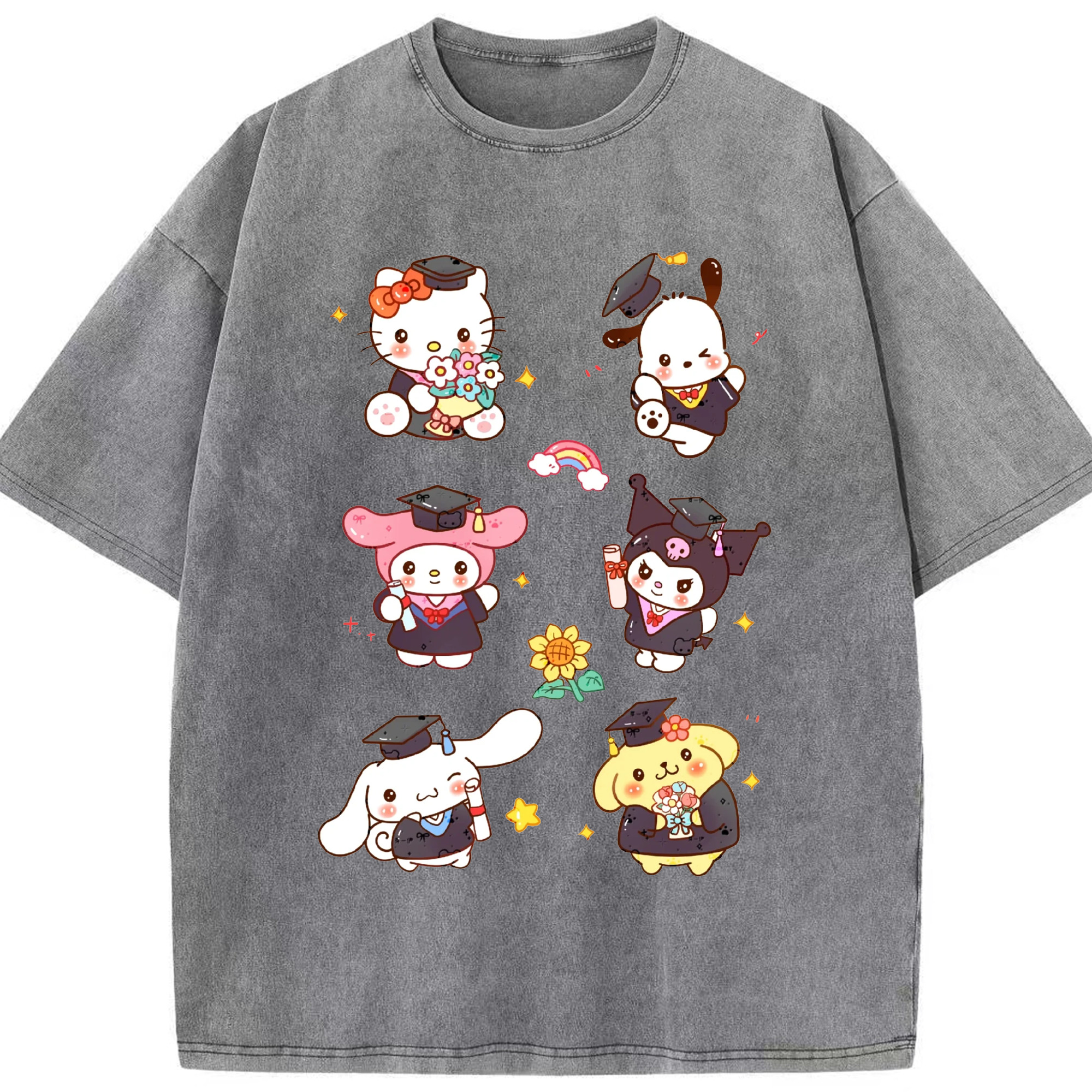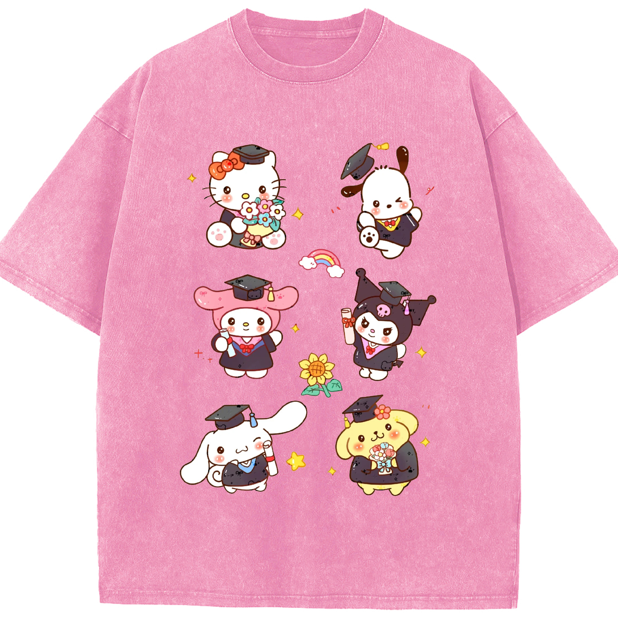 卒業シーズン×サンリオ - 綿100% ヴィンテージ風 半袖Tシャツ ・ 背面プリント ・ 柔らか肌触り ・ 通気性 快適 ・ スポーツ カジュアル 外出用