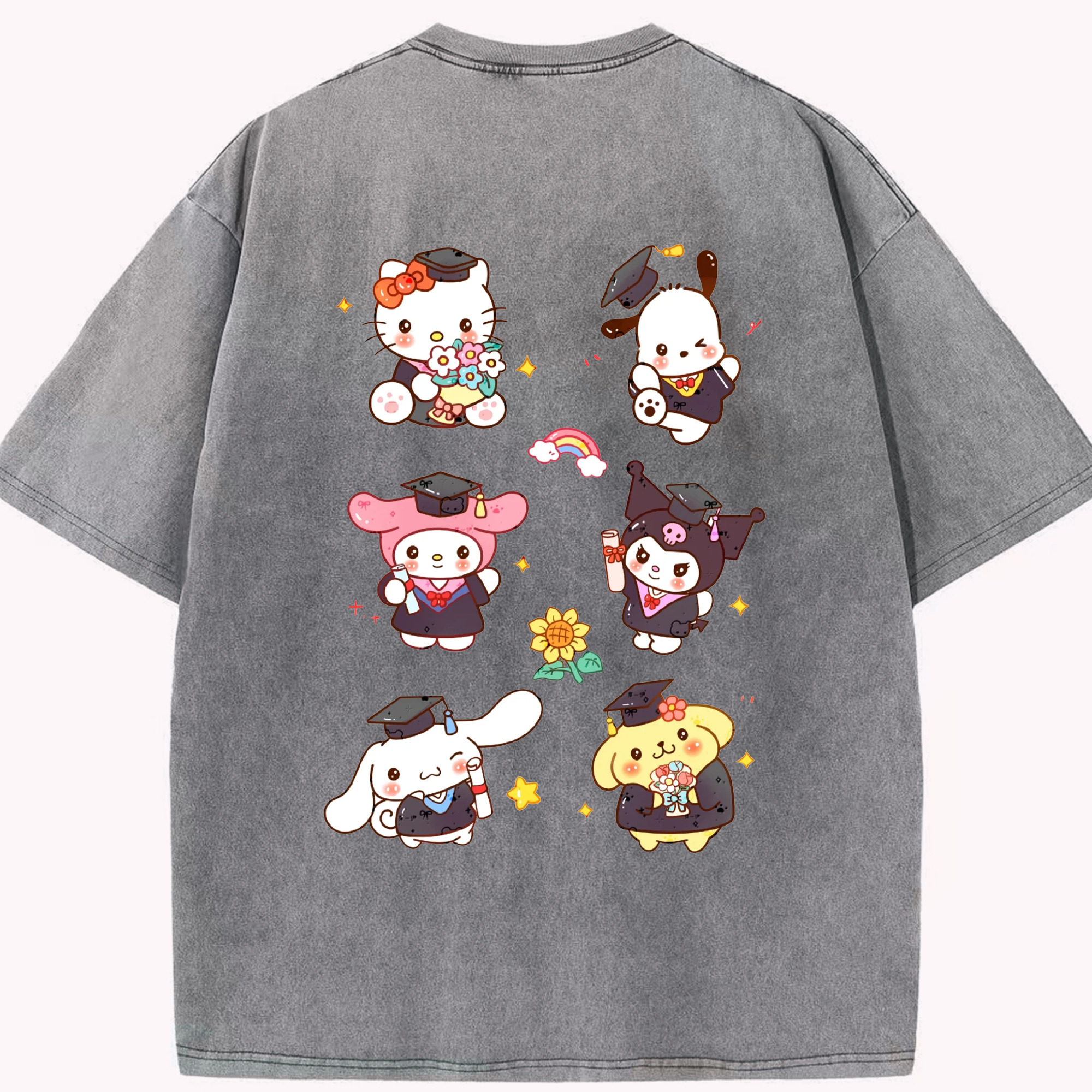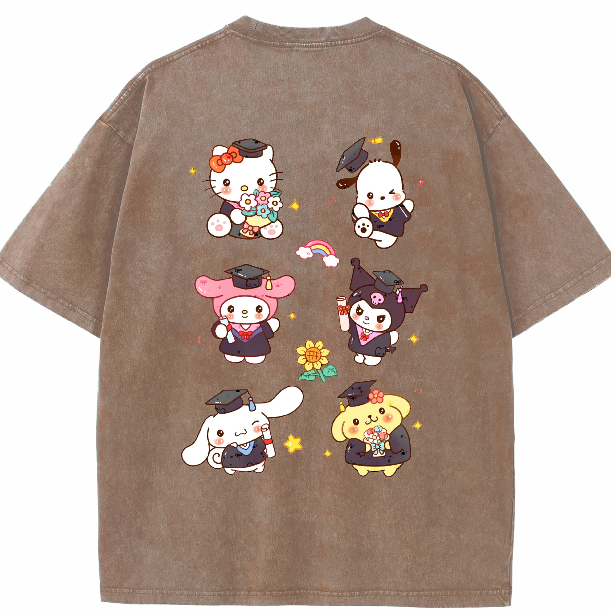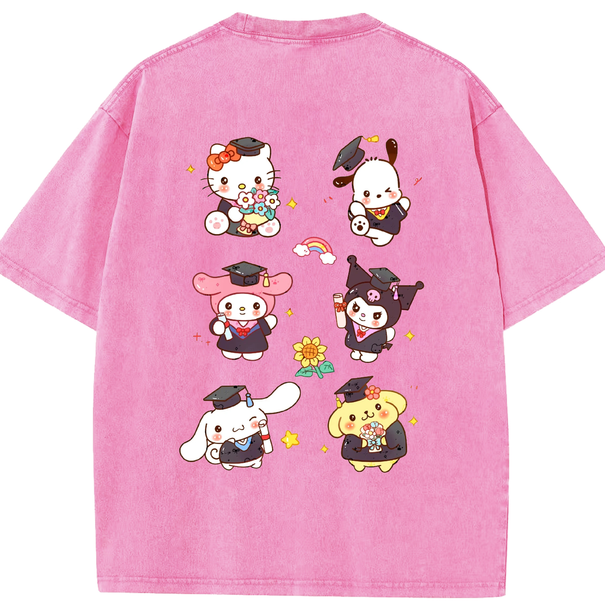 卒業シーズン×サンリオ - 綿100% ヴィンテージ風 半袖Tシャツ ・ フロントプリント ・ 柔らか肌触り ・ 通気性 快適 ・ スポーツ カジュアル 外出用