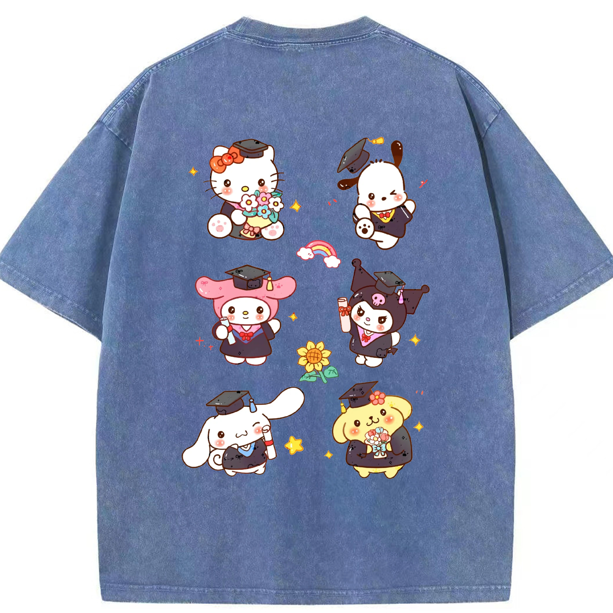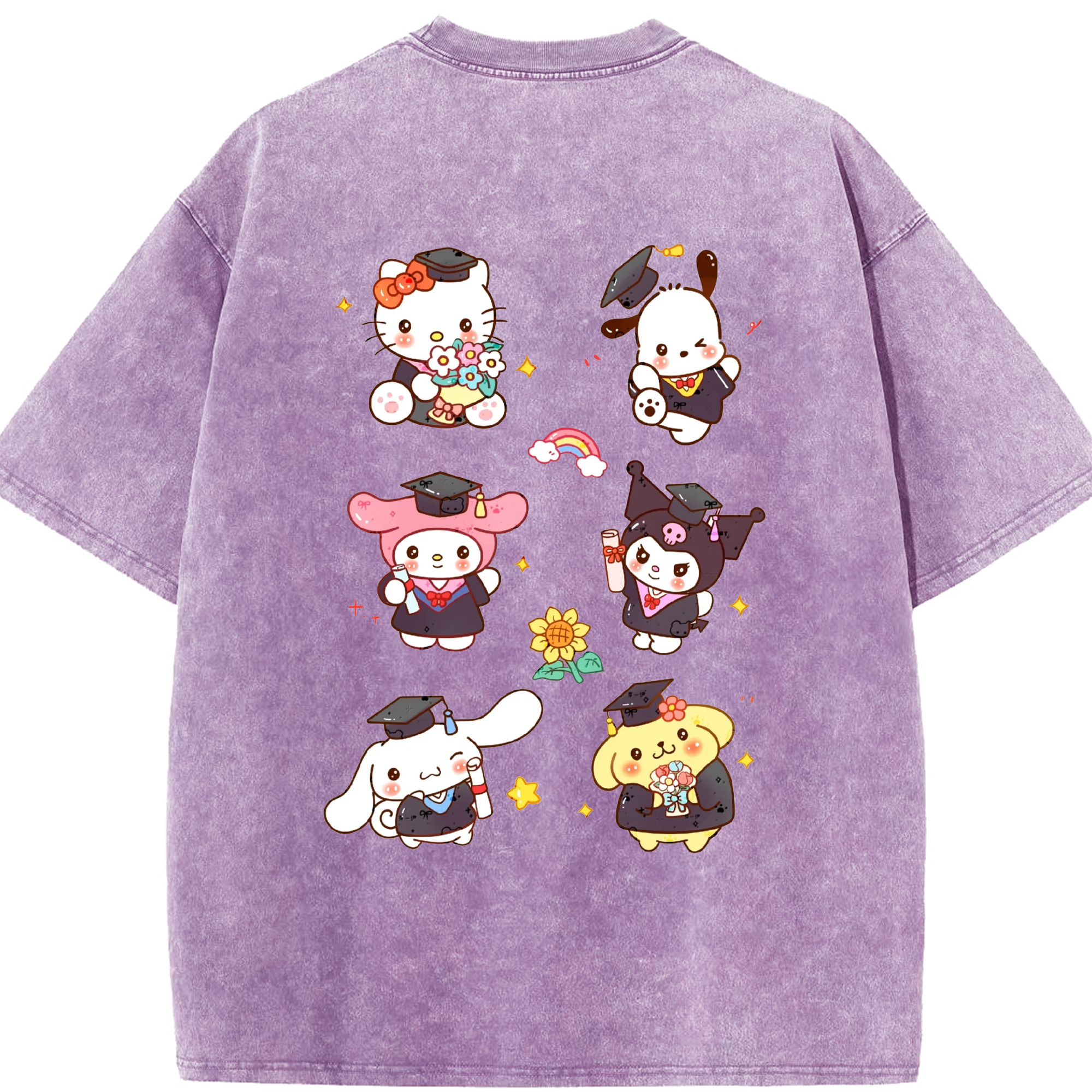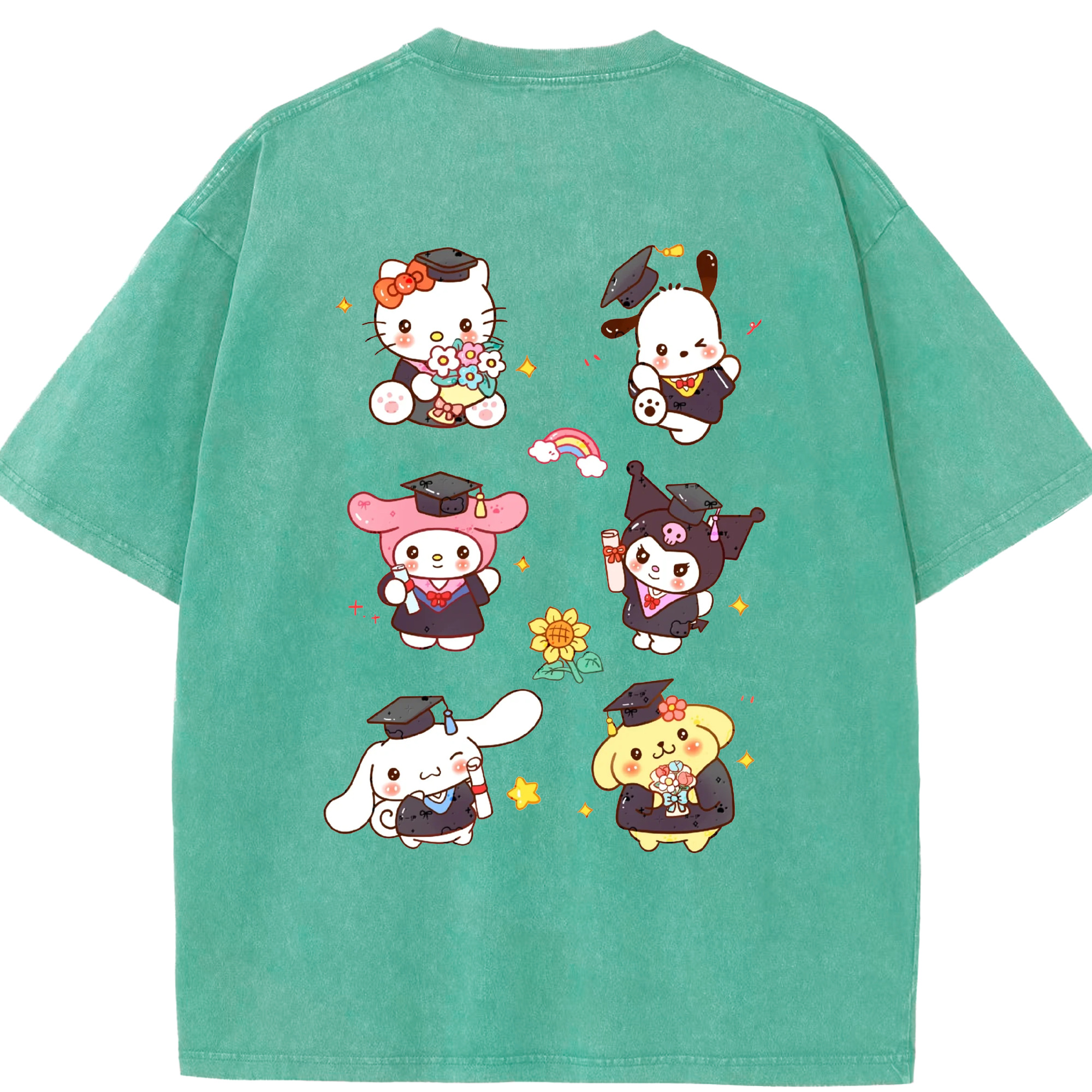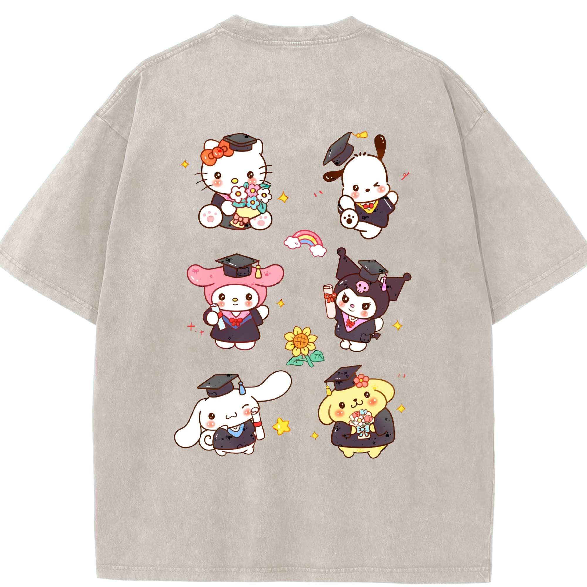 卒業シーズン×サンリオ - 綿100% ヴィンテージ風 半袖Tシャツ ・ フロントプリント ・ 柔らか肌触り ・ 通気性 快適 ・ スポーツ カジュアル 外出用