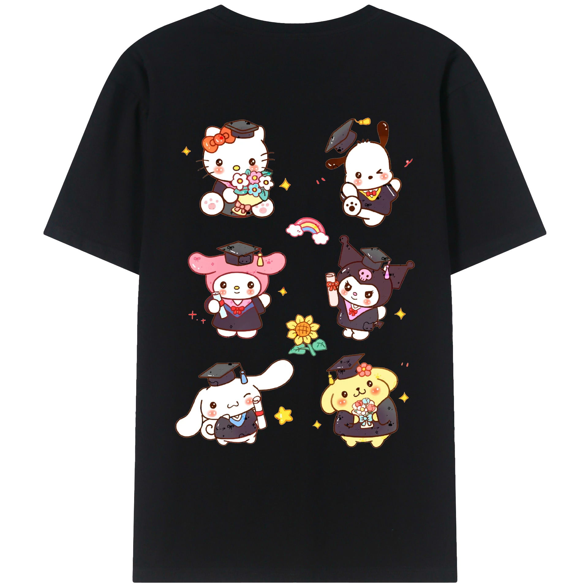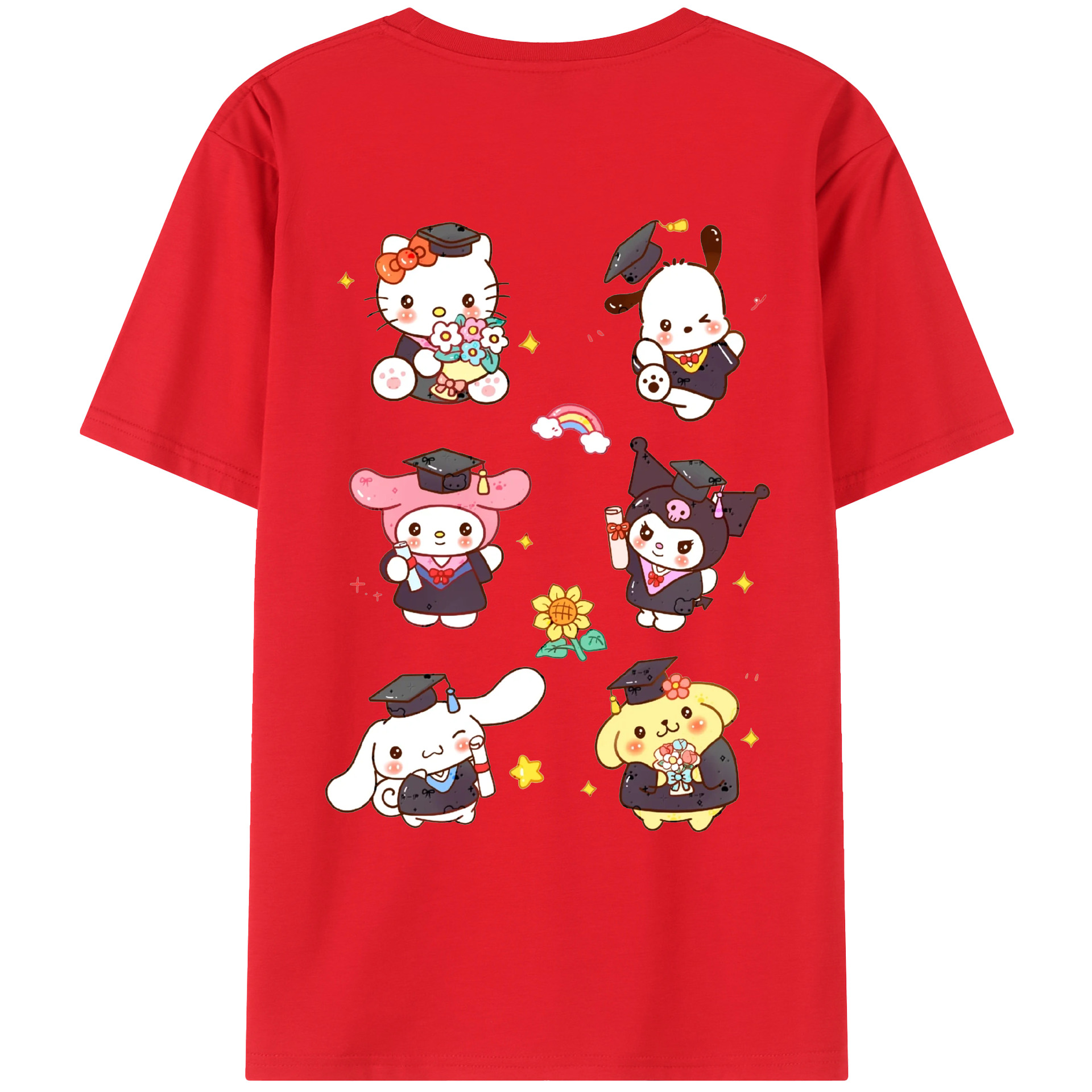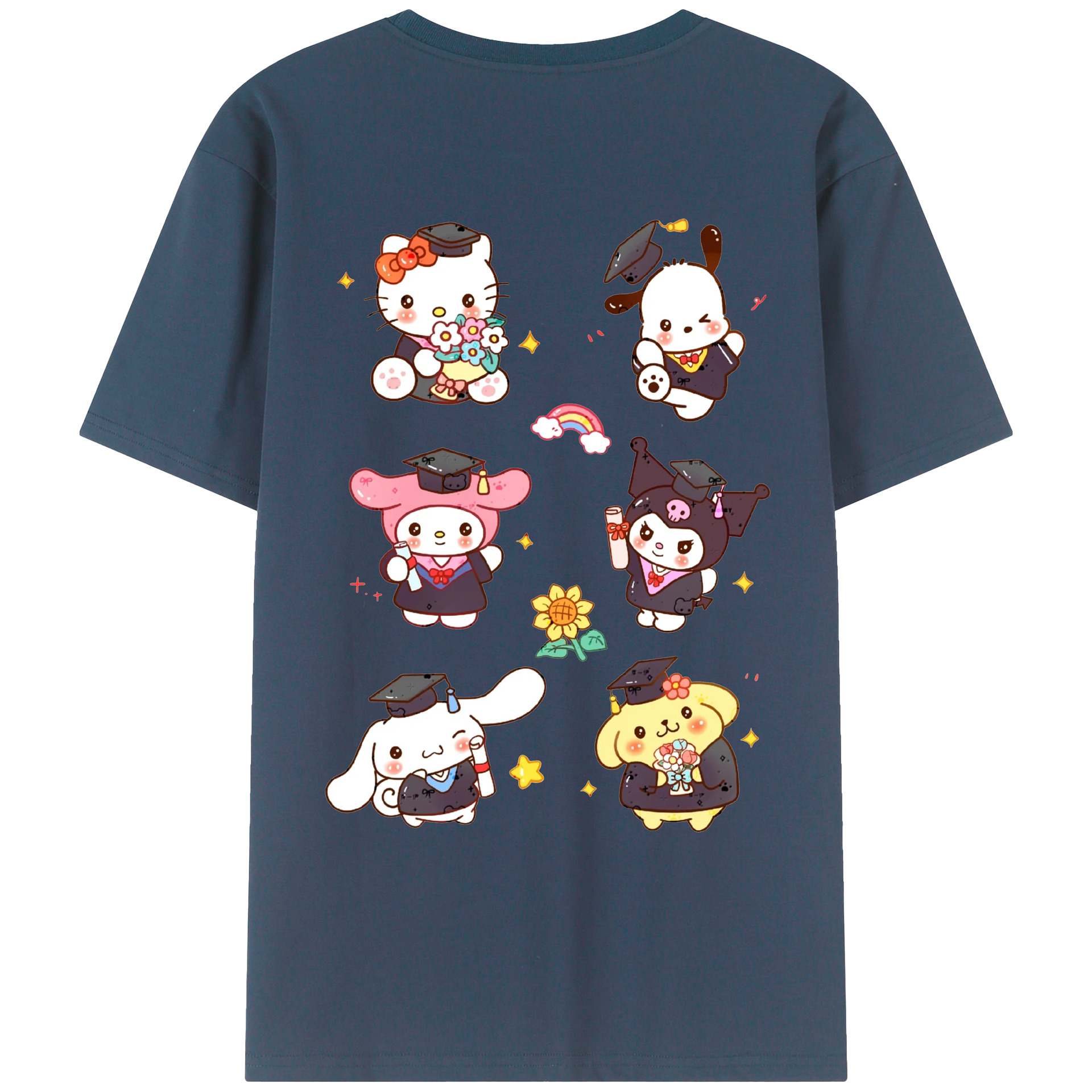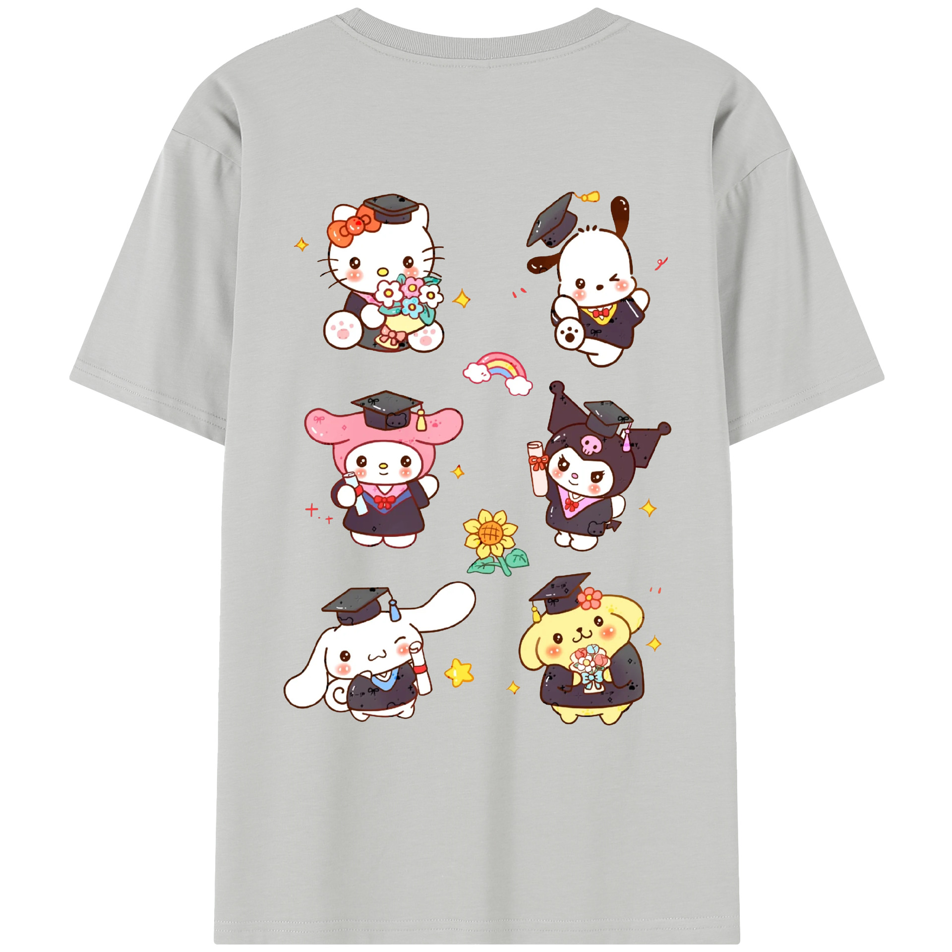 卒業シーズン×サンリオ - 綿100% ヴィンテージ風 半袖Tシャツ ・ 背面プリント ・ 柔らか肌触り ・ 通気性 快適 ・ スポーツ カジュアル 外出用