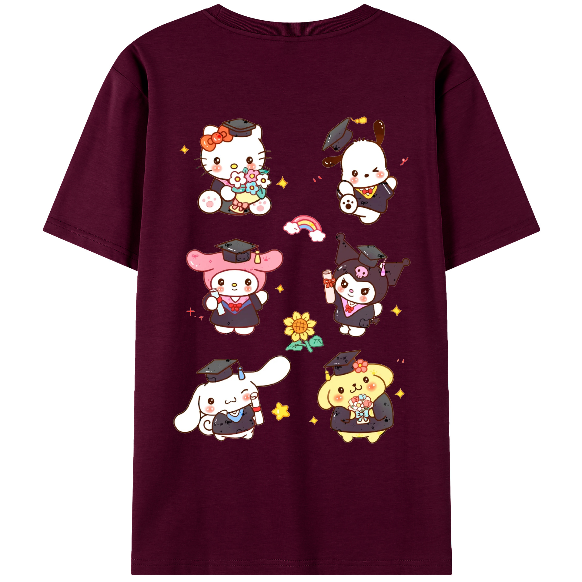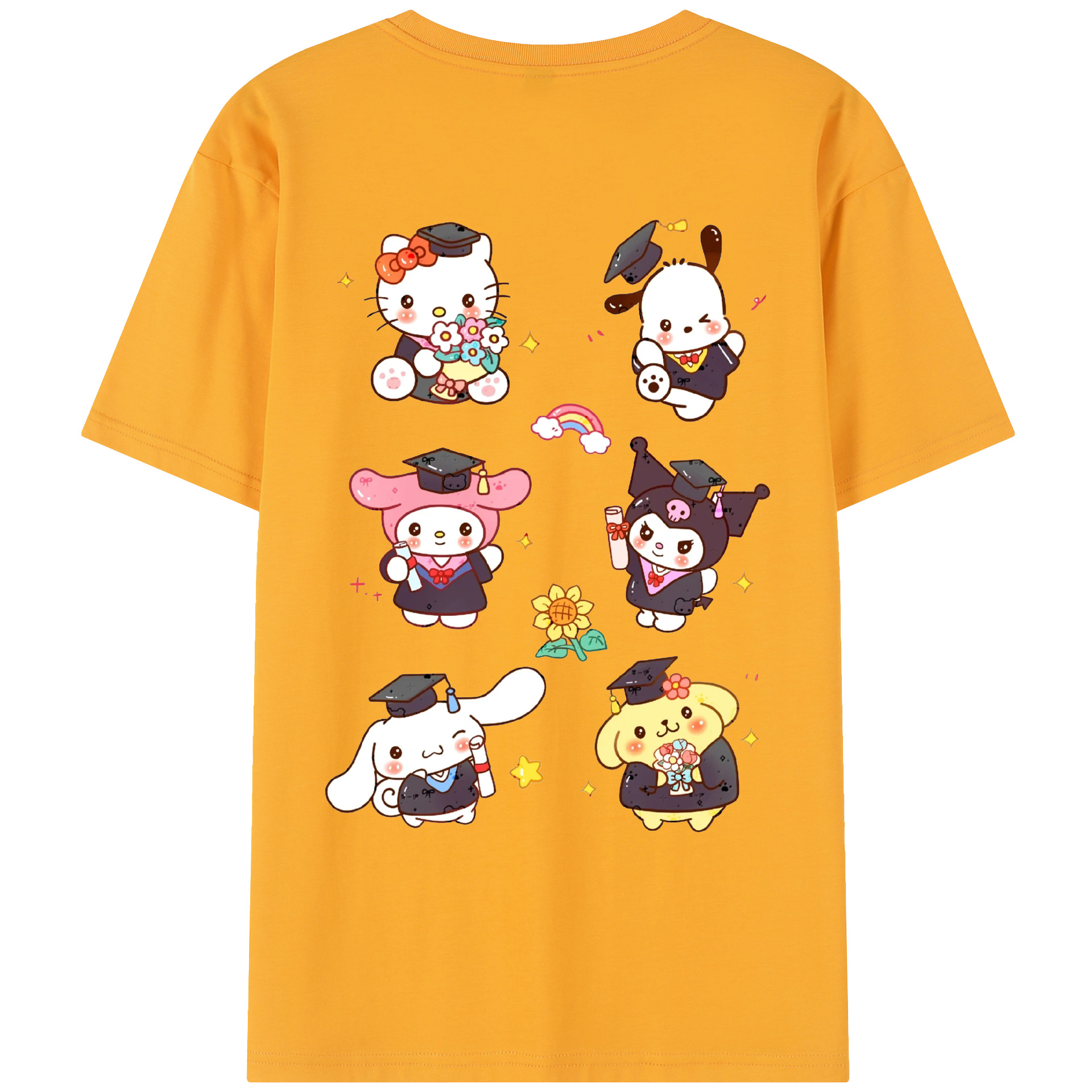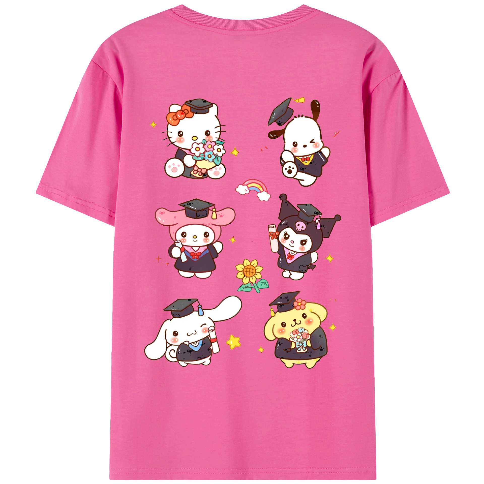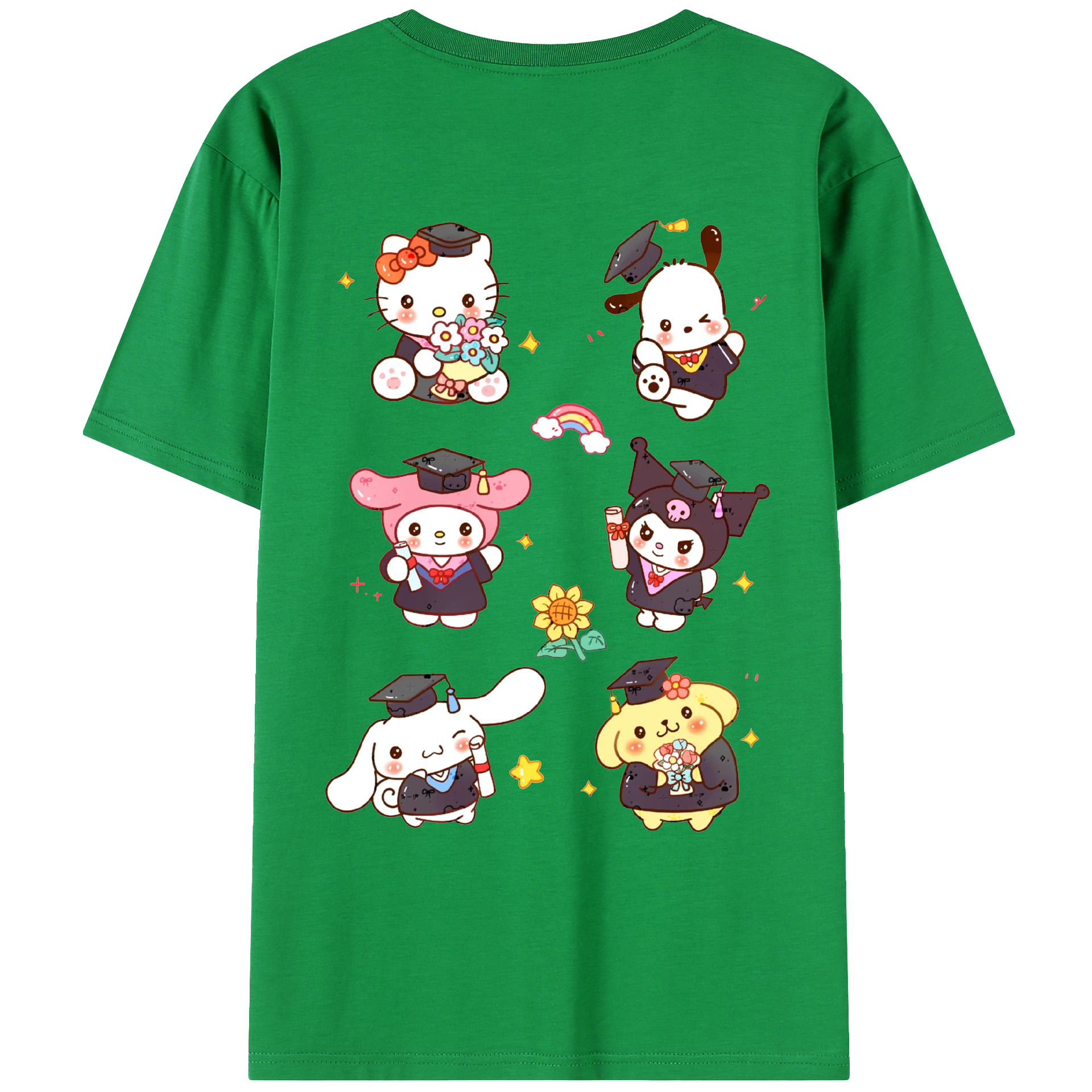 卒業シーズン×サンリオ - 綿100% ヴィンテージ風 半袖Tシャツ ・ 背面プリント ・ 柔らか肌触り ・ 通気性 快適 ・ スポーツ カジュアル 外出用