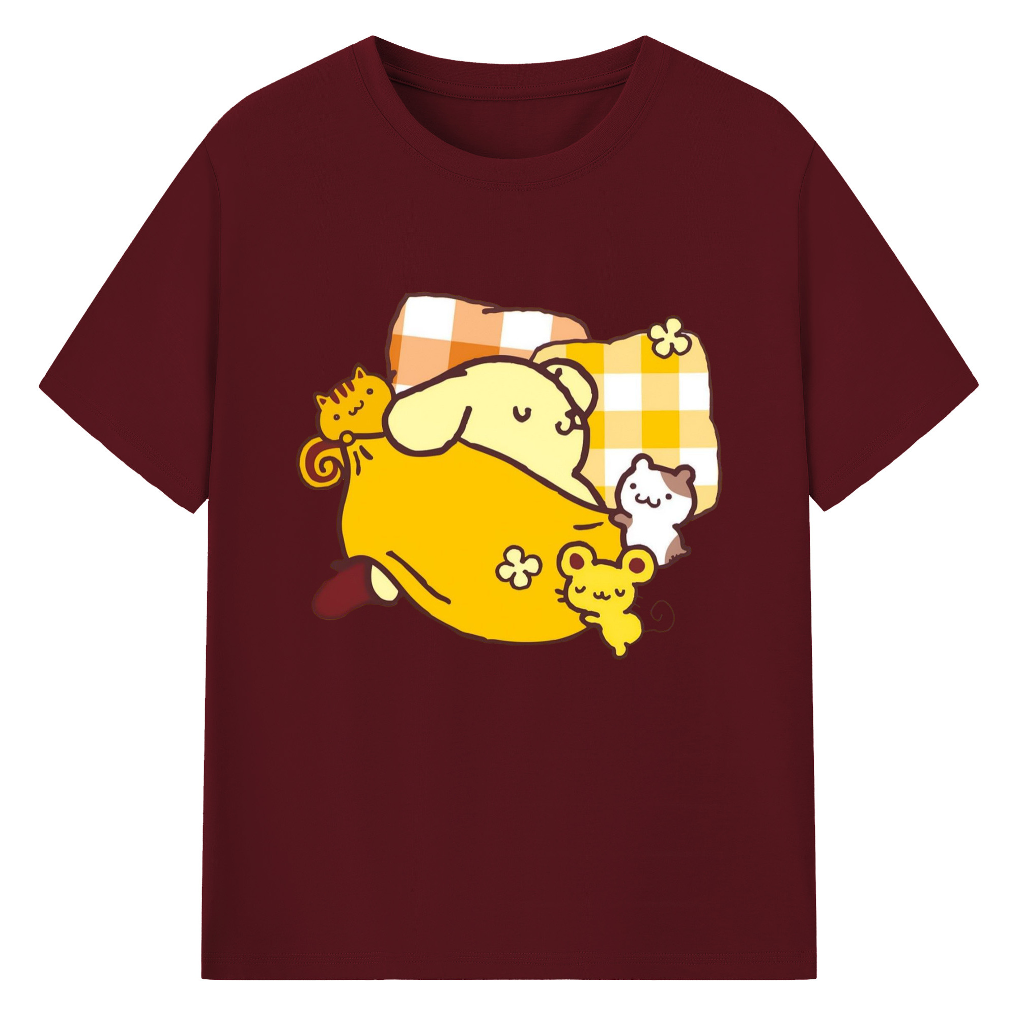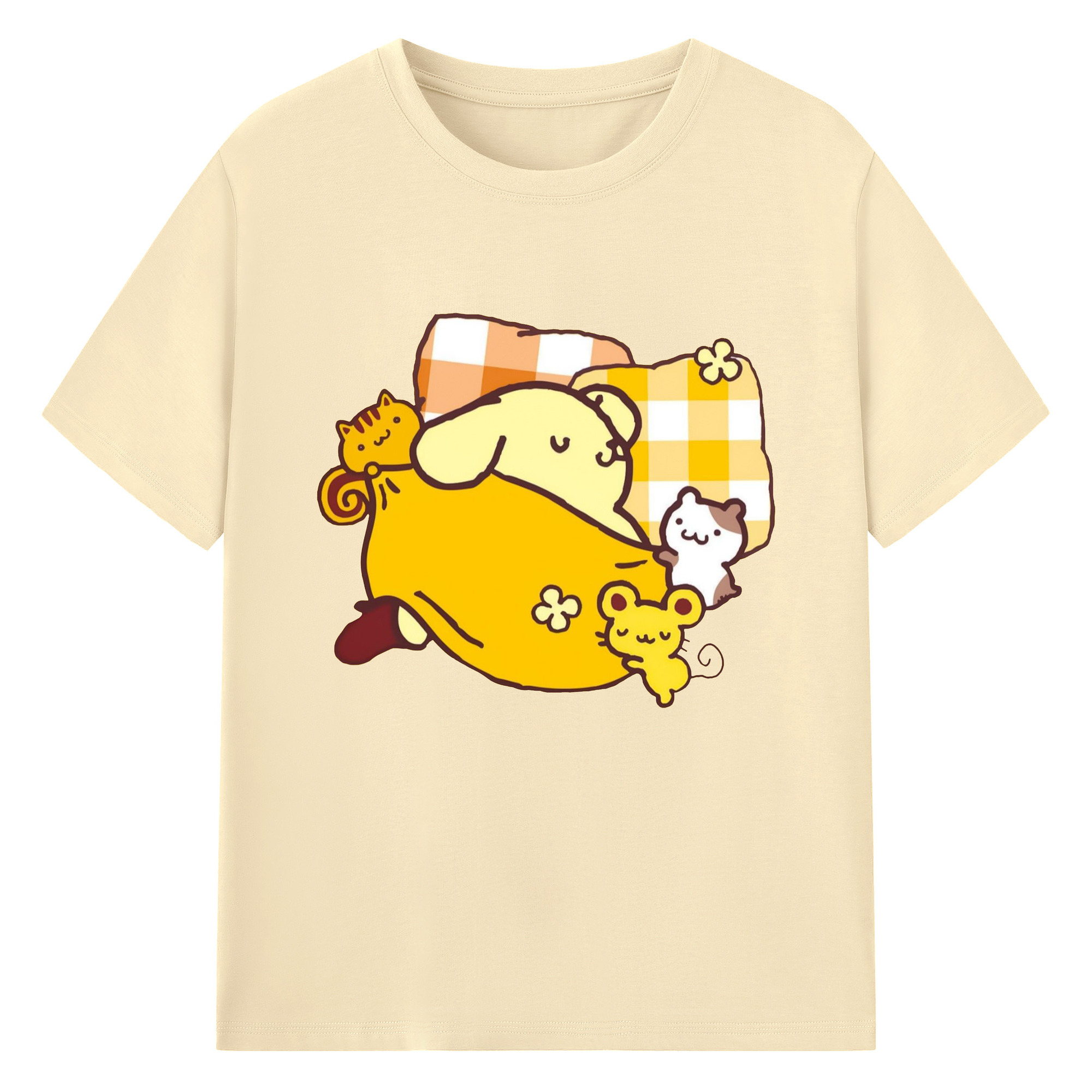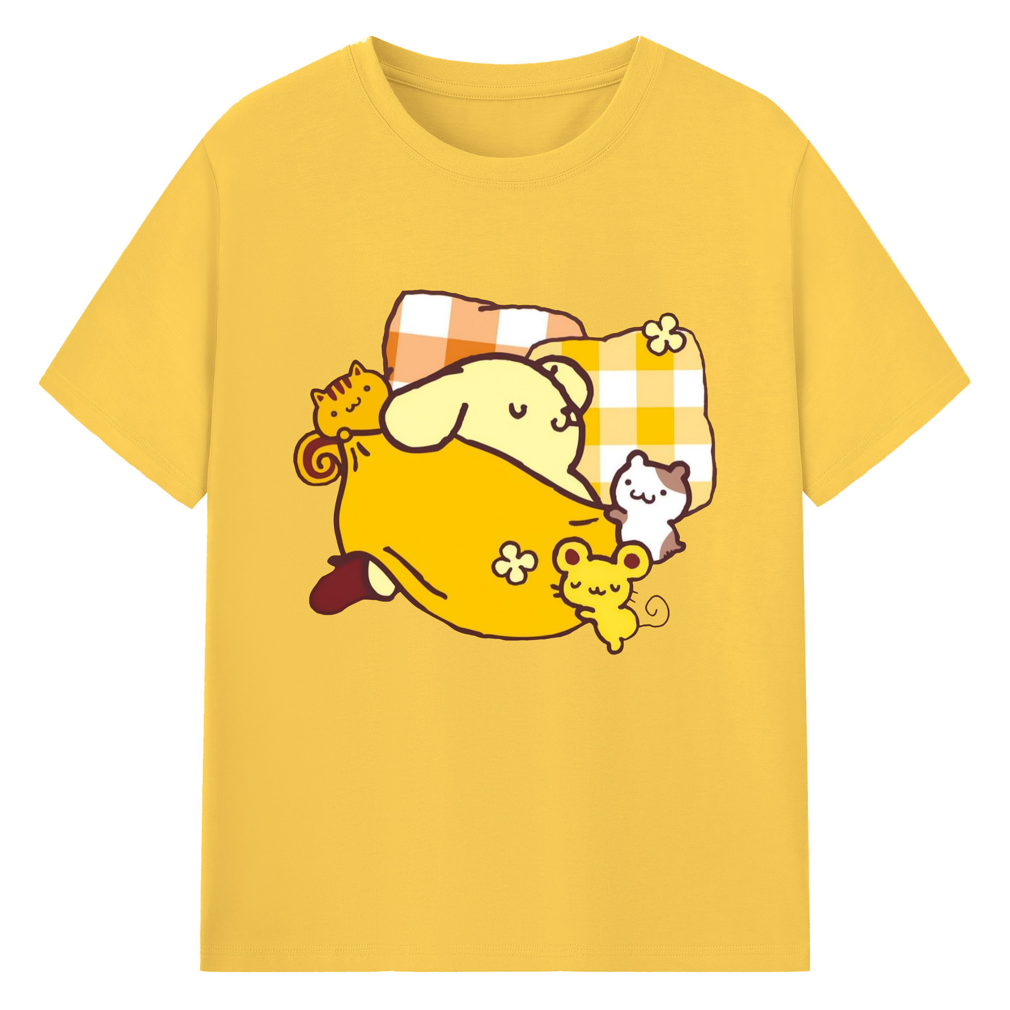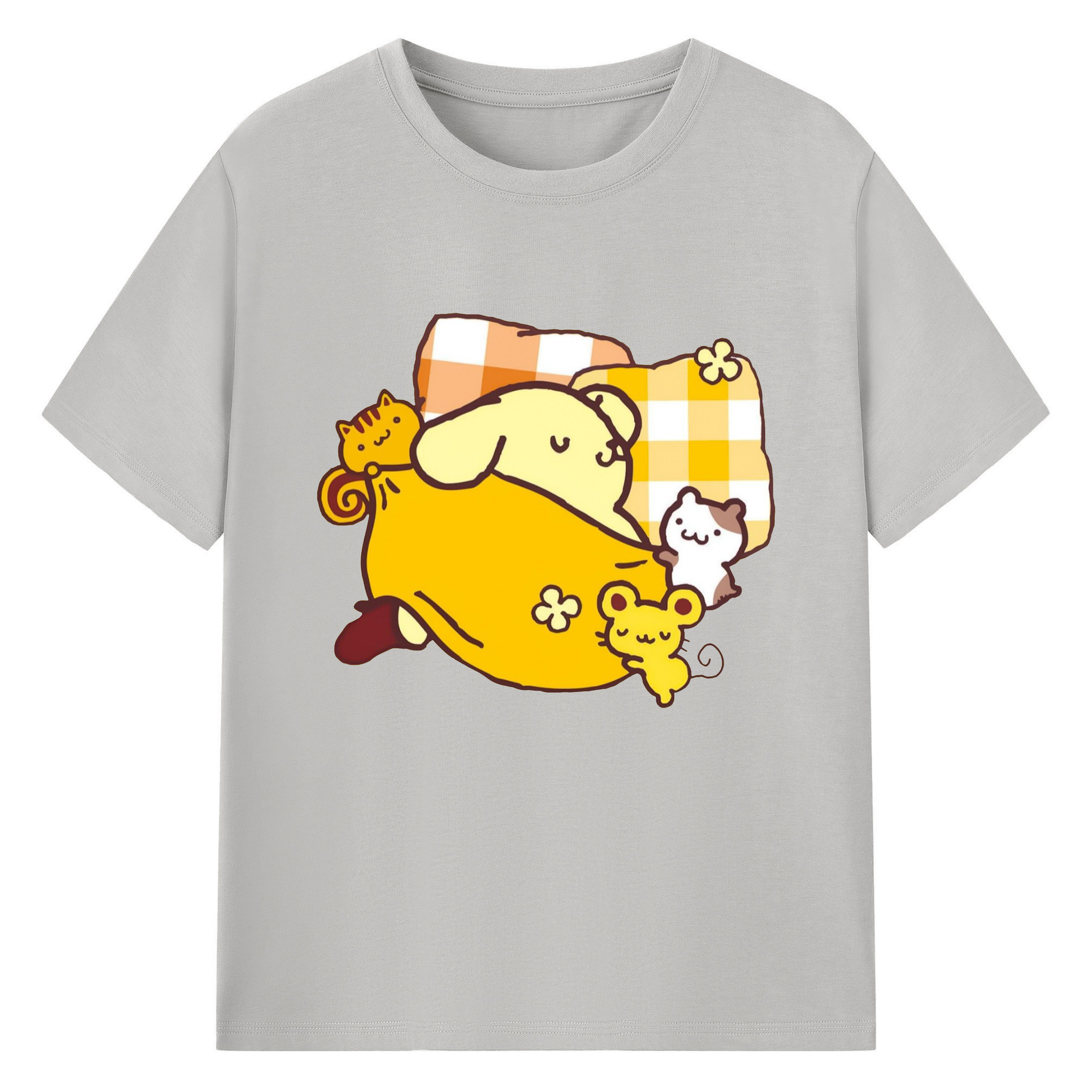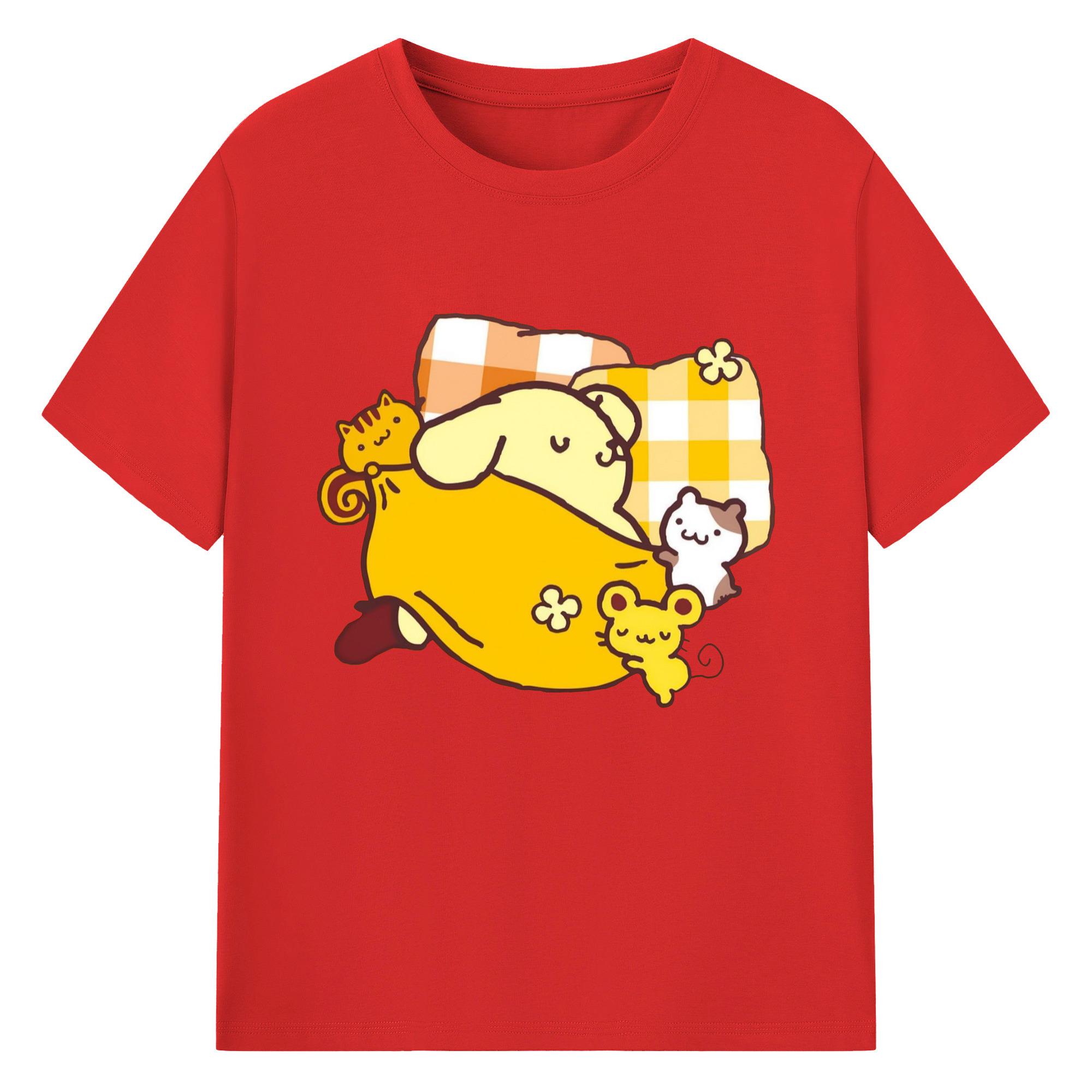 ユニークなデザインのポムポムプリン - 綿100% 半袖Tシャツ ・ フロントプリント ・ 快適 通気性 ・ 日常使い 散歩 スポーツ用