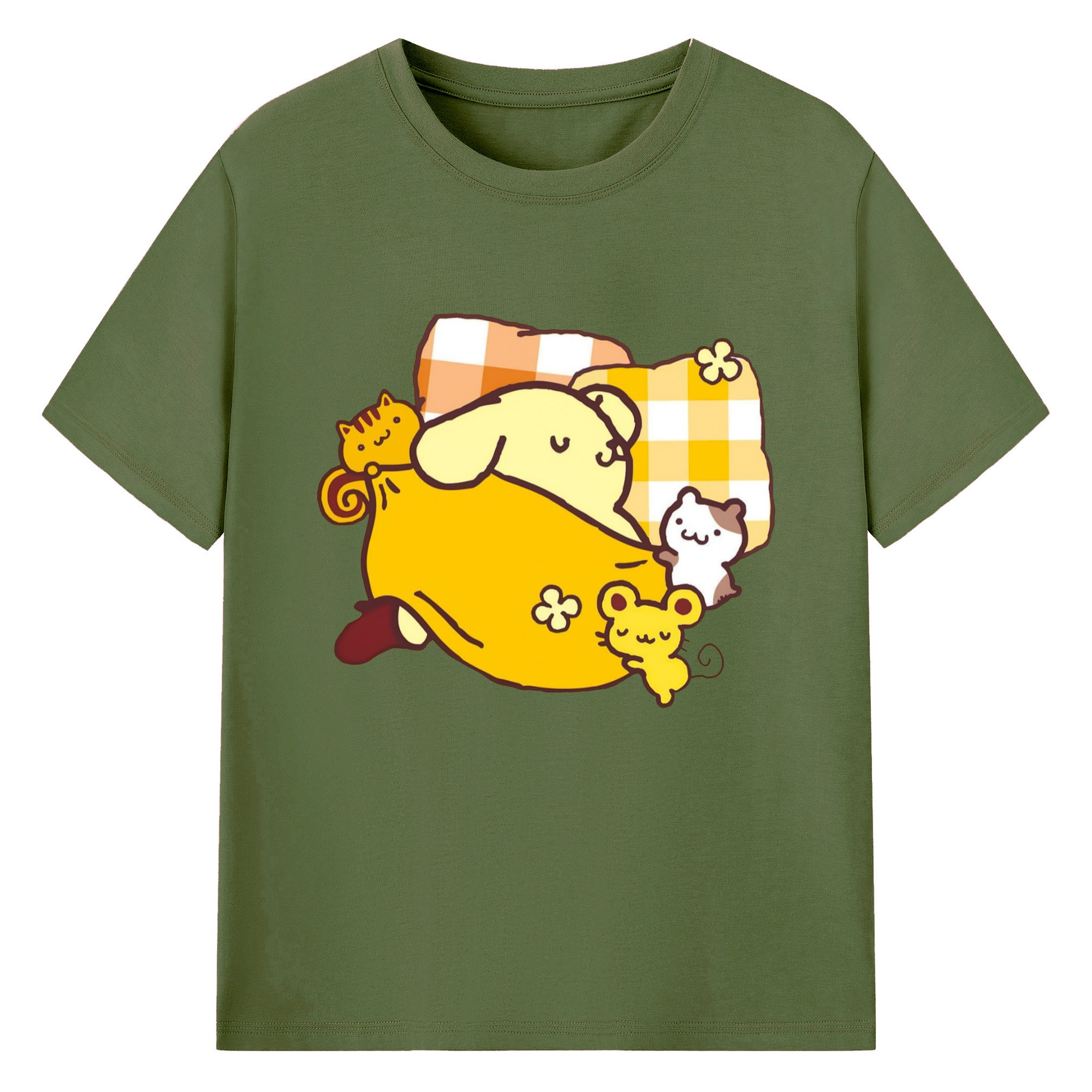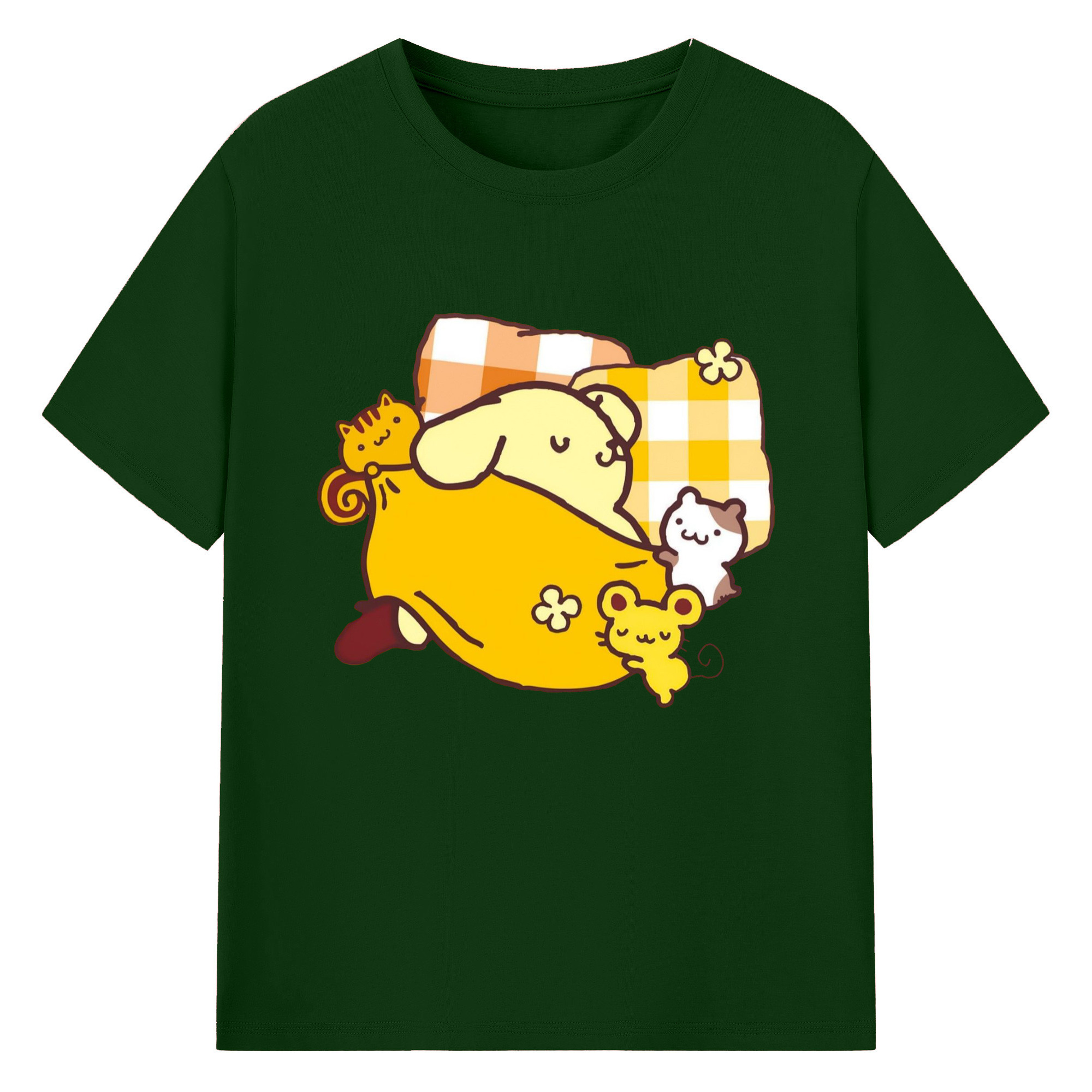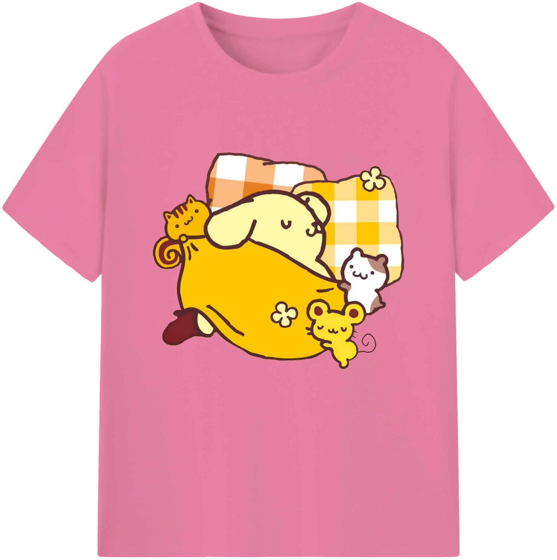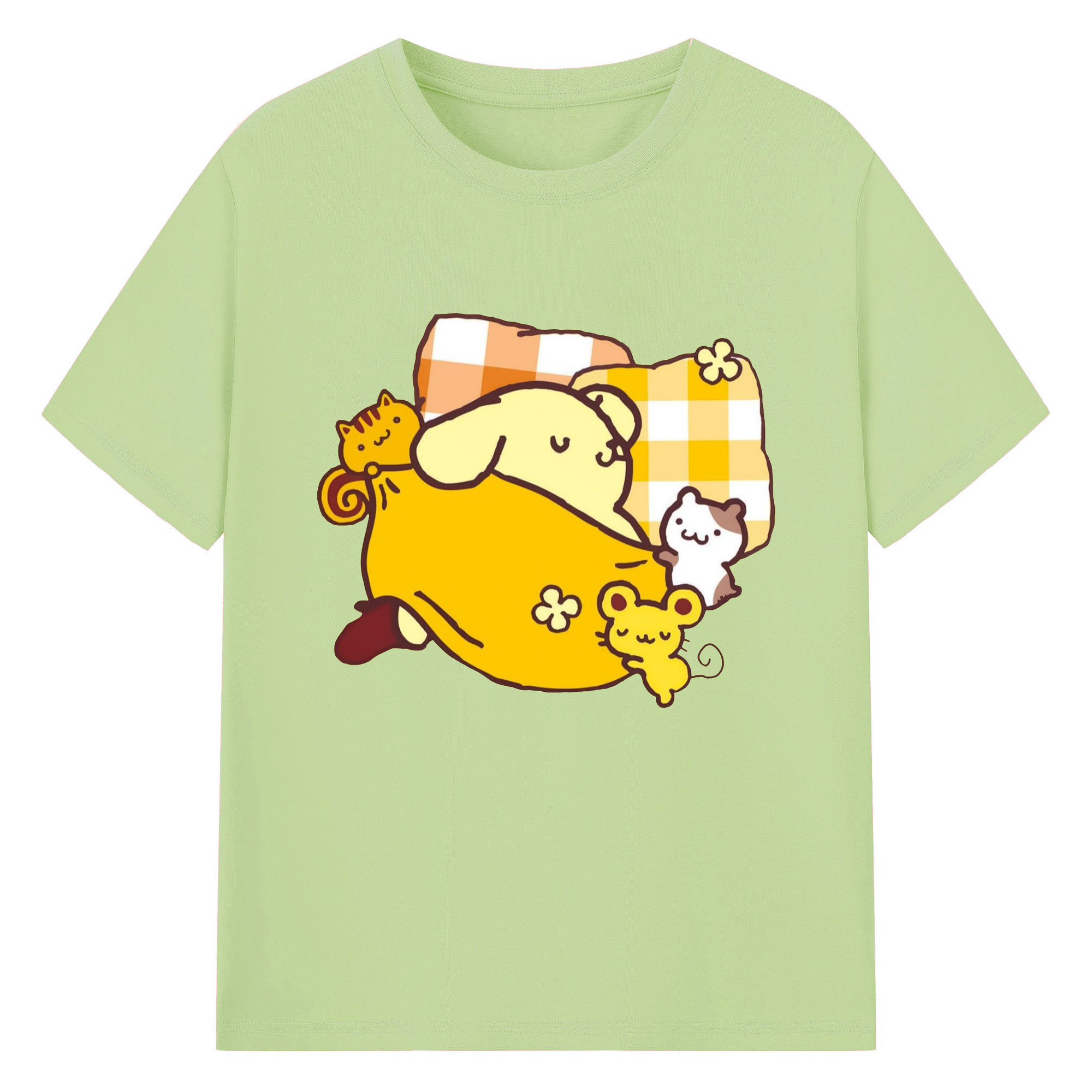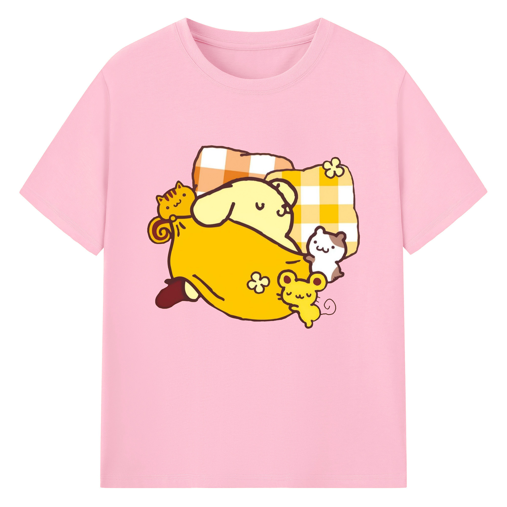 ユニークなデザインのポムポムプリン - 綿100% 半袖Tシャツ ・ フロントプリント ・ 快適 通気性 ・ 日常使い 散歩 スポーツ用