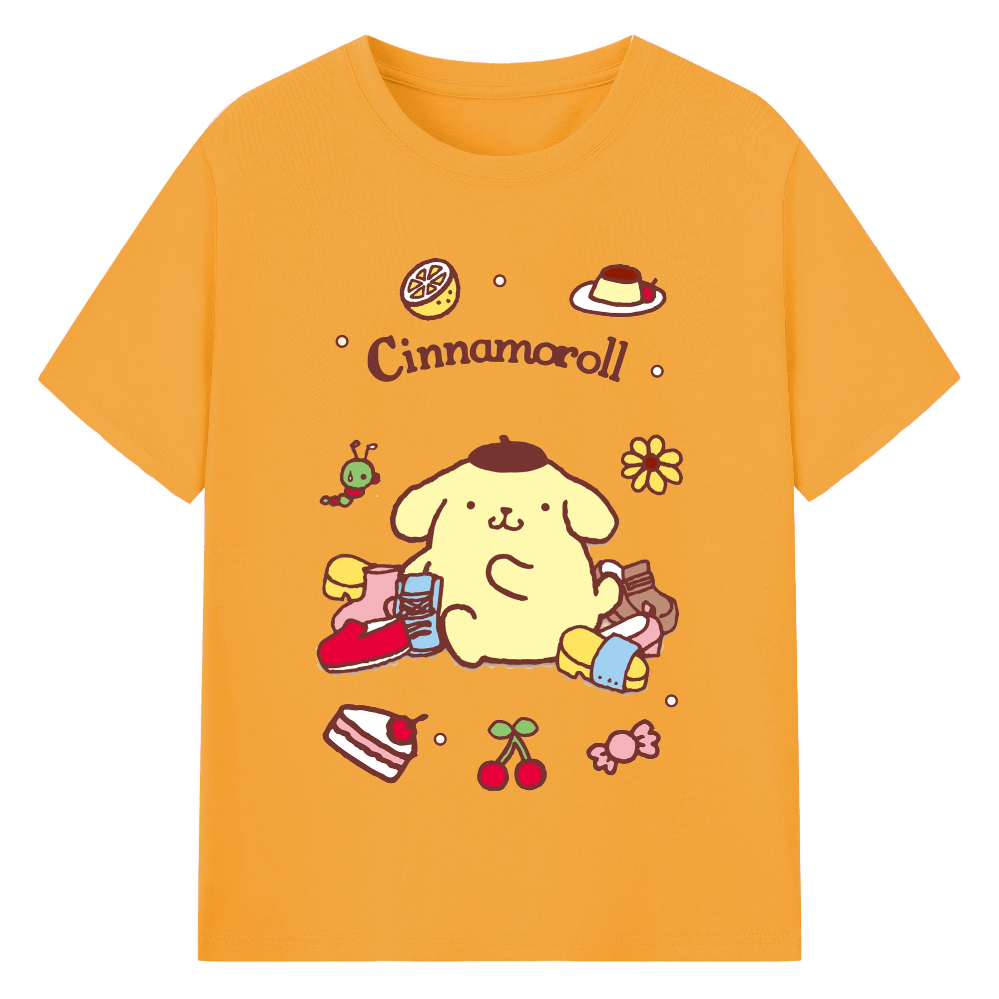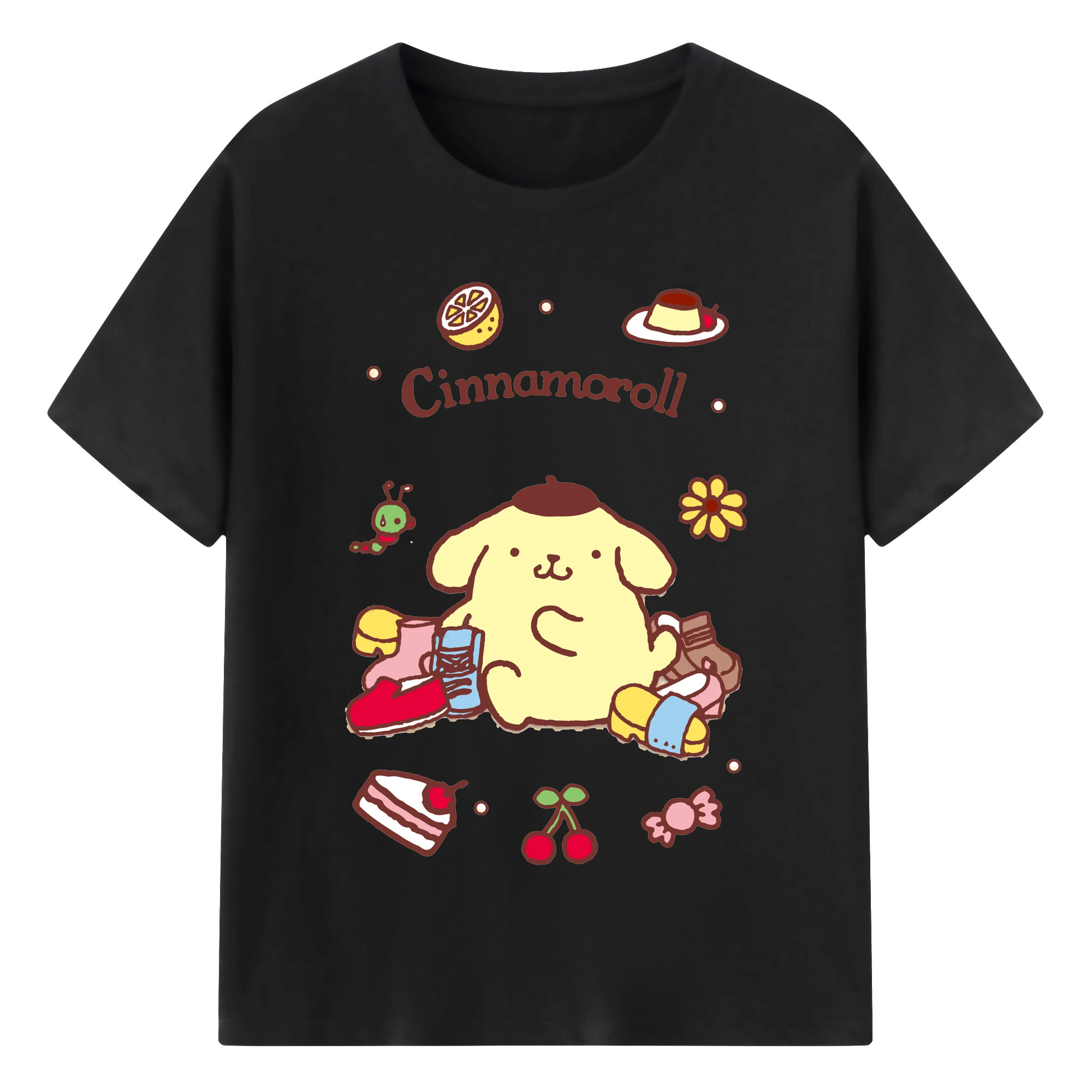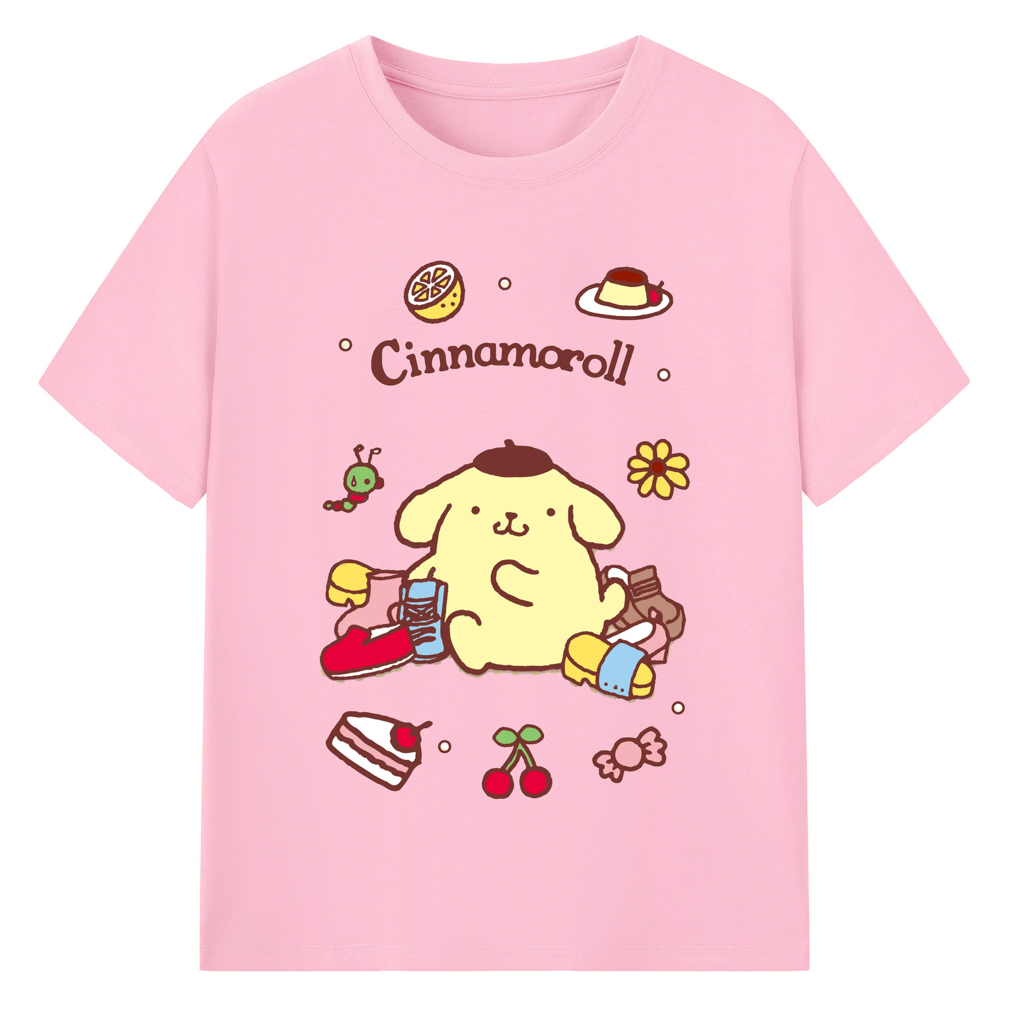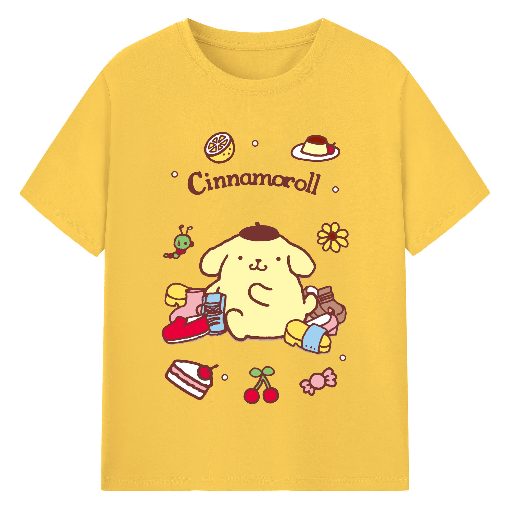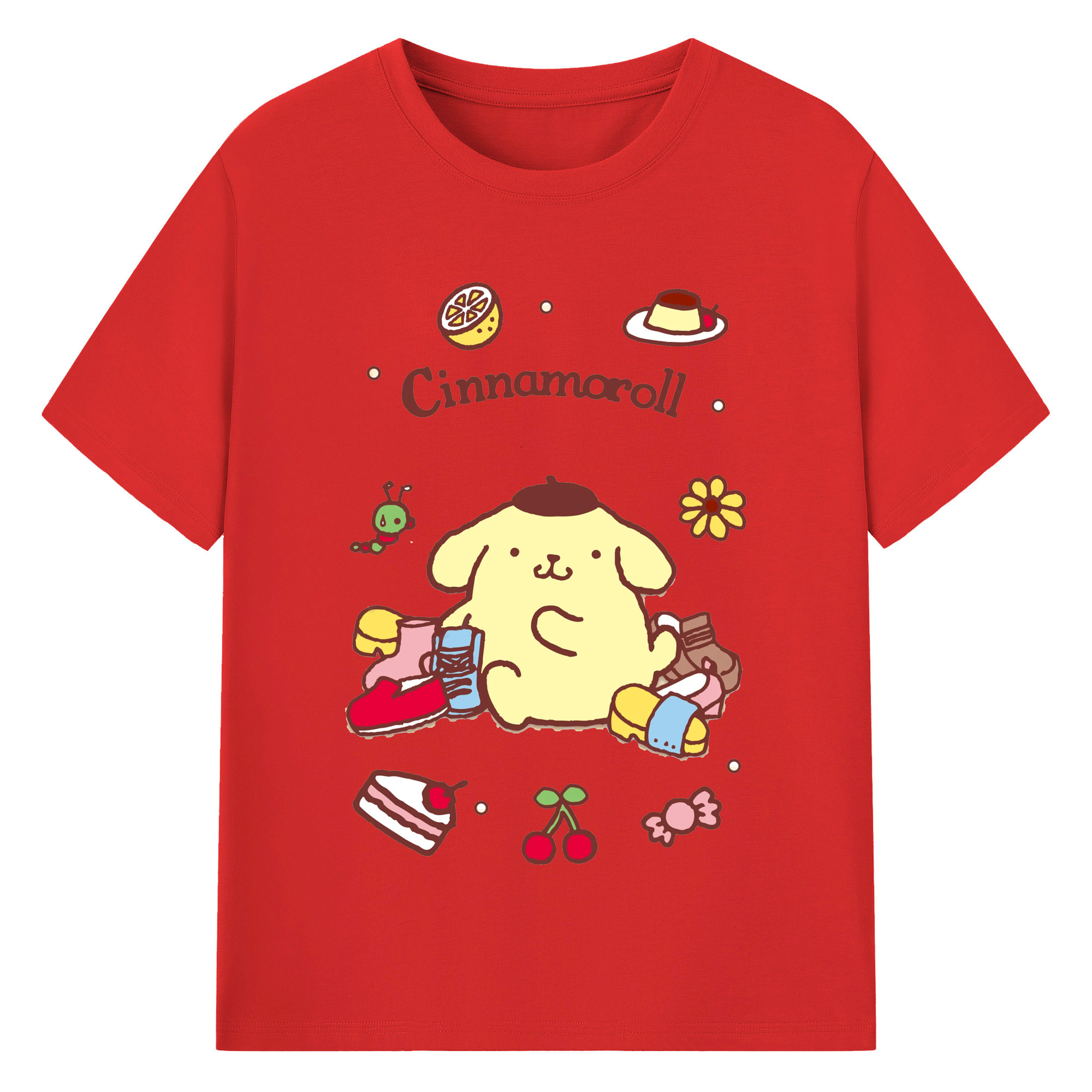 フルーツいっぱいのポムポムプリン - 綿100% 半袖Tシャツ ・ フロントプリント ・ 快適 通気性 ・ 日常使い 散歩 スポーツ用