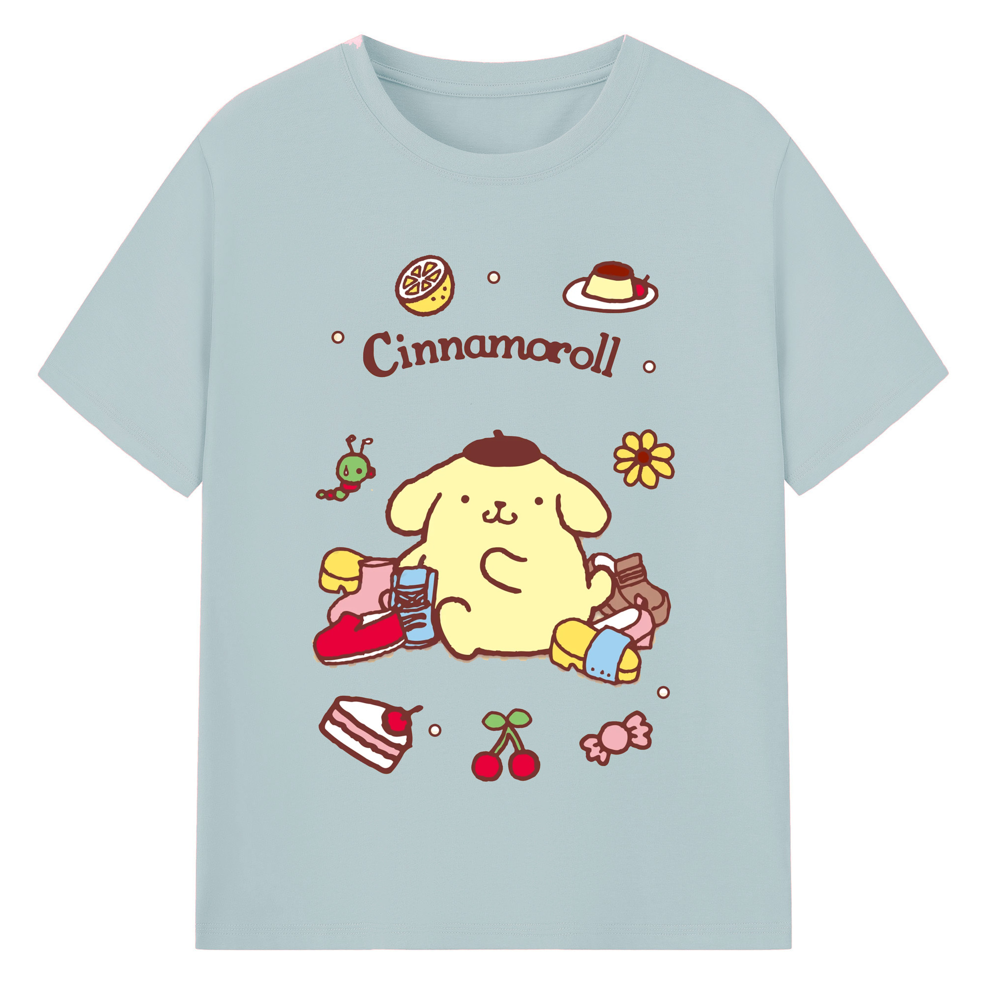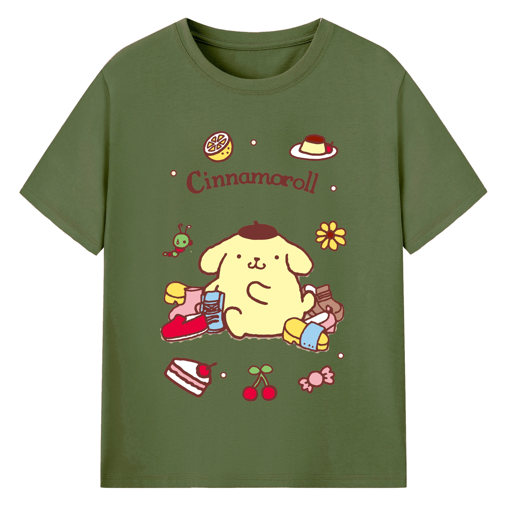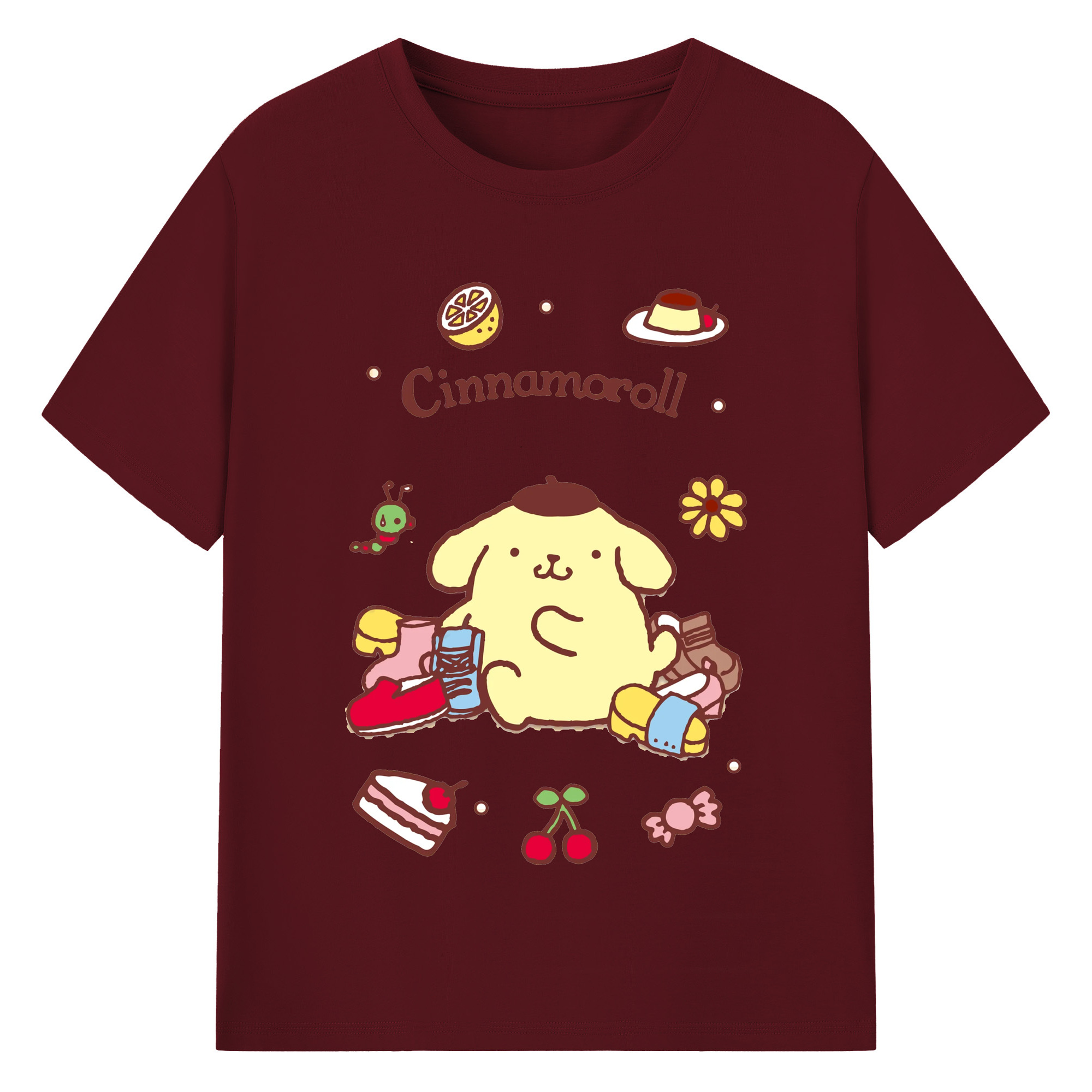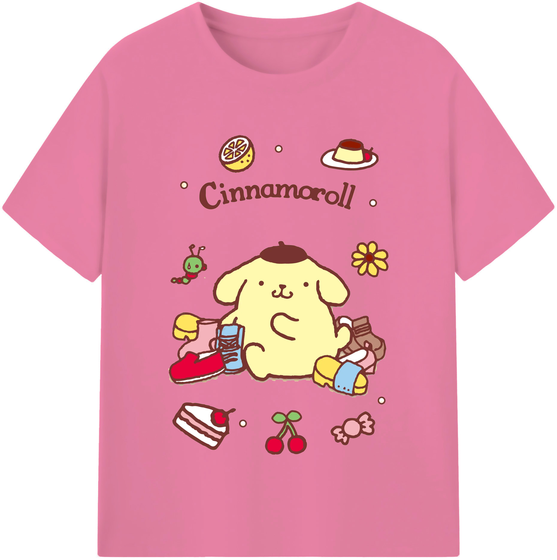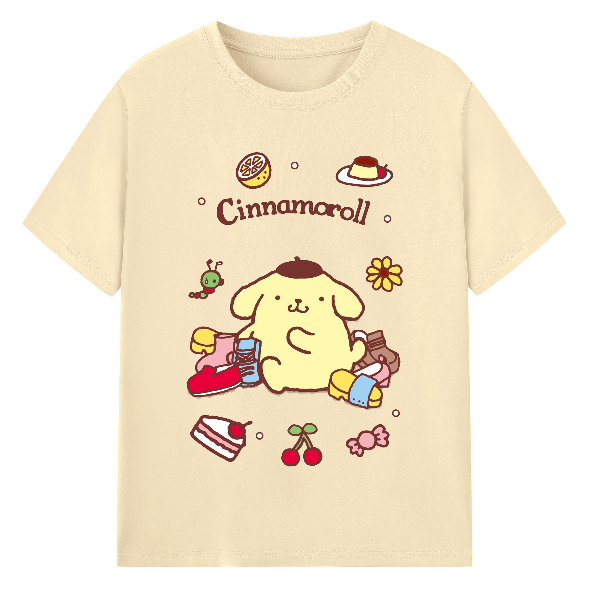 フルーツいっぱいのポムポムプリン - 綿100% 半袖Tシャツ ・ フロントプリント ・ 快適 通気性 ・ 日常使い 散歩 スポーツ用