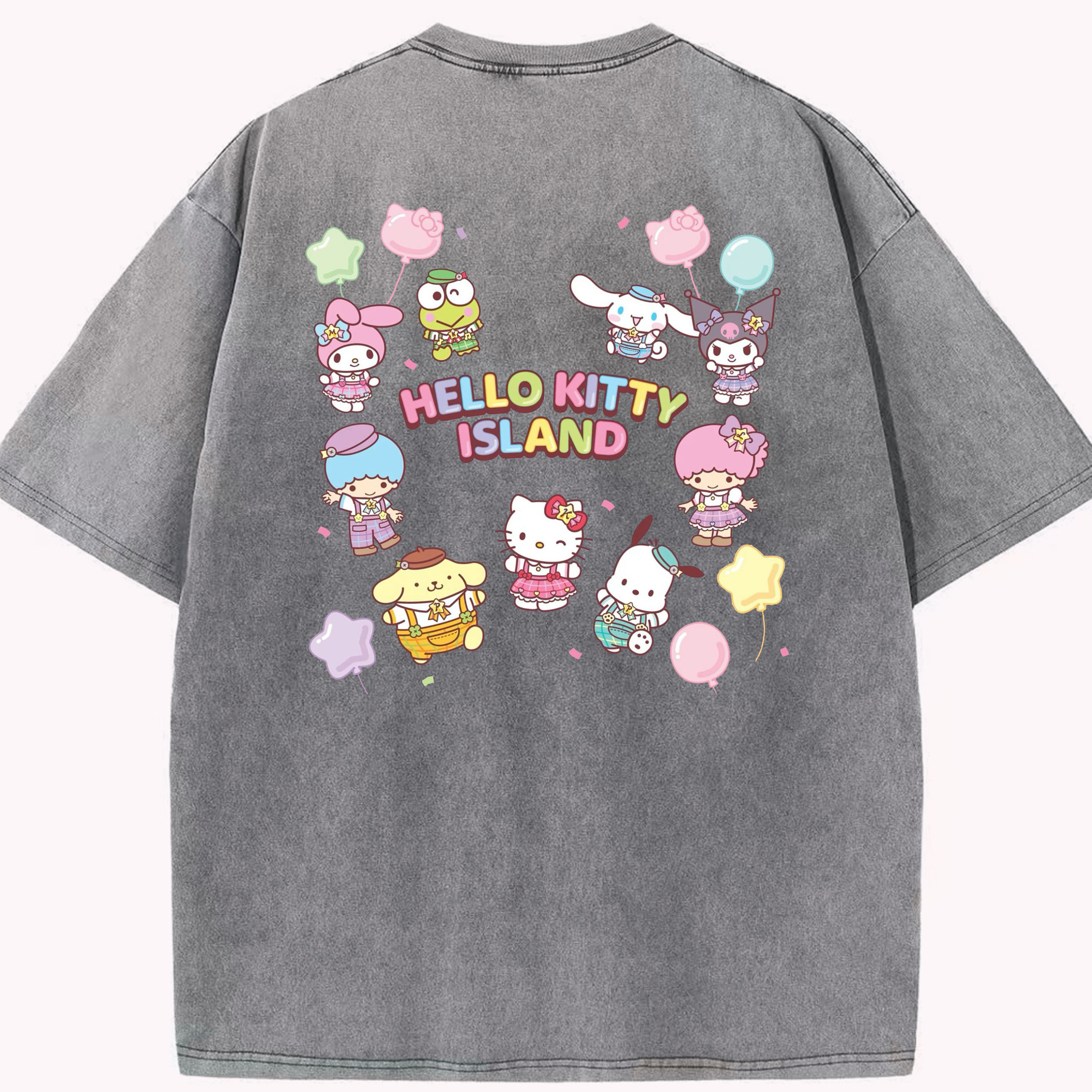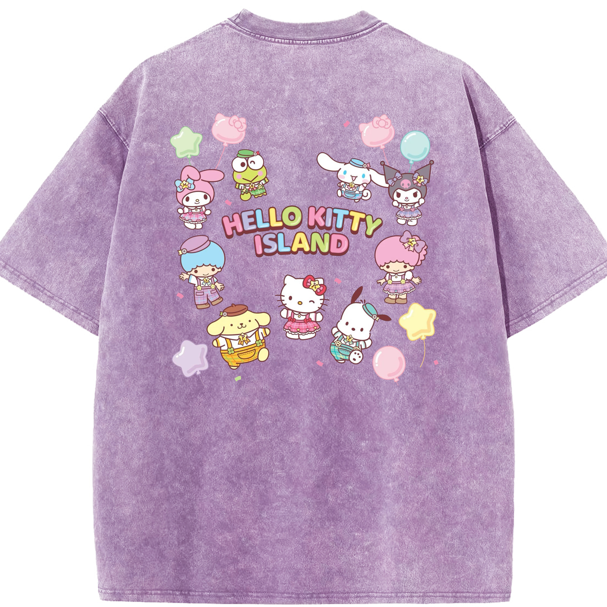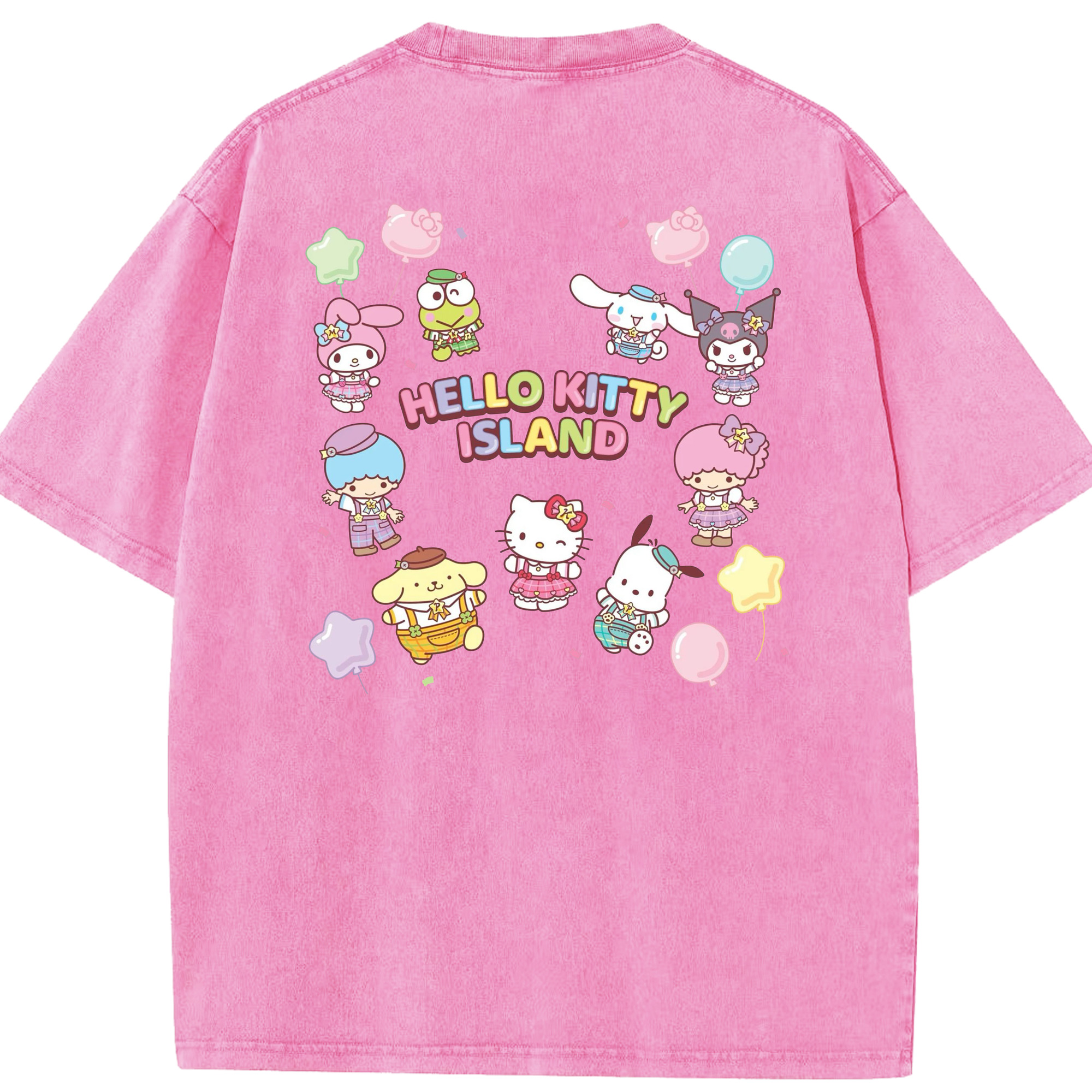 とってもかわいいサンリオファミリー - 綿100% ヴィンテージ風 半袖Tシャツ ・ 背面プリント ・ 柔らか肌触り ・ 通気性 快適 ・ スポーツ カジュアル 外出用