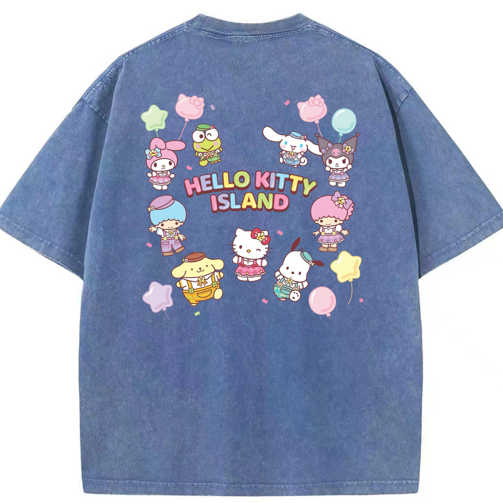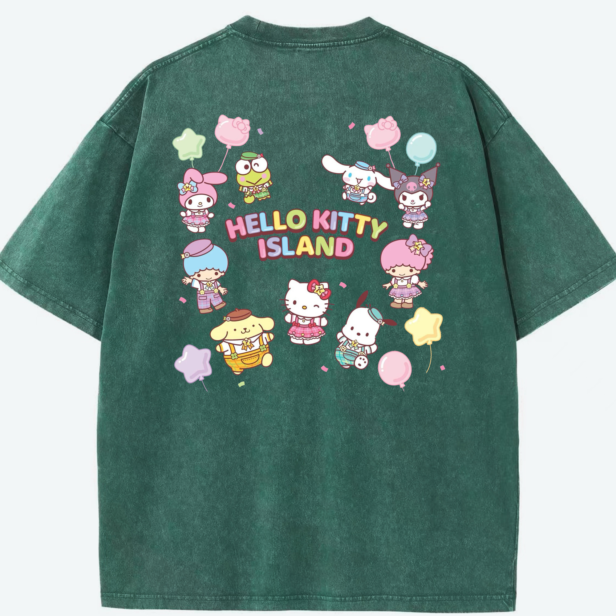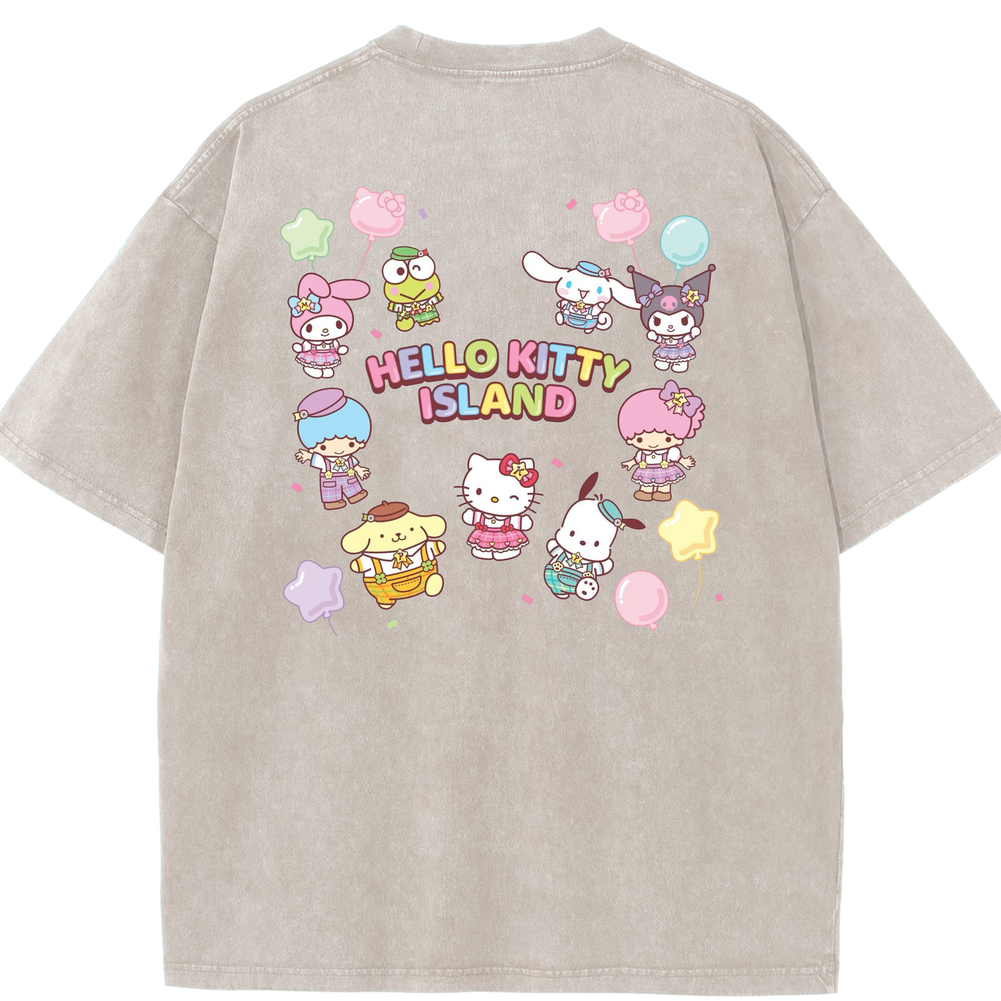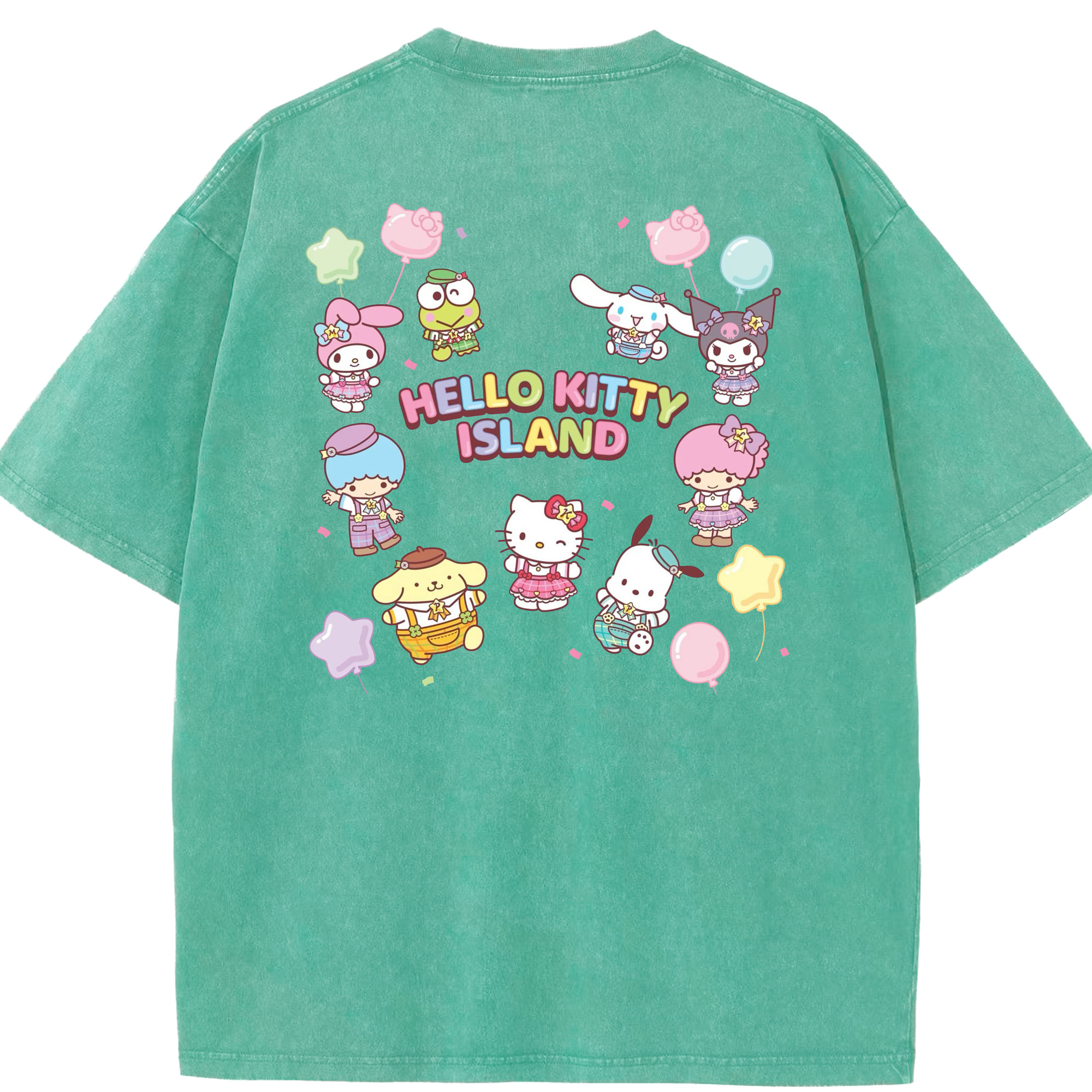 とってもかわいいサンリオファミリー - 綿100% ヴィンテージ風 半袖Tシャツ ・ 背面プリント ・ 柔らか肌触り ・ 通気性 快適 ・ スポーツ カジュアル 外出用