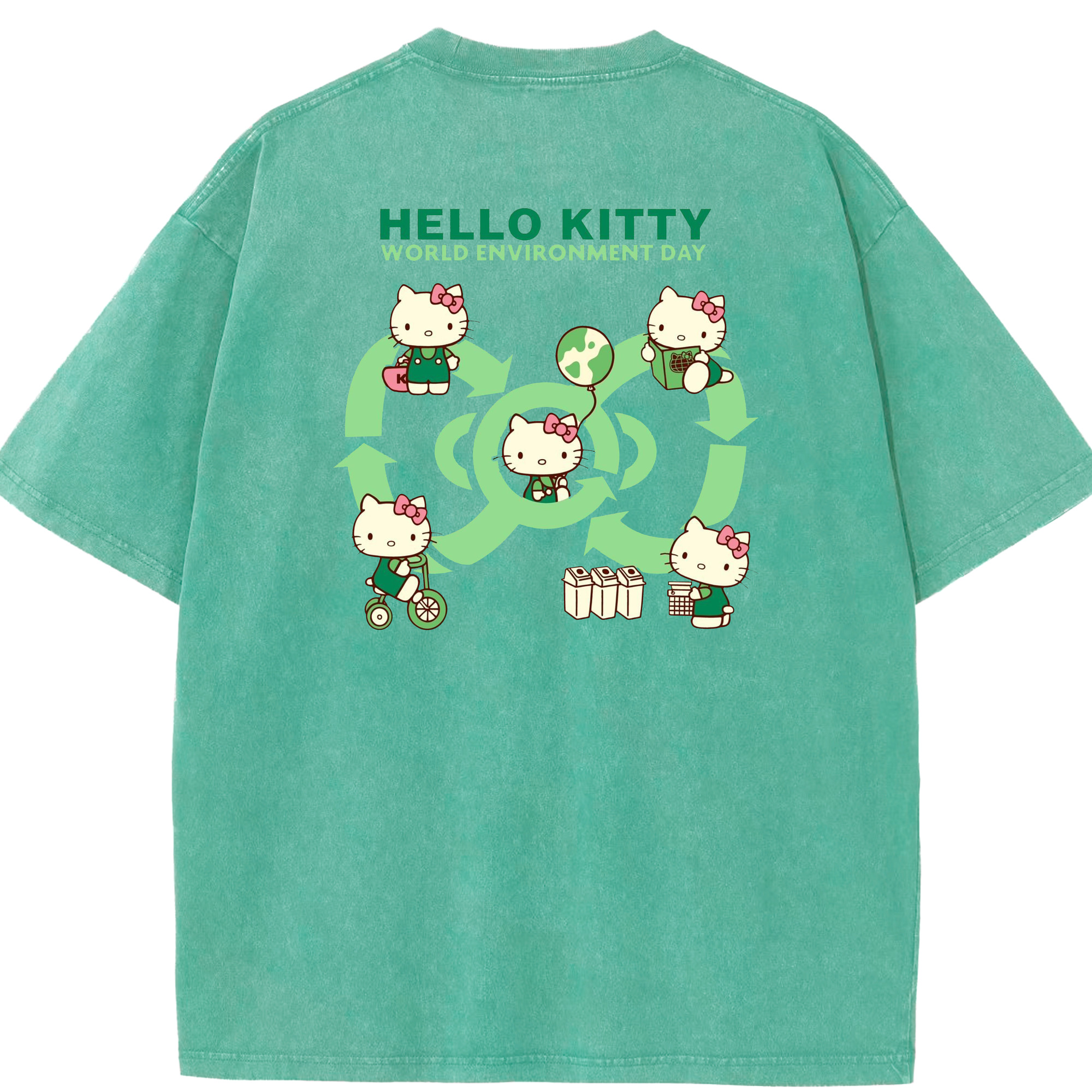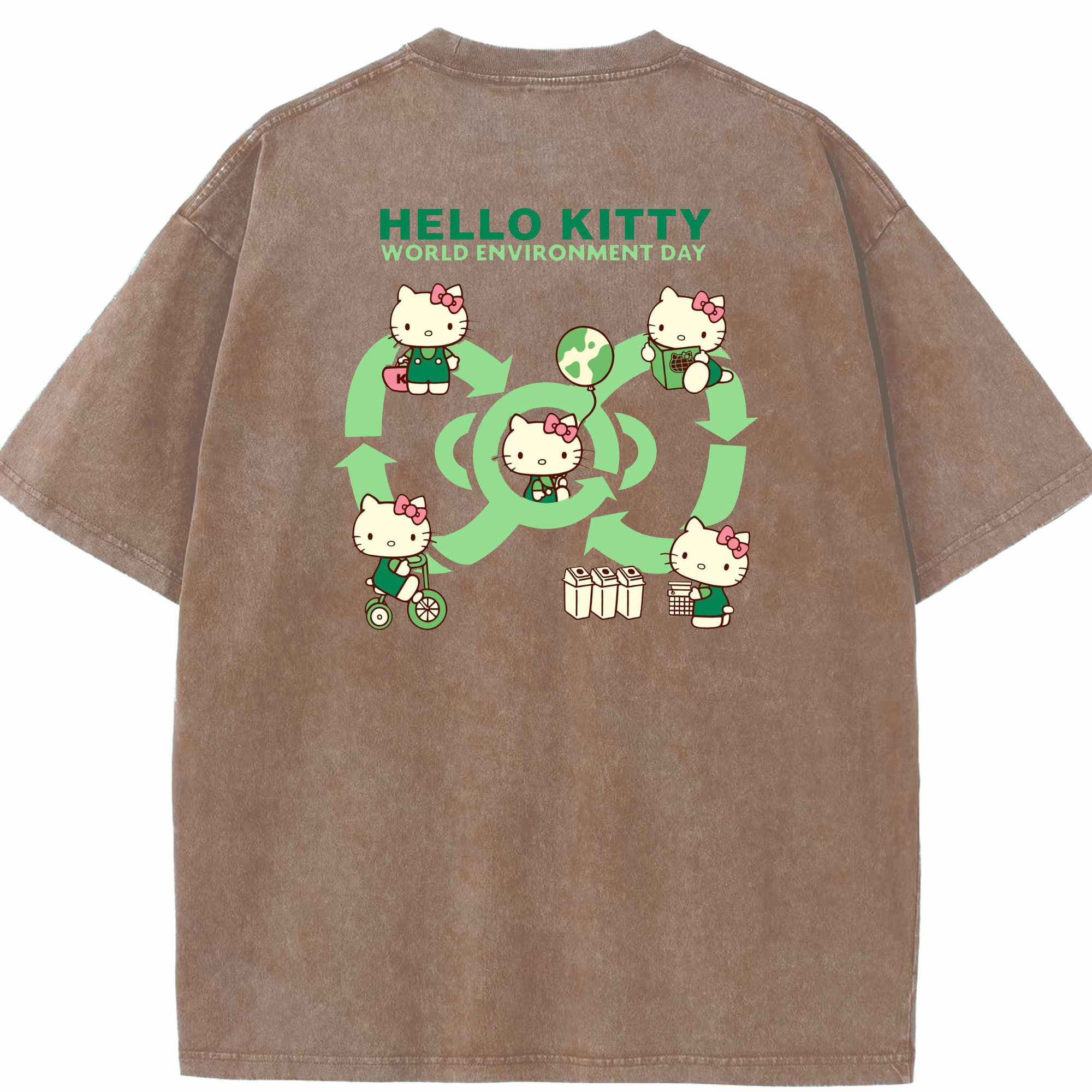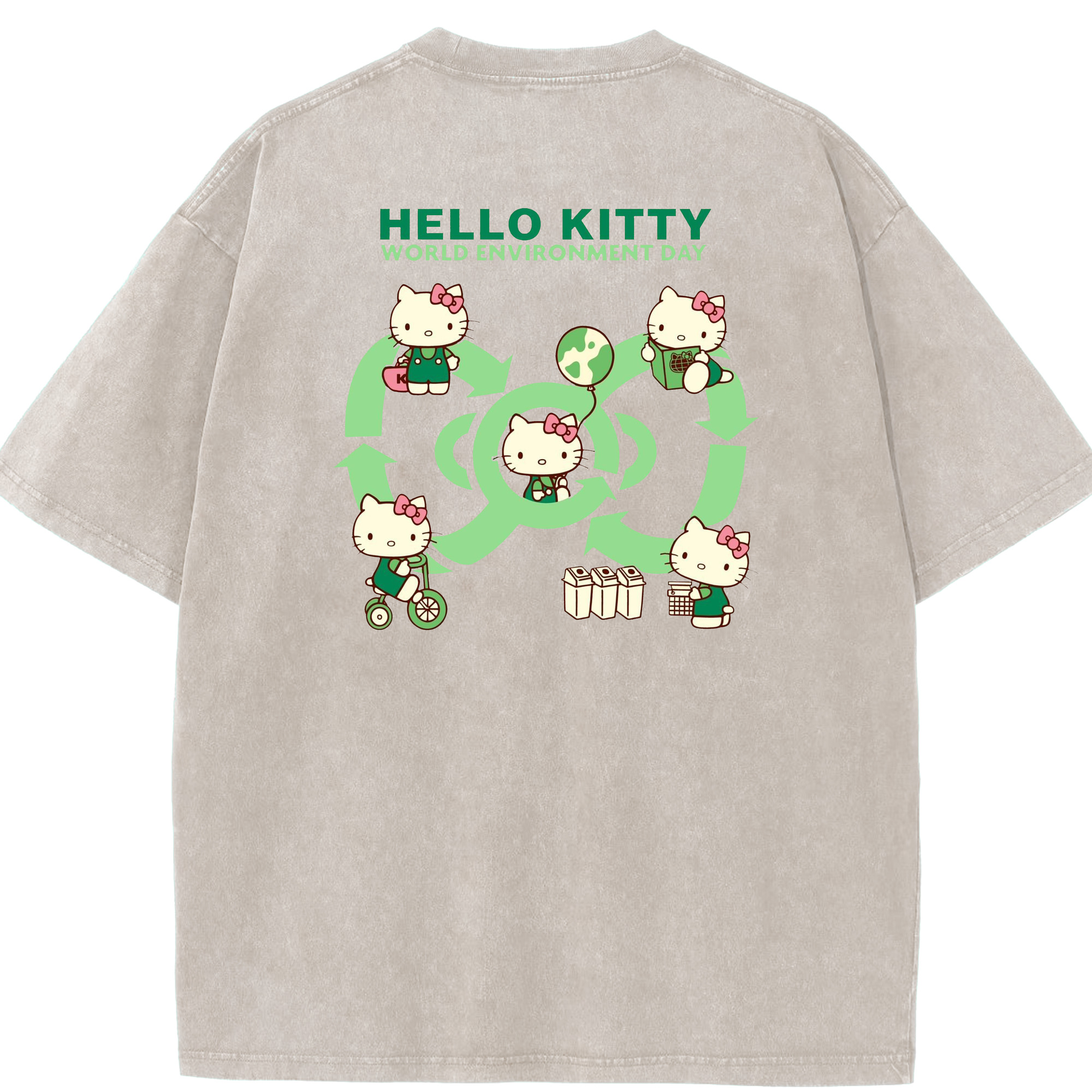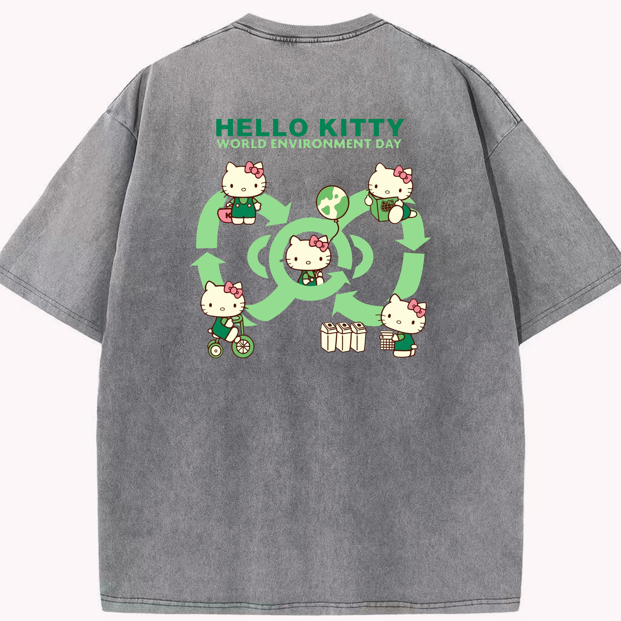 環境にやさしいハローキティ - 綿100% ヴィンテージ風 半袖Tシャツ ・ フロントプリント ・ 柔らか肌触り ・ 通気性 快適 ・ スポーツ カジュアル 外出用