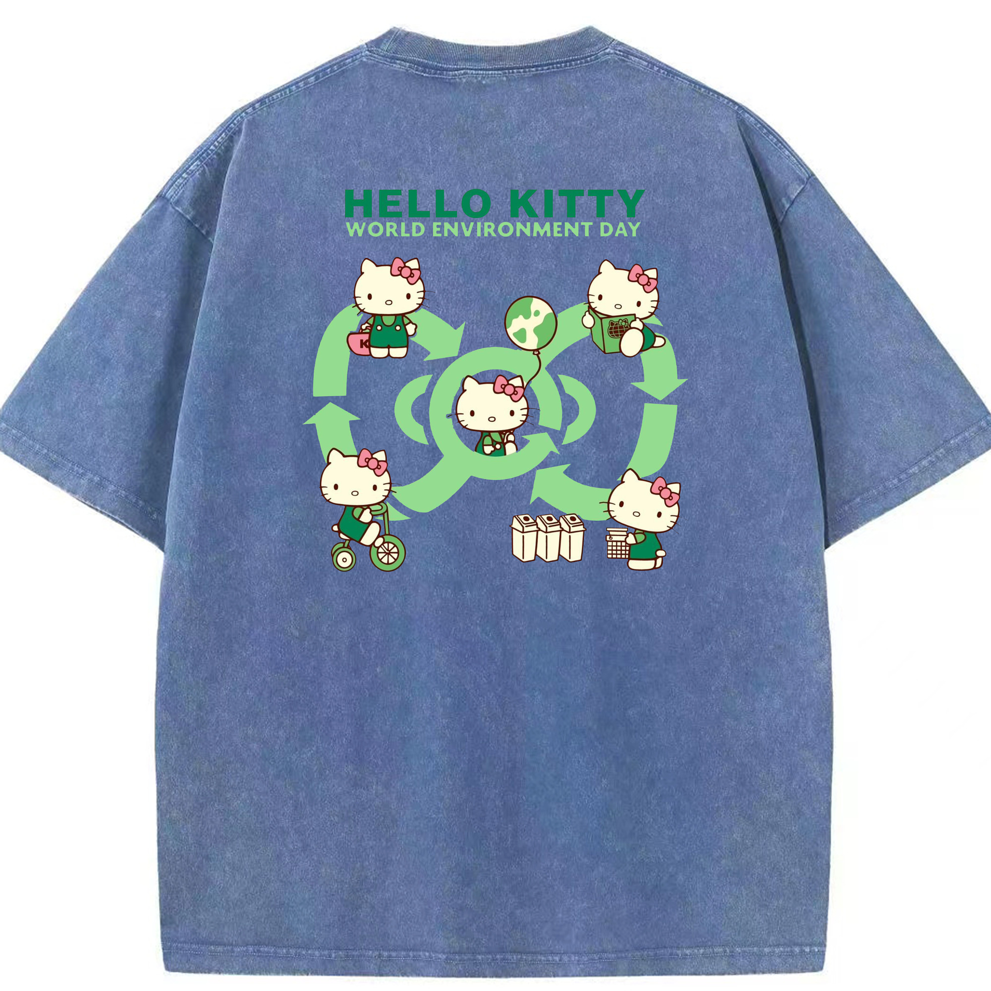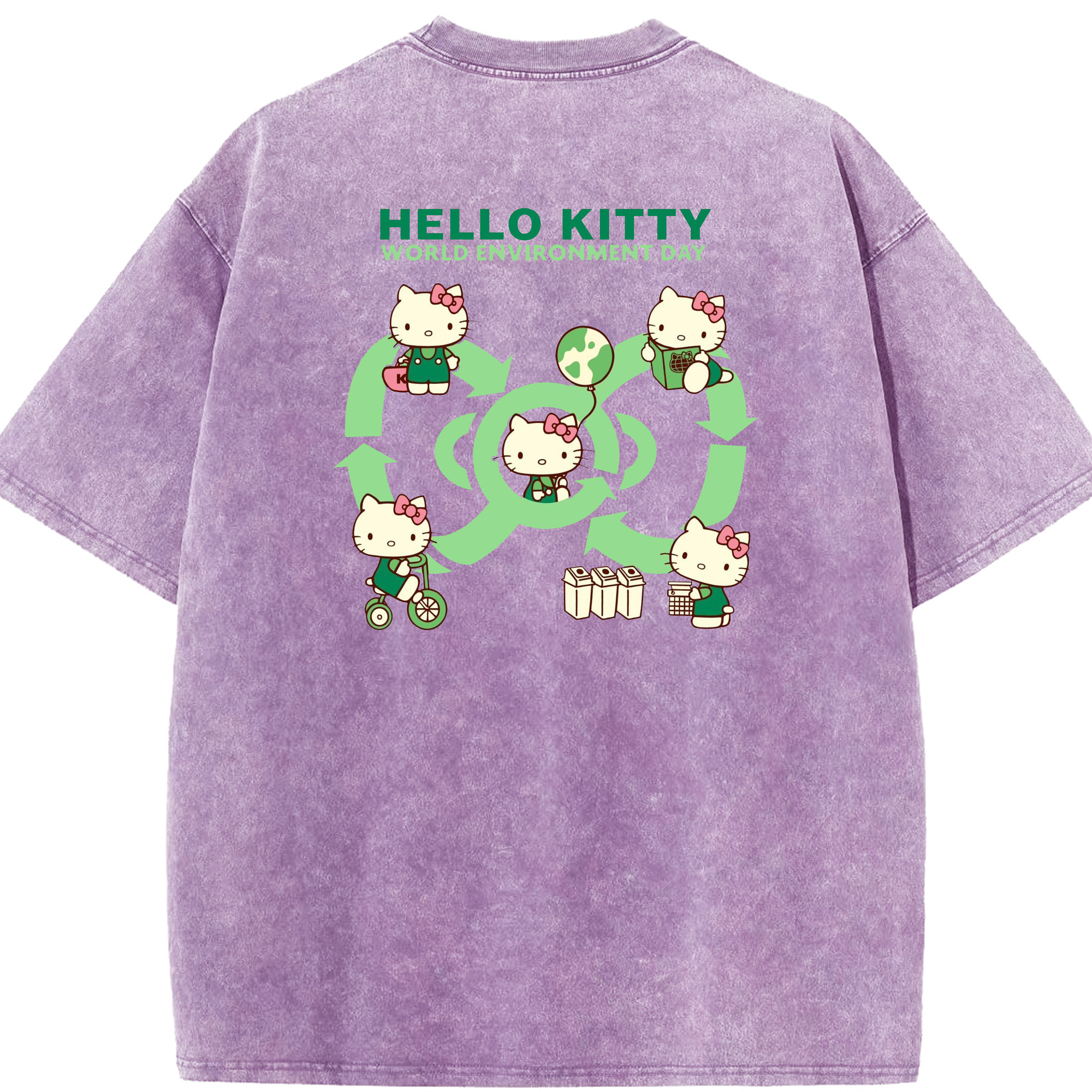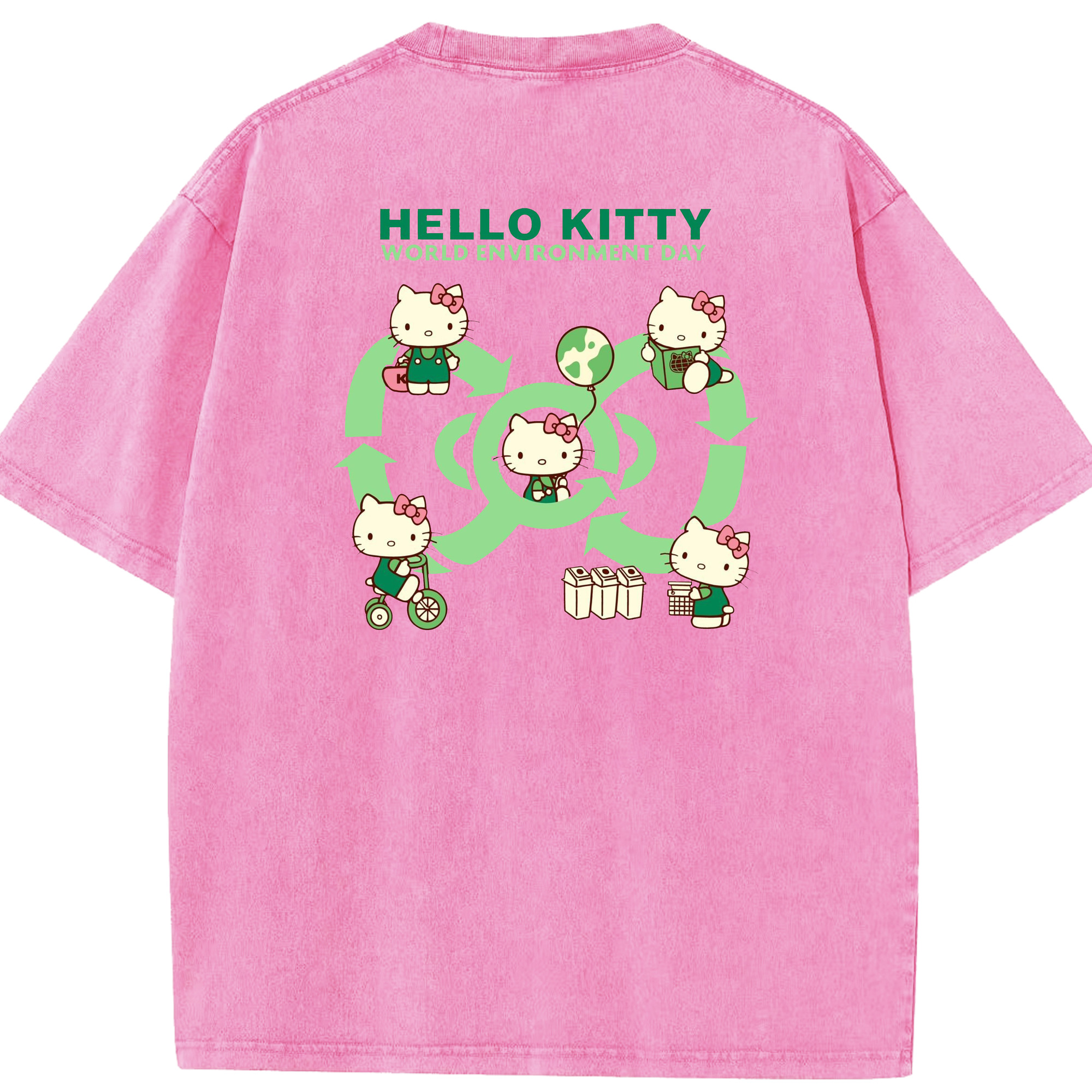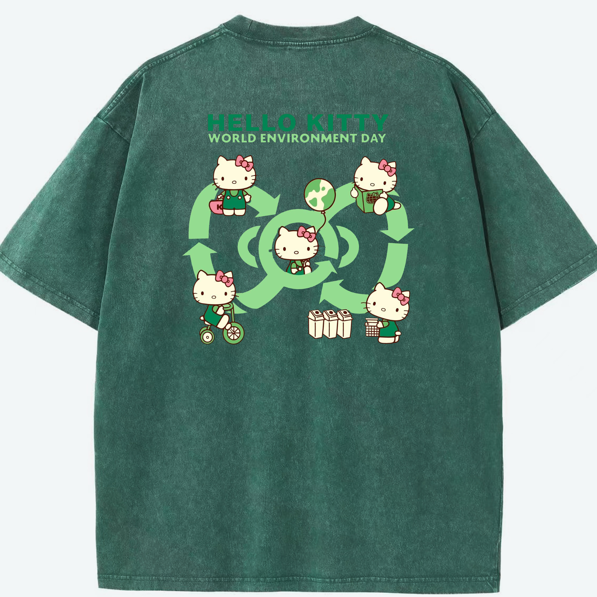 環境にやさしいハローキティ - 綿100% ヴィンテージ風 半袖Tシャツ ・ フロントプリント ・ 柔らか肌触り ・ 通気性 快適 ・ スポーツ カジュアル 外出用