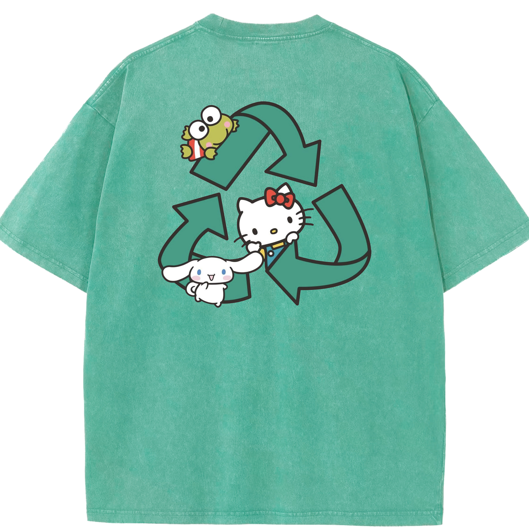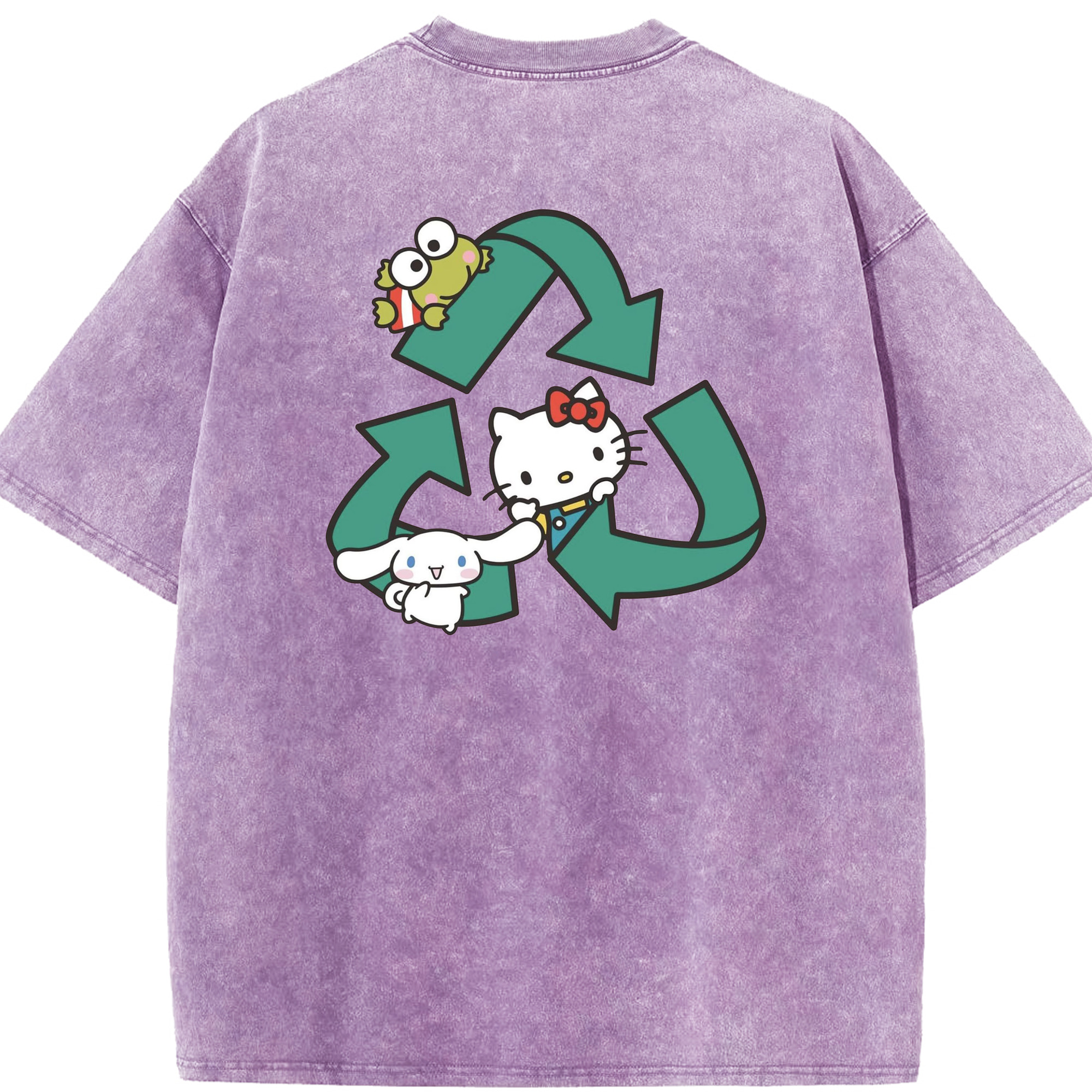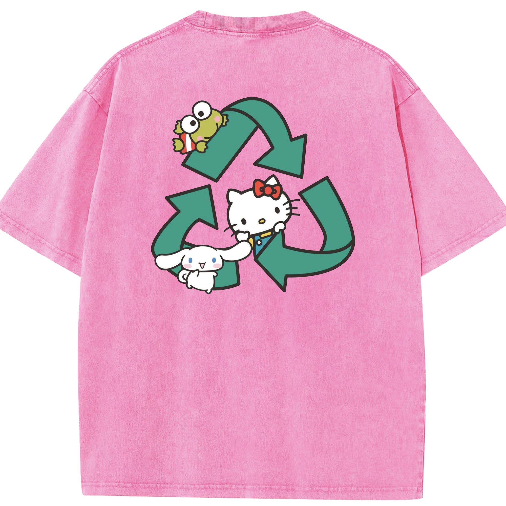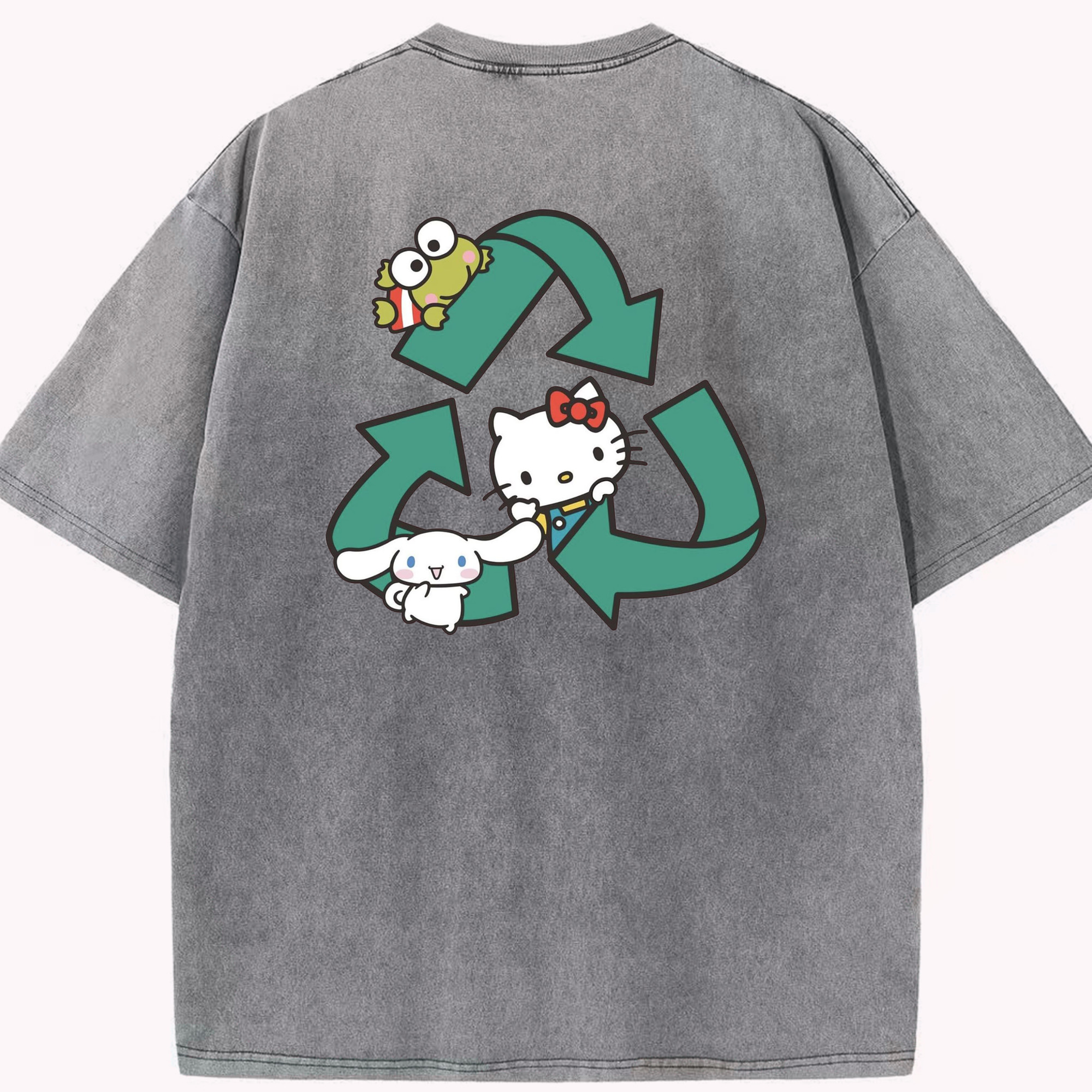 環境にやさしいハローキティ - 綿100% ヴィンテージ風 半袖Tシャツ ・ フロントプリント ・ 柔らか肌触り ・ 通気性 快適 ・ スポーツ カジュアル 外出用
