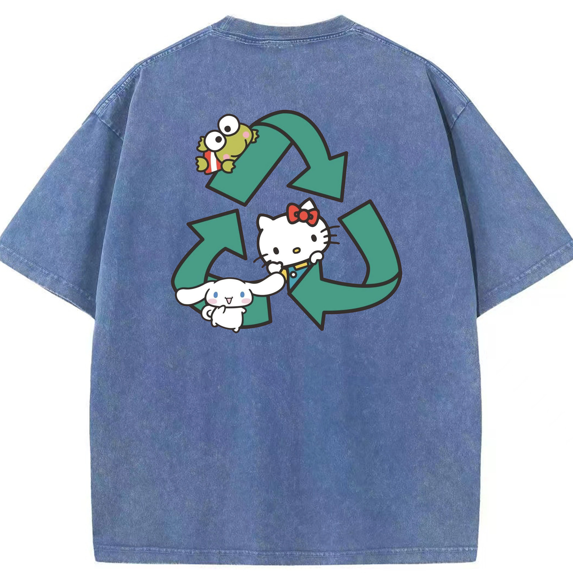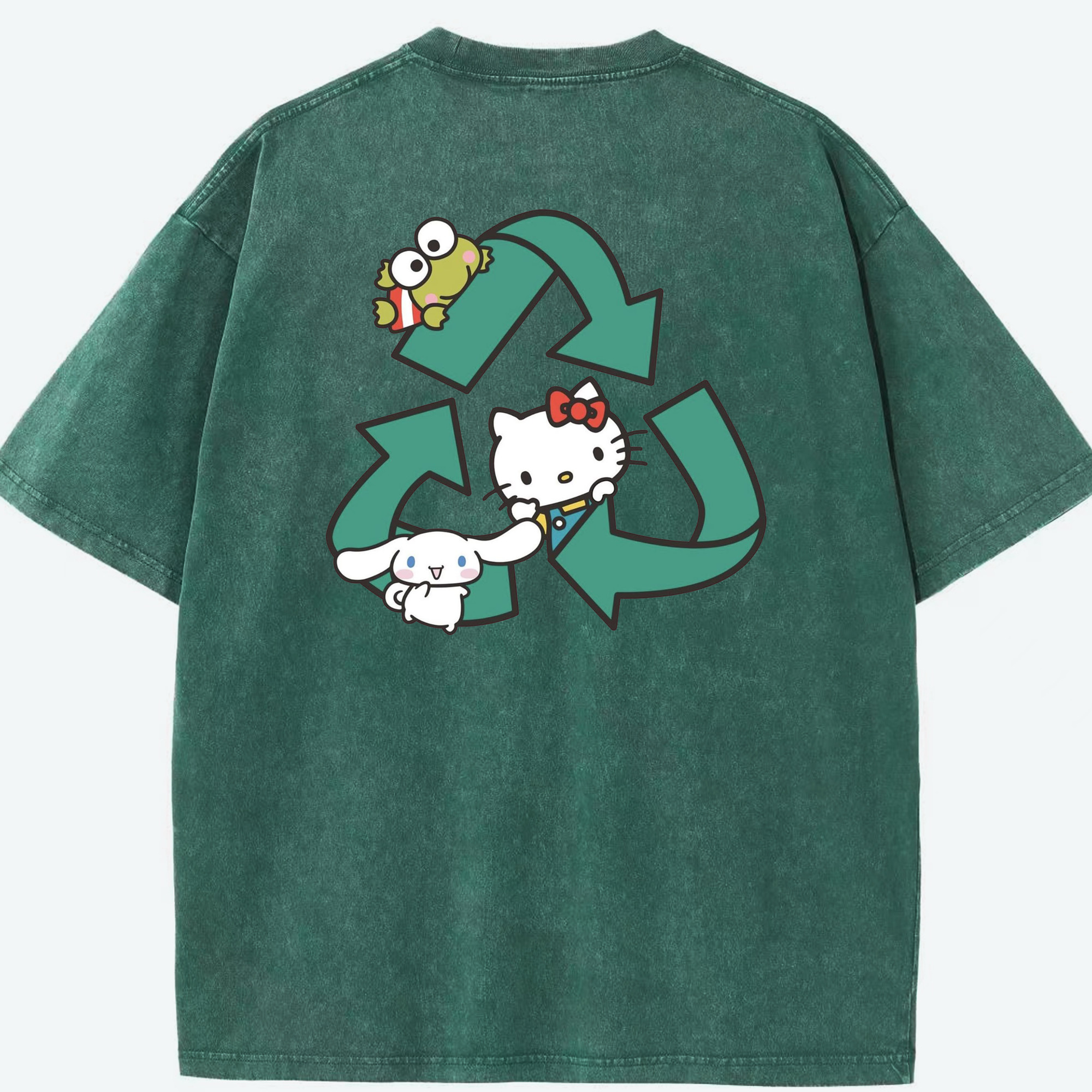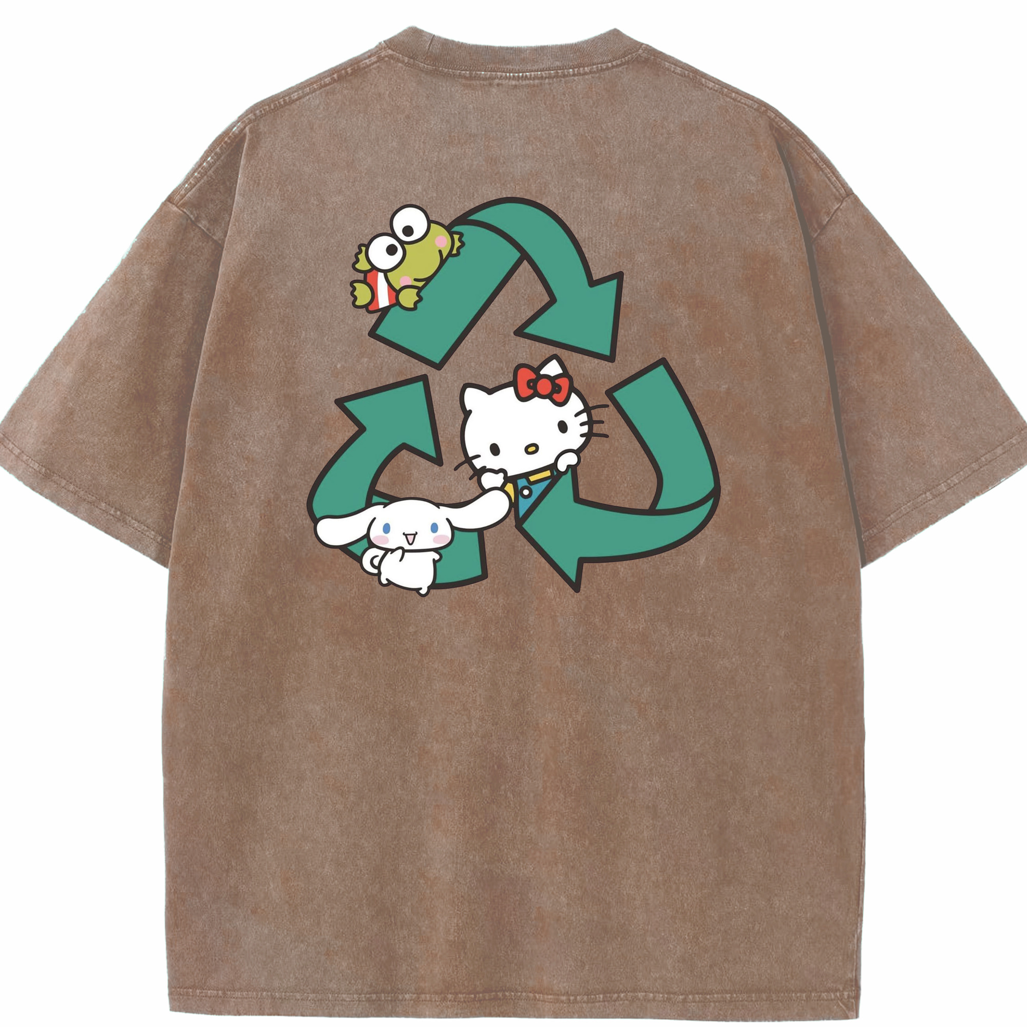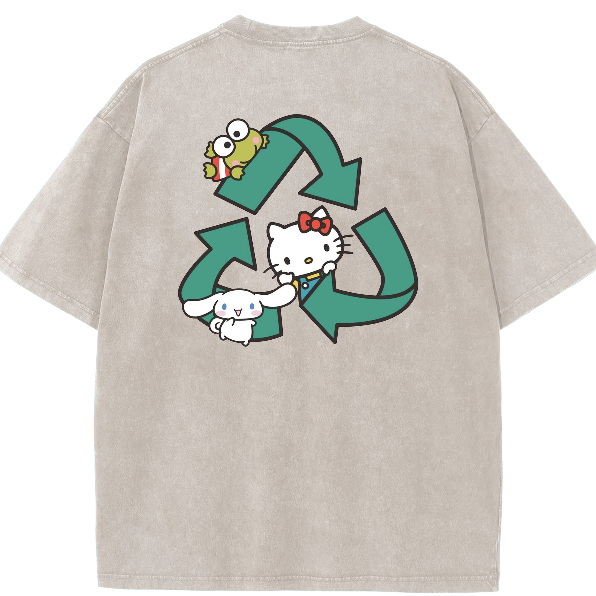 環境にやさしいハローキティ - 綿100% ヴィンテージ風 半袖Tシャツ ・ フロントプリント ・ 柔らか肌触り ・ 通気性 快適 ・ スポーツ カジュアル 外出用