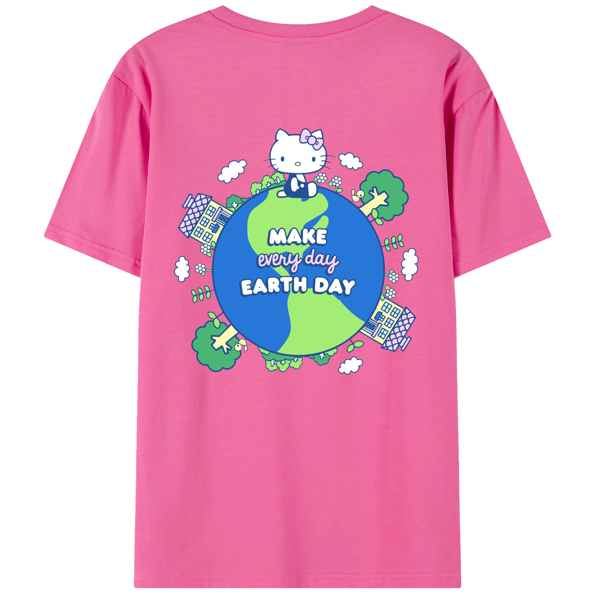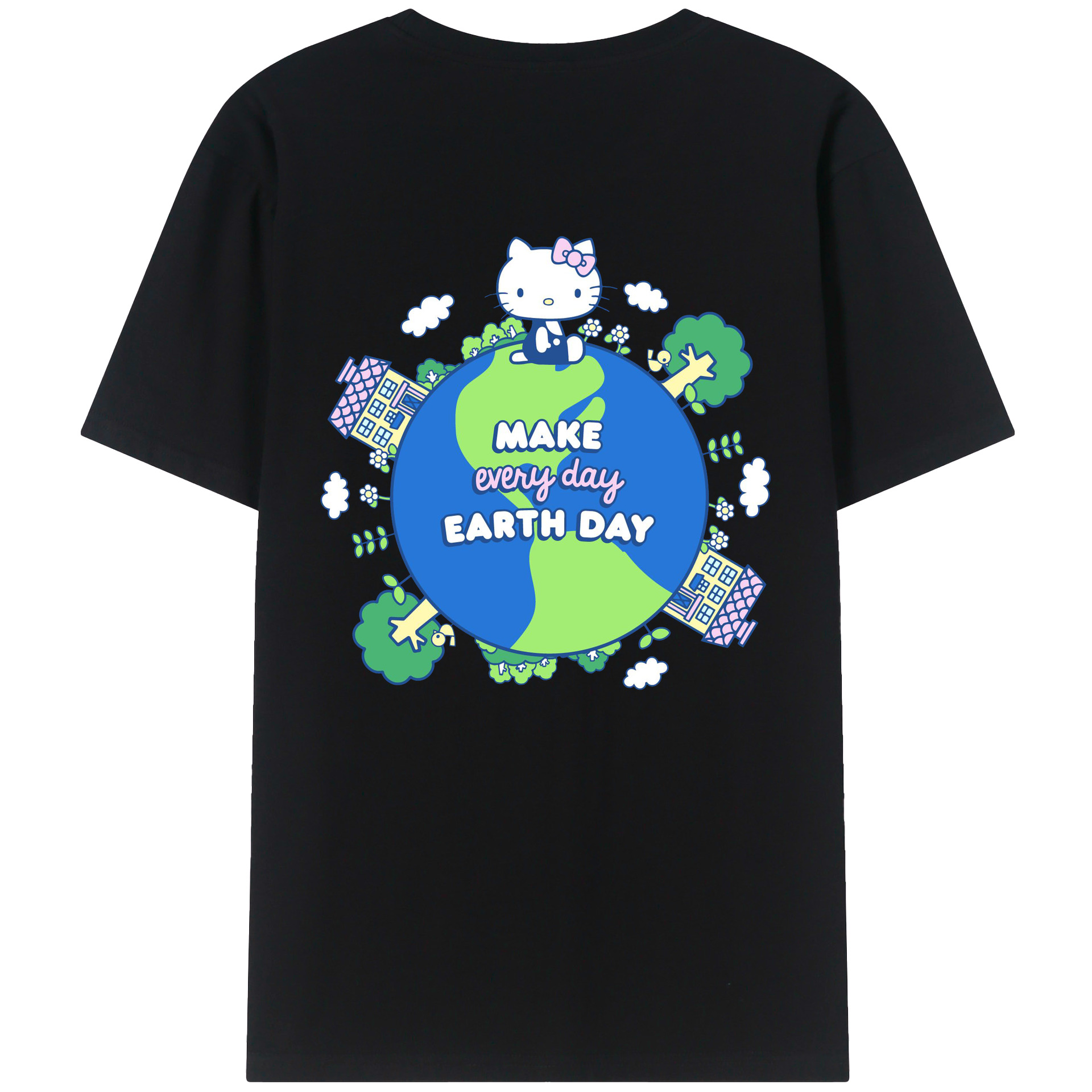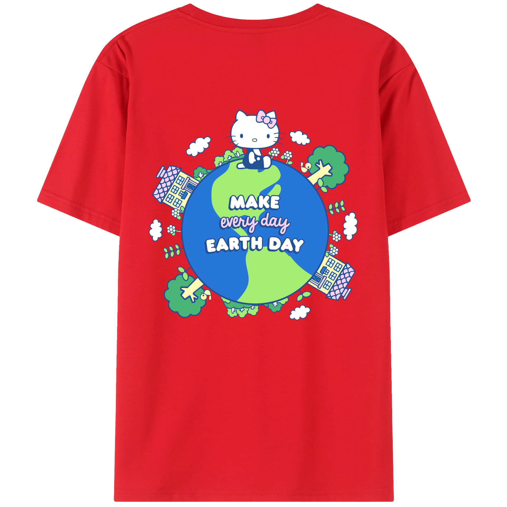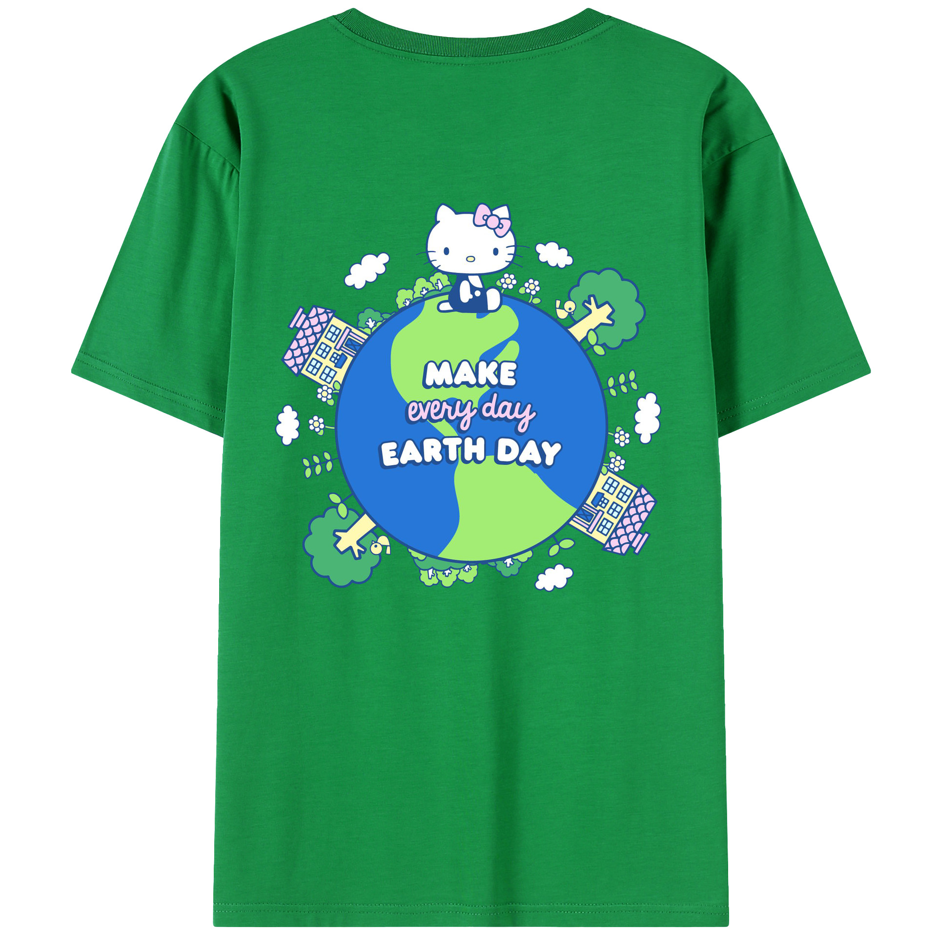 環境にやさしいハローキティ - レディース半袖Tシャツ ・ 綿100% ・ バックプリント ・ 強化クルーネック ・ 二重折り袖口 ・ 快適 通気性 ・ フィットネス カジュアル 旅行用