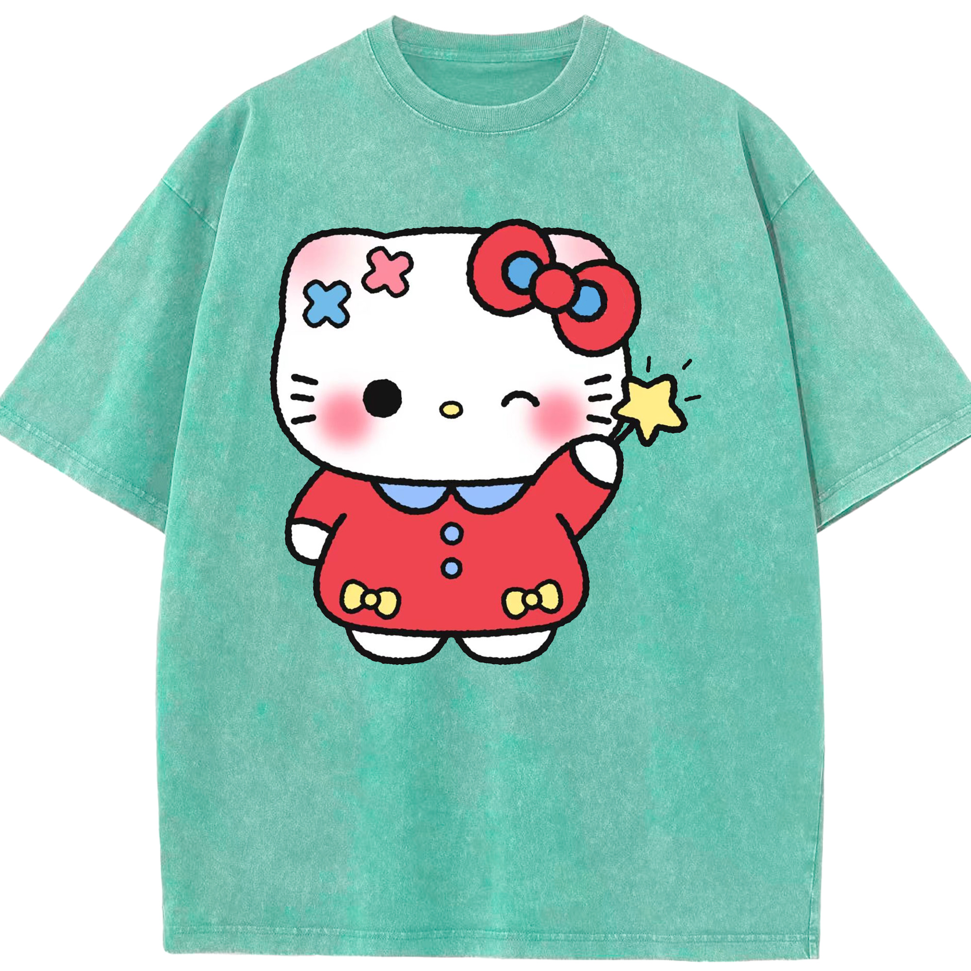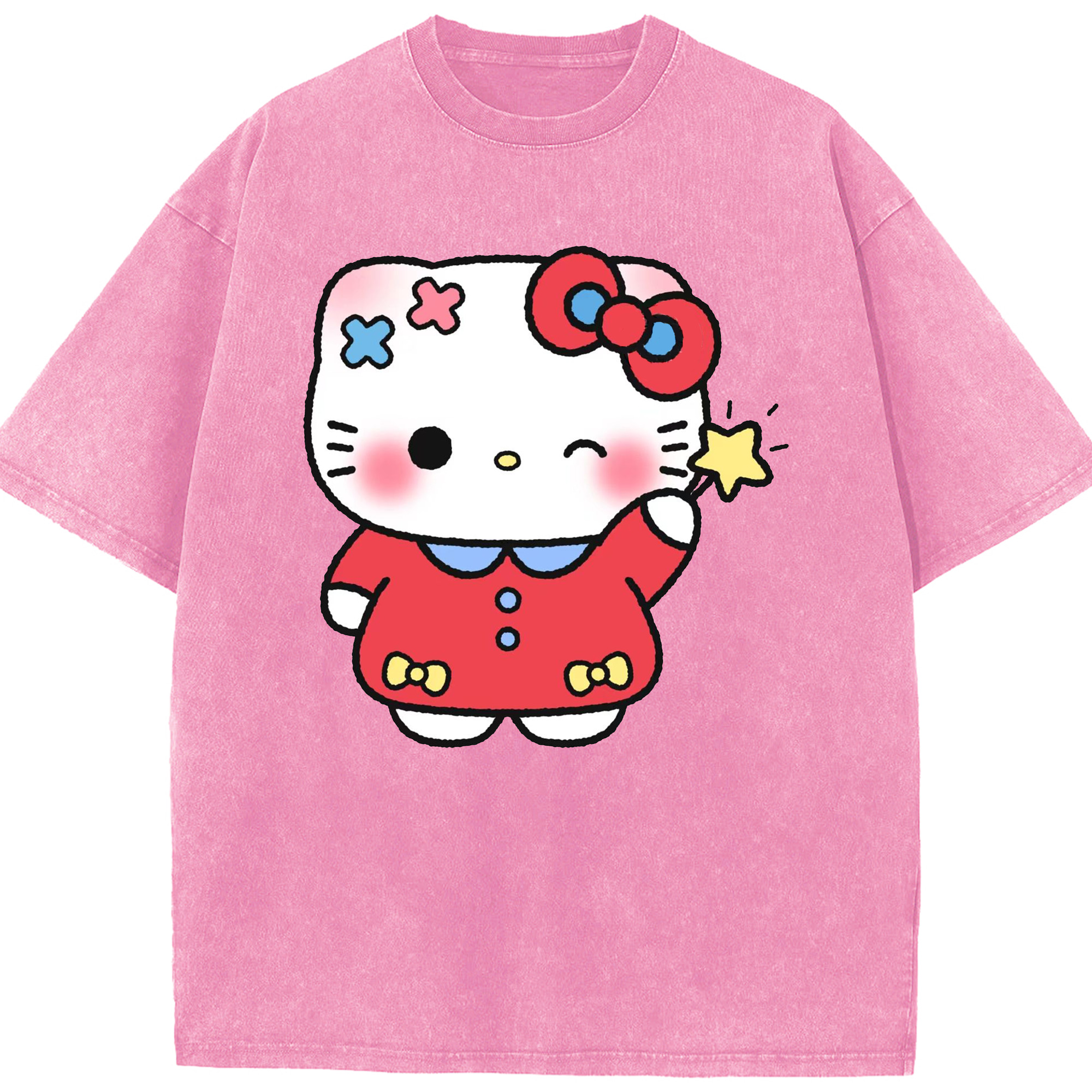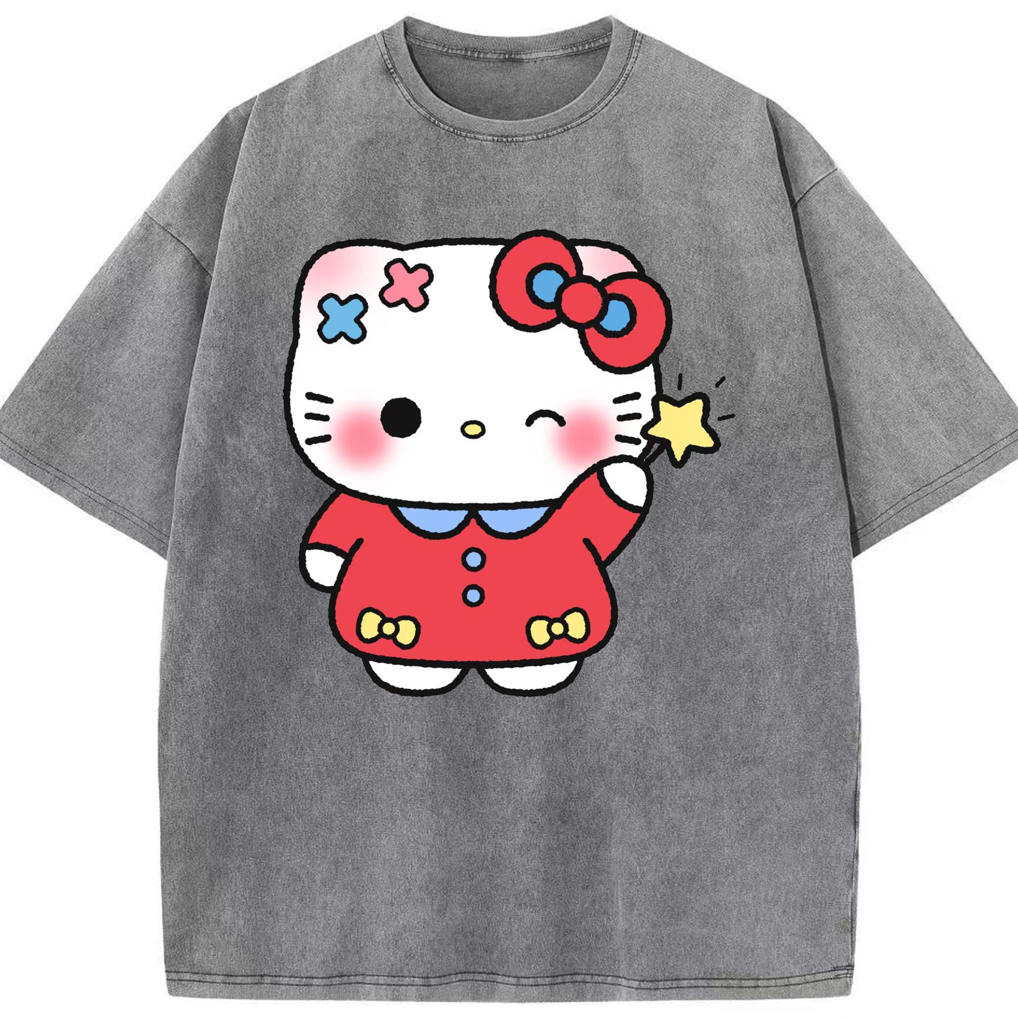 遊び心満載のハローキティ - 綿100% ヴィンテージ風 半袖Tシャツ ・ フロントプリント ・ 柔らか肌触り ・ 通気性 快適 ・ スポーツ カジュアル 外出用