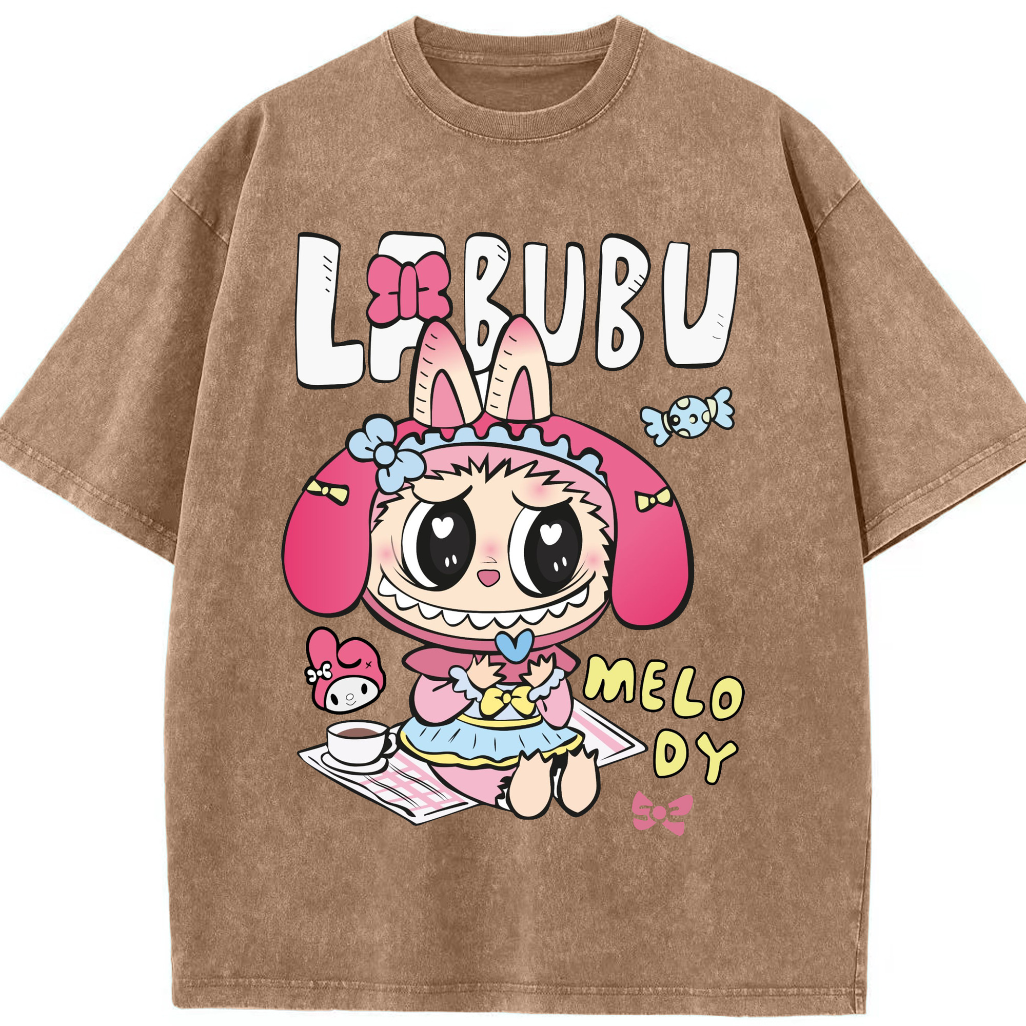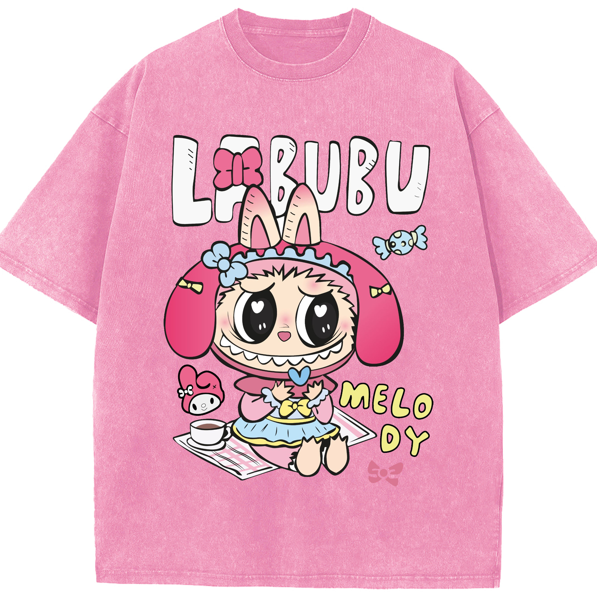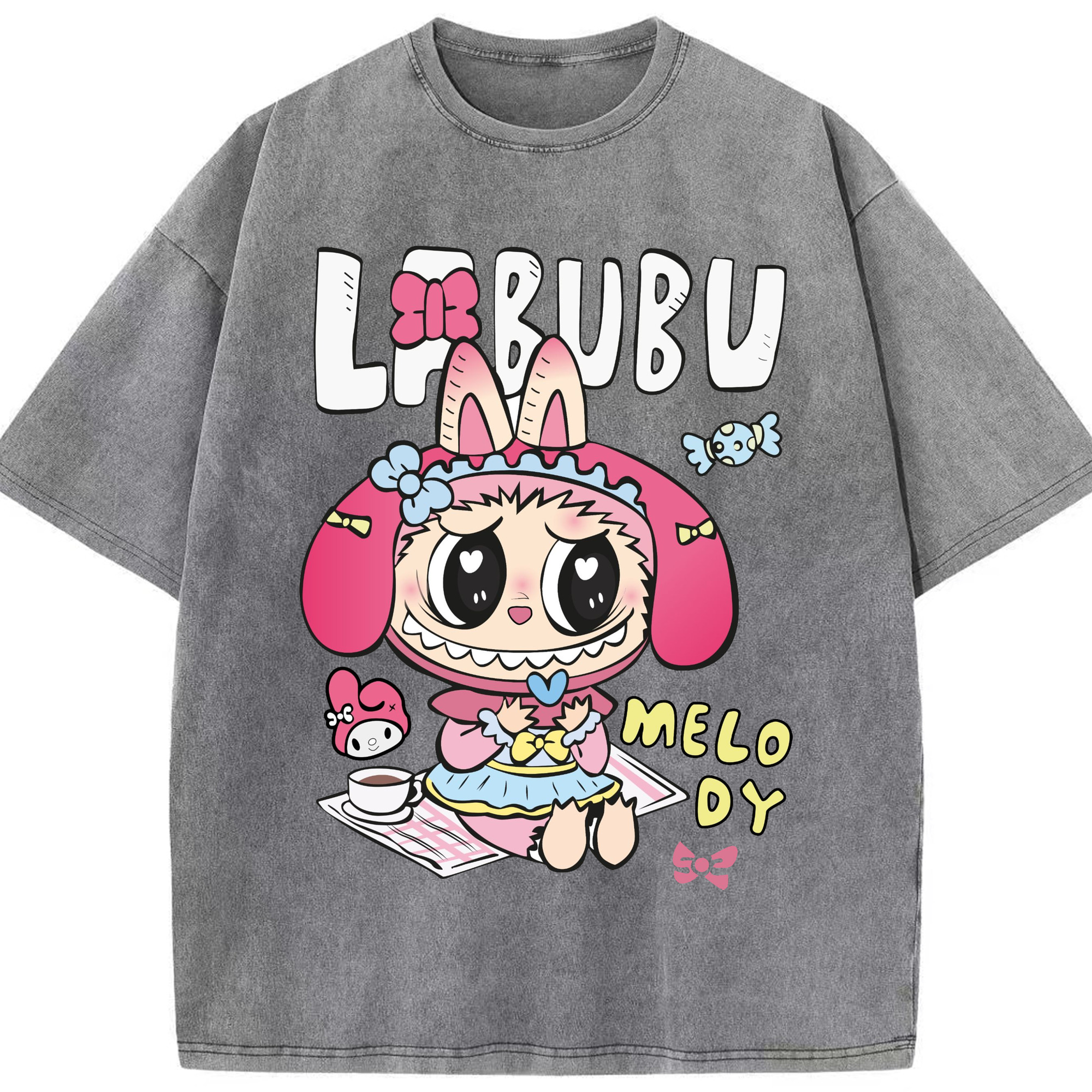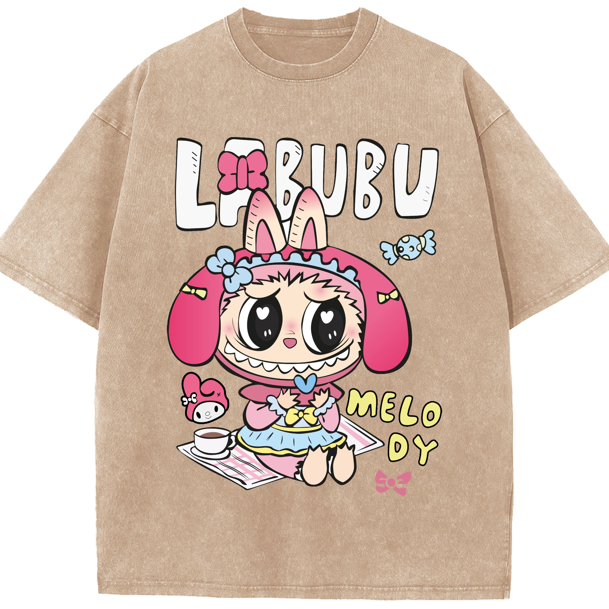 【限定】サンリオマイメロディ × ラブブ コラボ - 綿100% ヴィンテージ風 半袖Tシャツ ・ 背面プリント ・ 柔らか肌触り ・ 通気性 快適 ・ スポーツ カジュアル 外出用