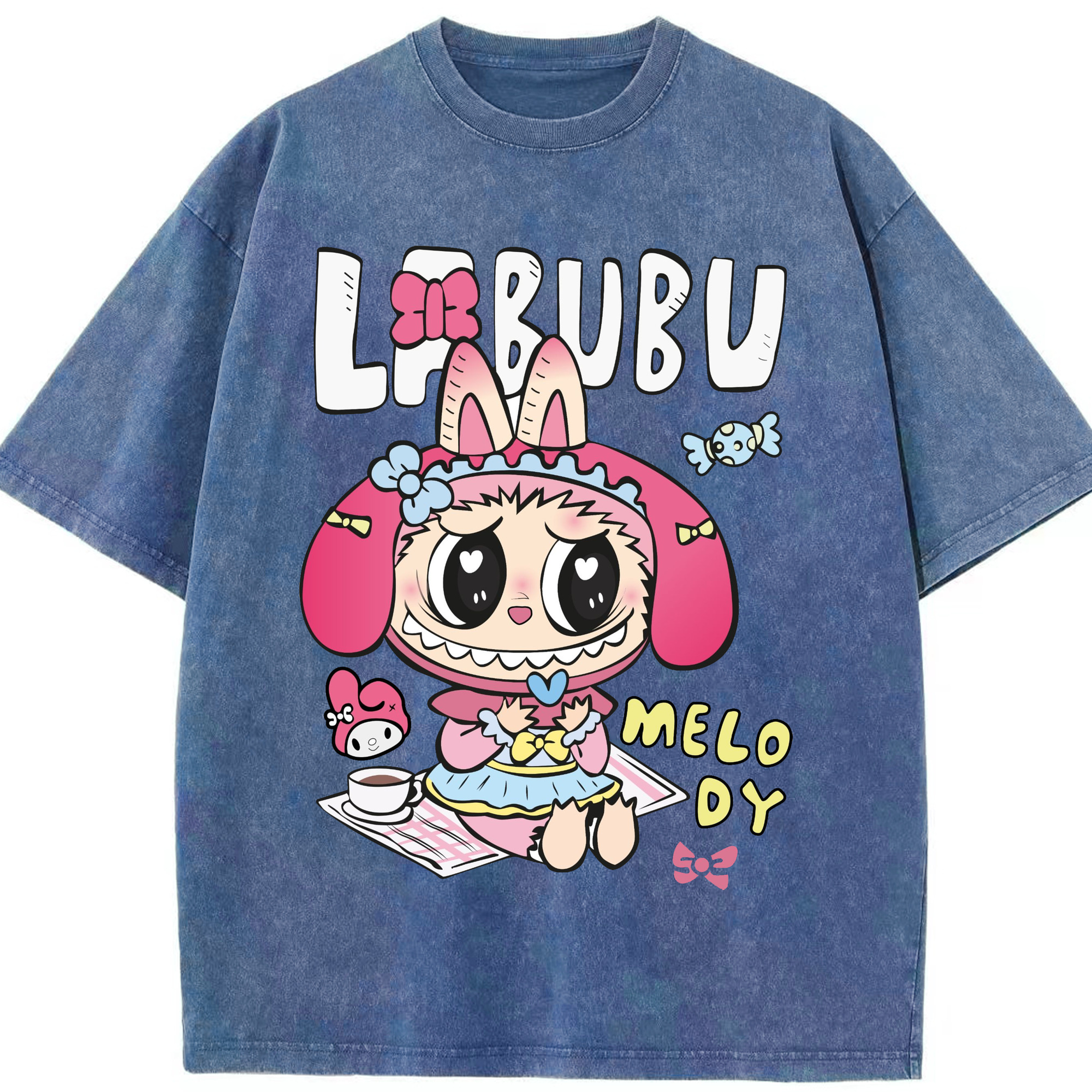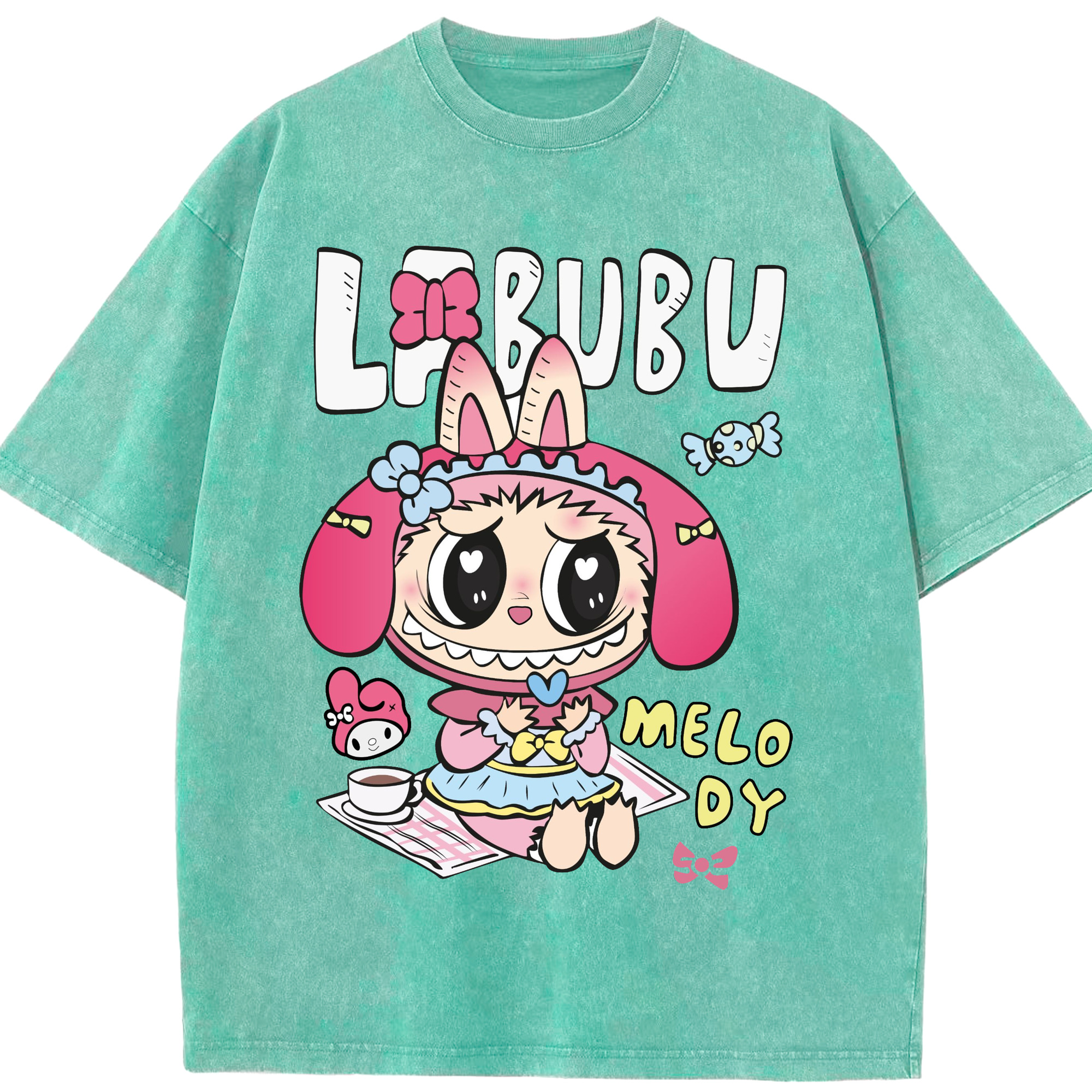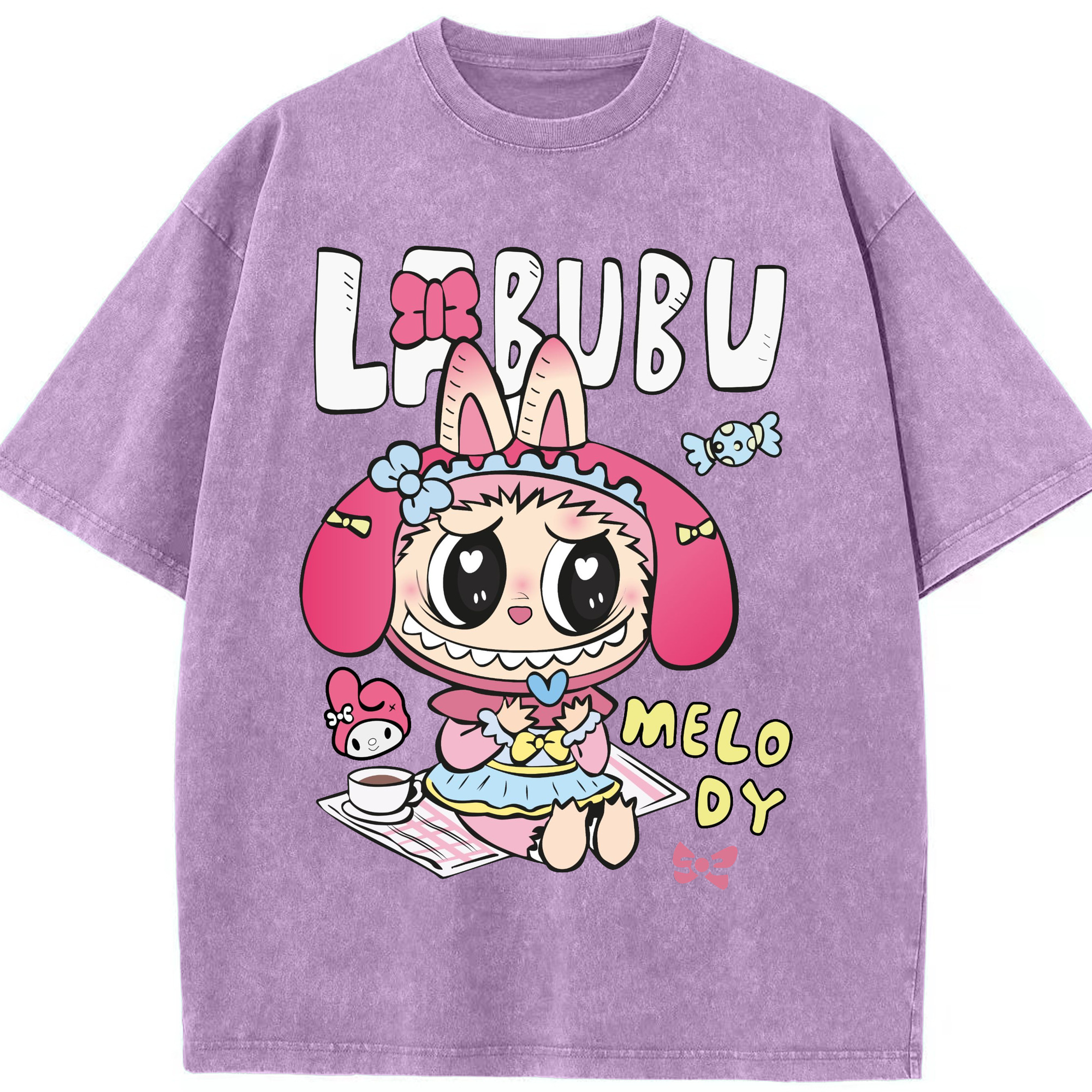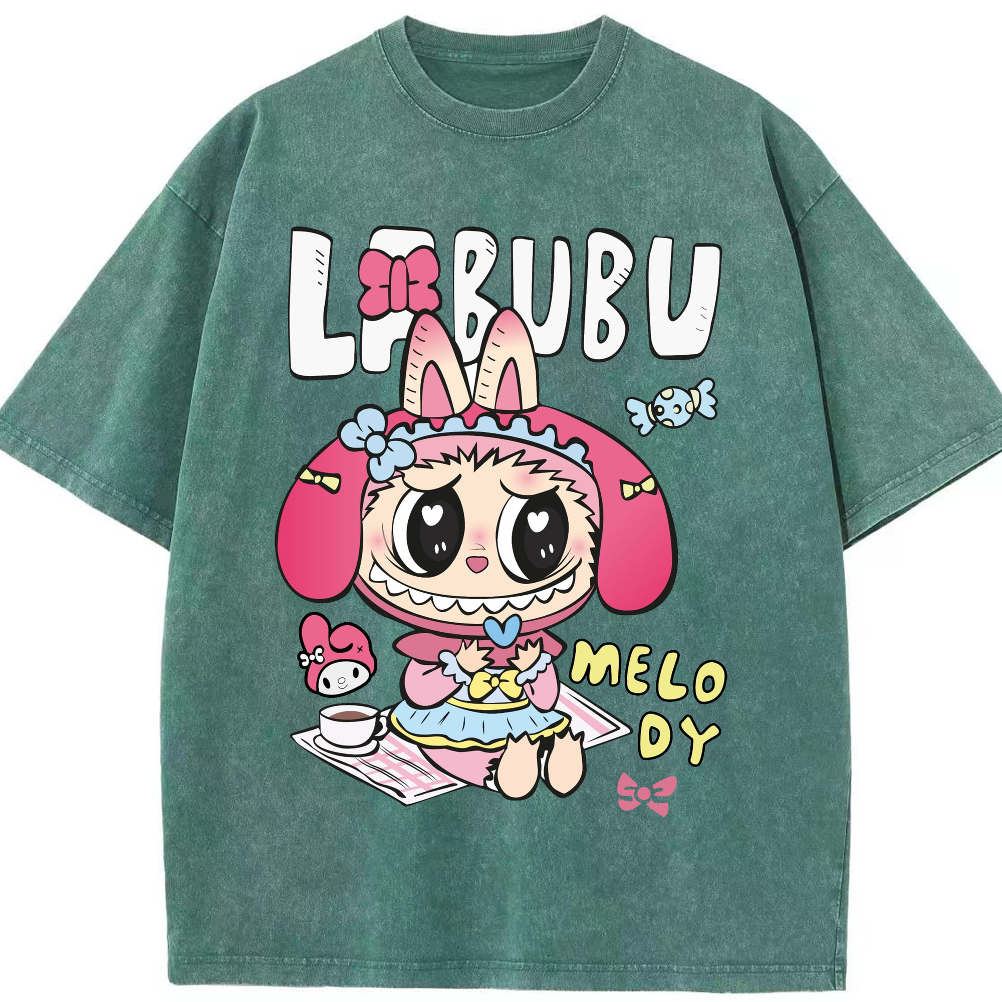 【限定】サンリオマイメロディ × ラブブ コラボ - 綿100% ヴィンテージ風 半袖Tシャツ ・ 背面プリント ・ 柔らか肌触り ・ 通気性 快適 ・ スポーツ カジュアル 外出用