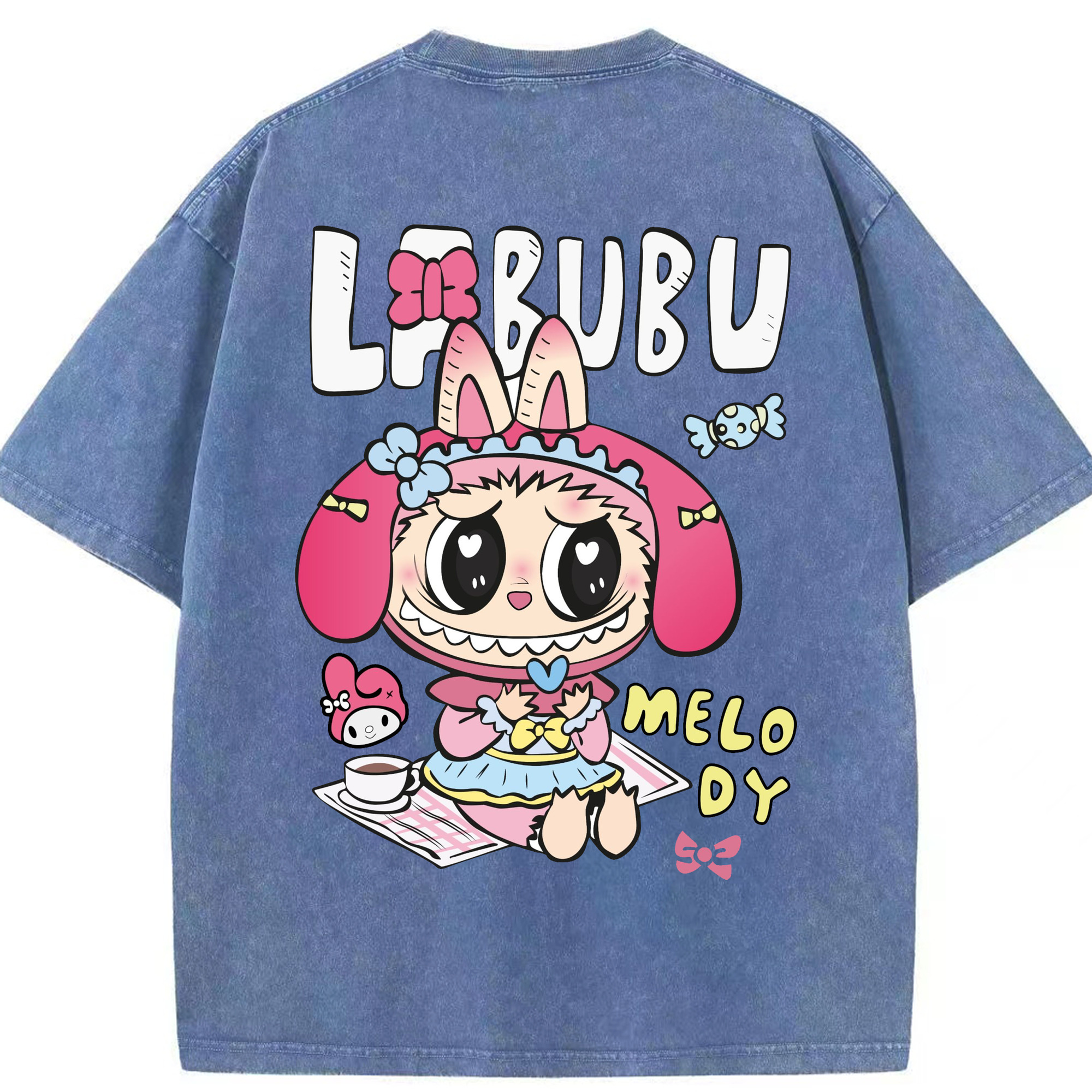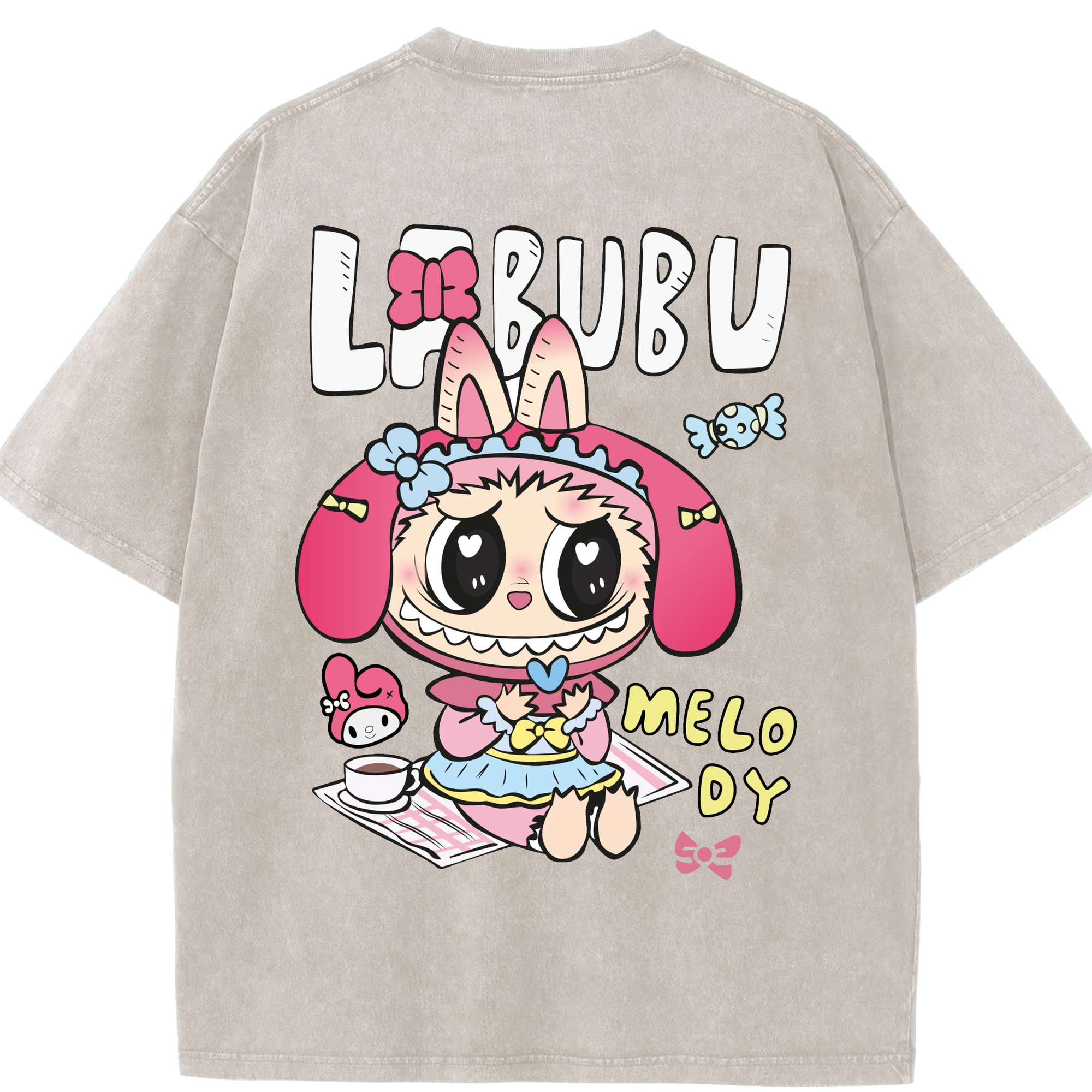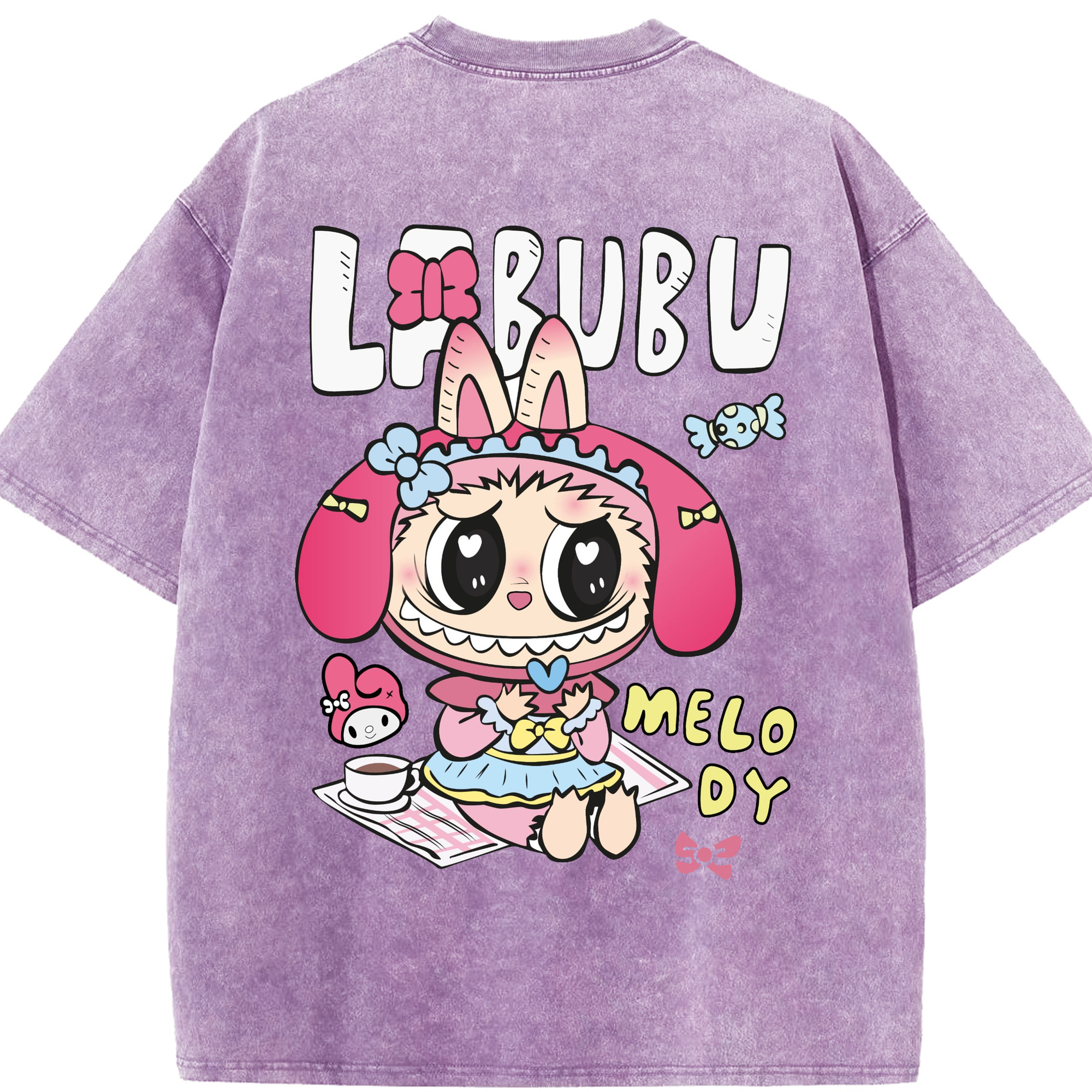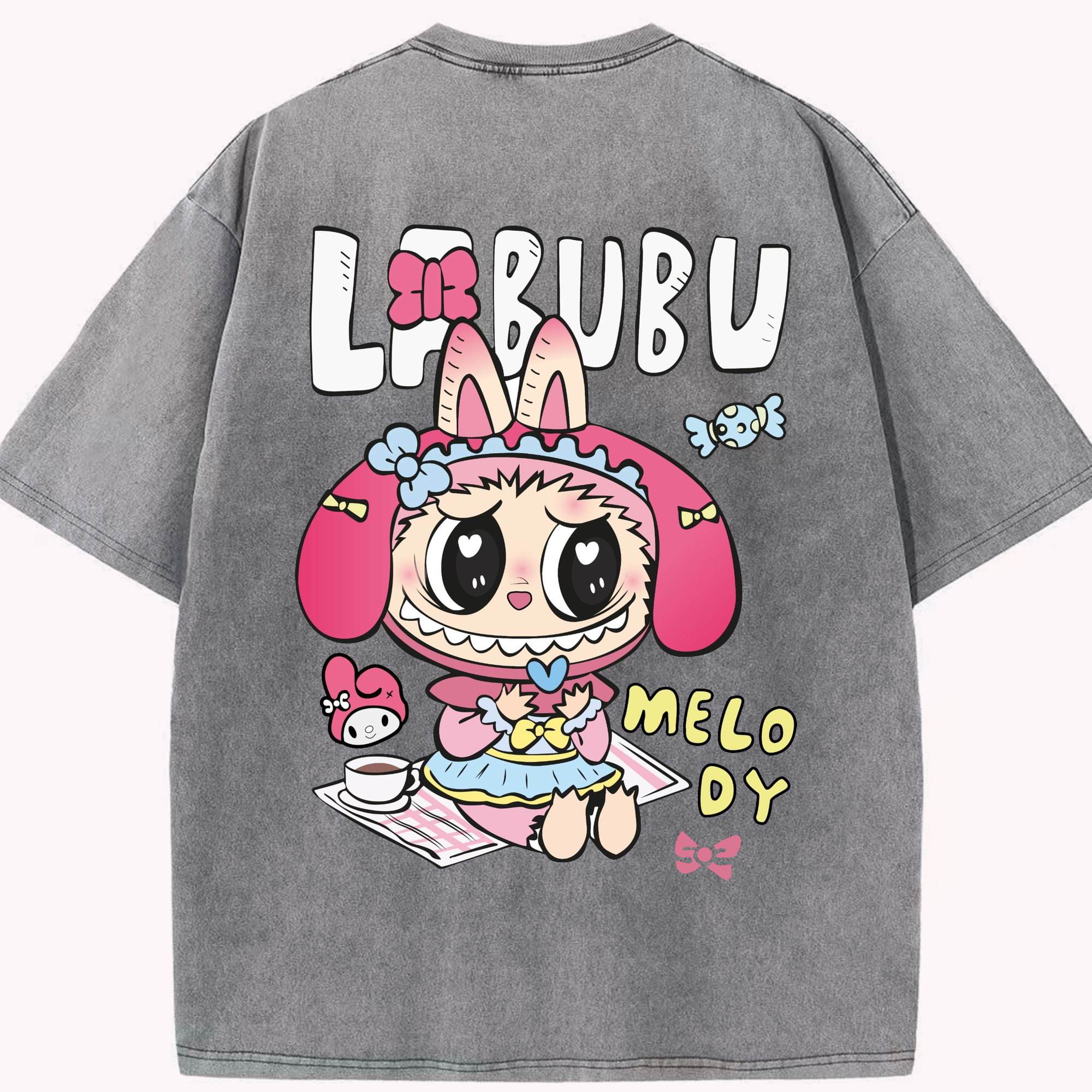 【限定】サンリオマイメロディ × ラブブ コラボ - 綿100% ヴィンテージ風 半袖Tシャツ ・ フロントプリント ・ 柔らか肌触り ・ 通気性 快適 ・ スポーツ カジュアル 外出用