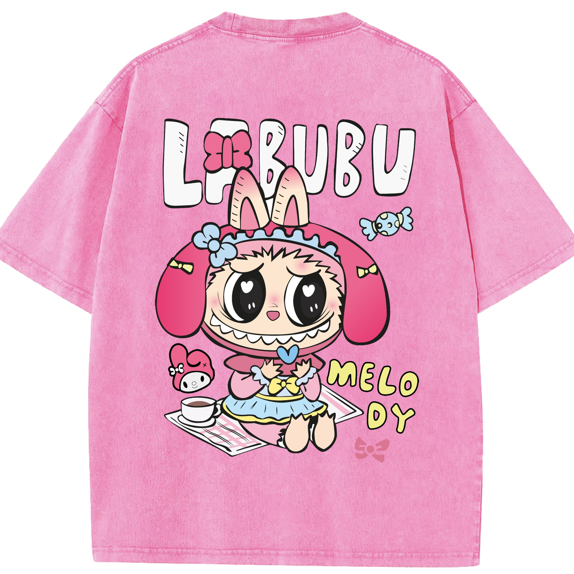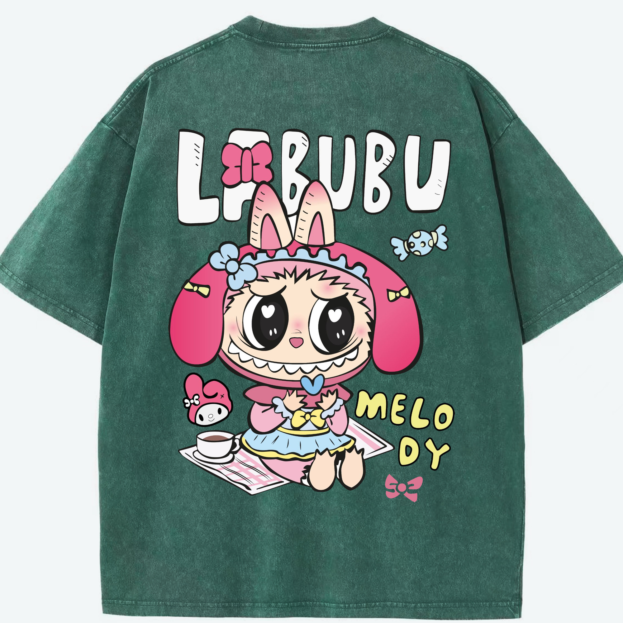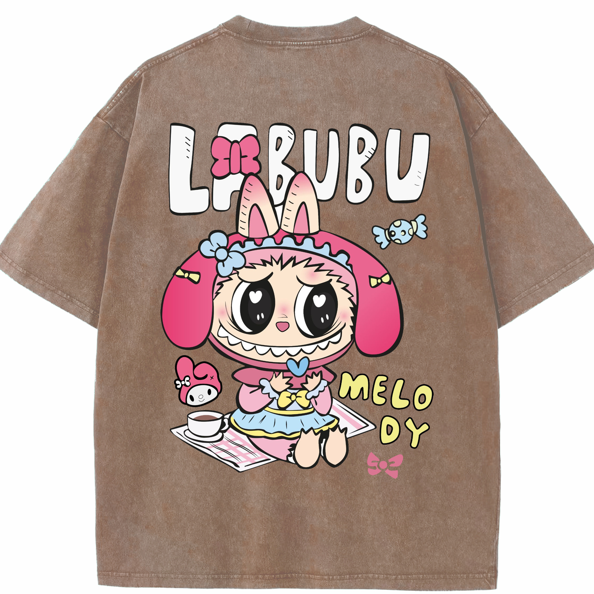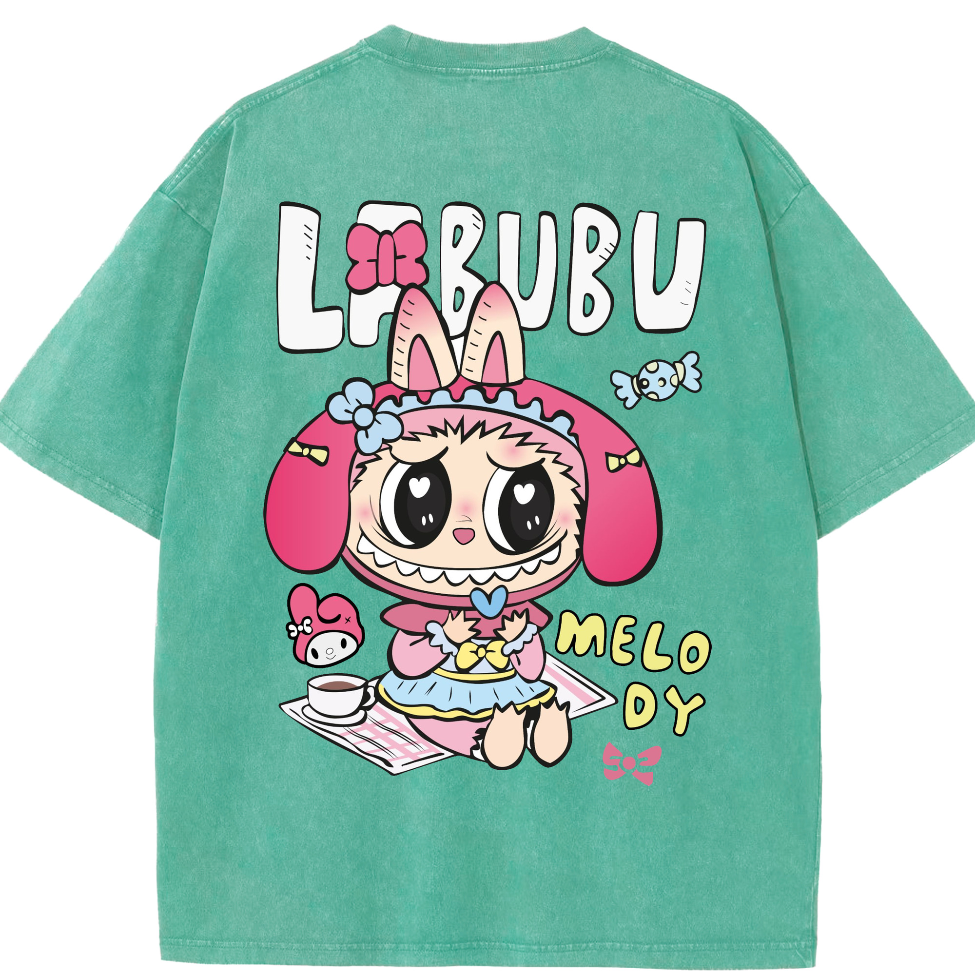 【限定】サンリオマイメロディ × ラブブ コラボ - 綿100% ヴィンテージ風 半袖Tシャツ ・ フロントプリント ・ 柔らか肌触り ・ 通気性 快適 ・ スポーツ カジュアル 外出用