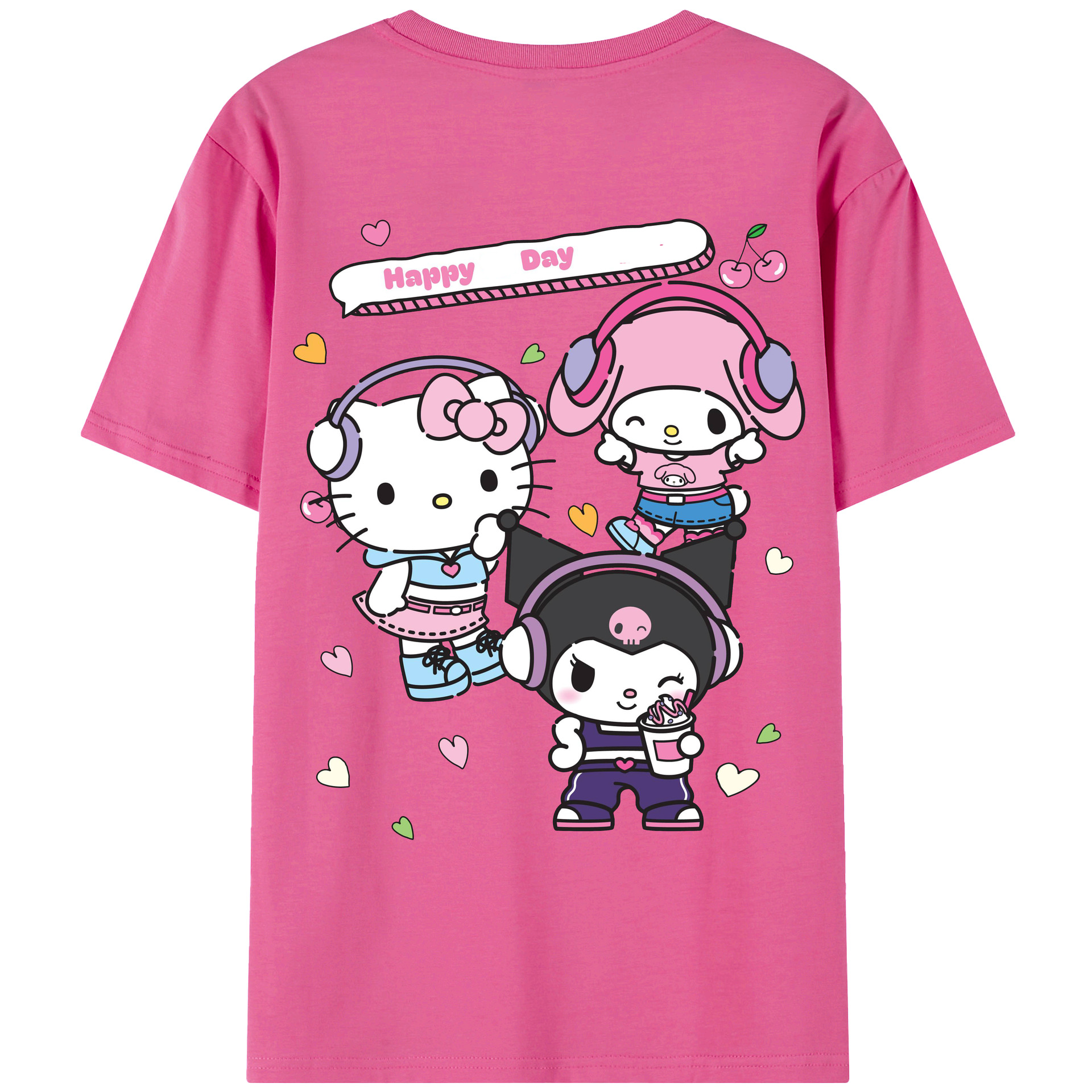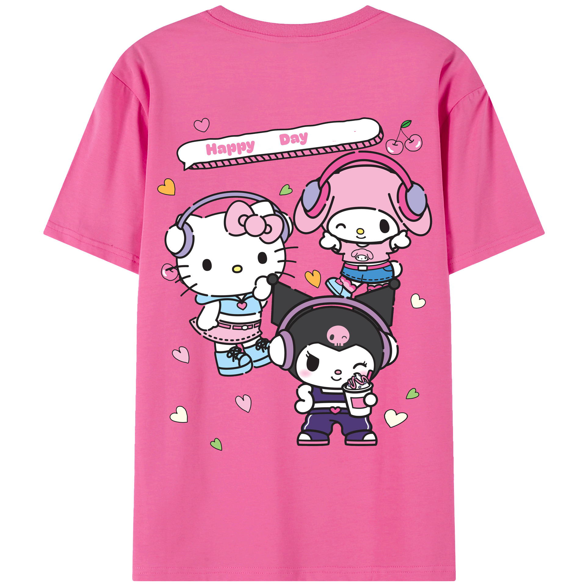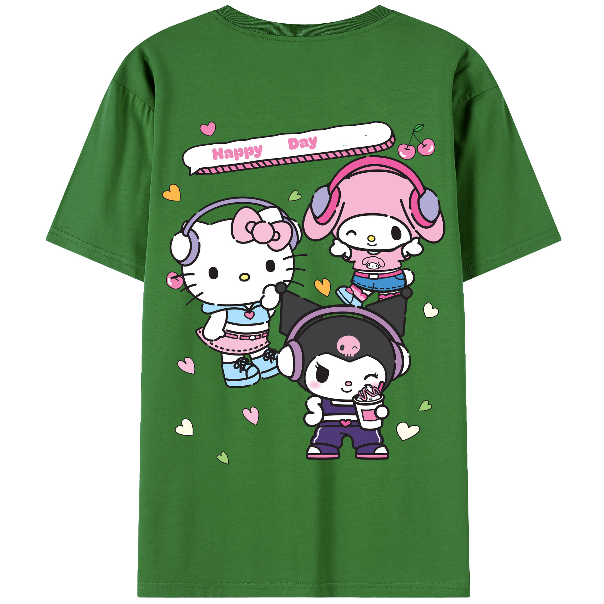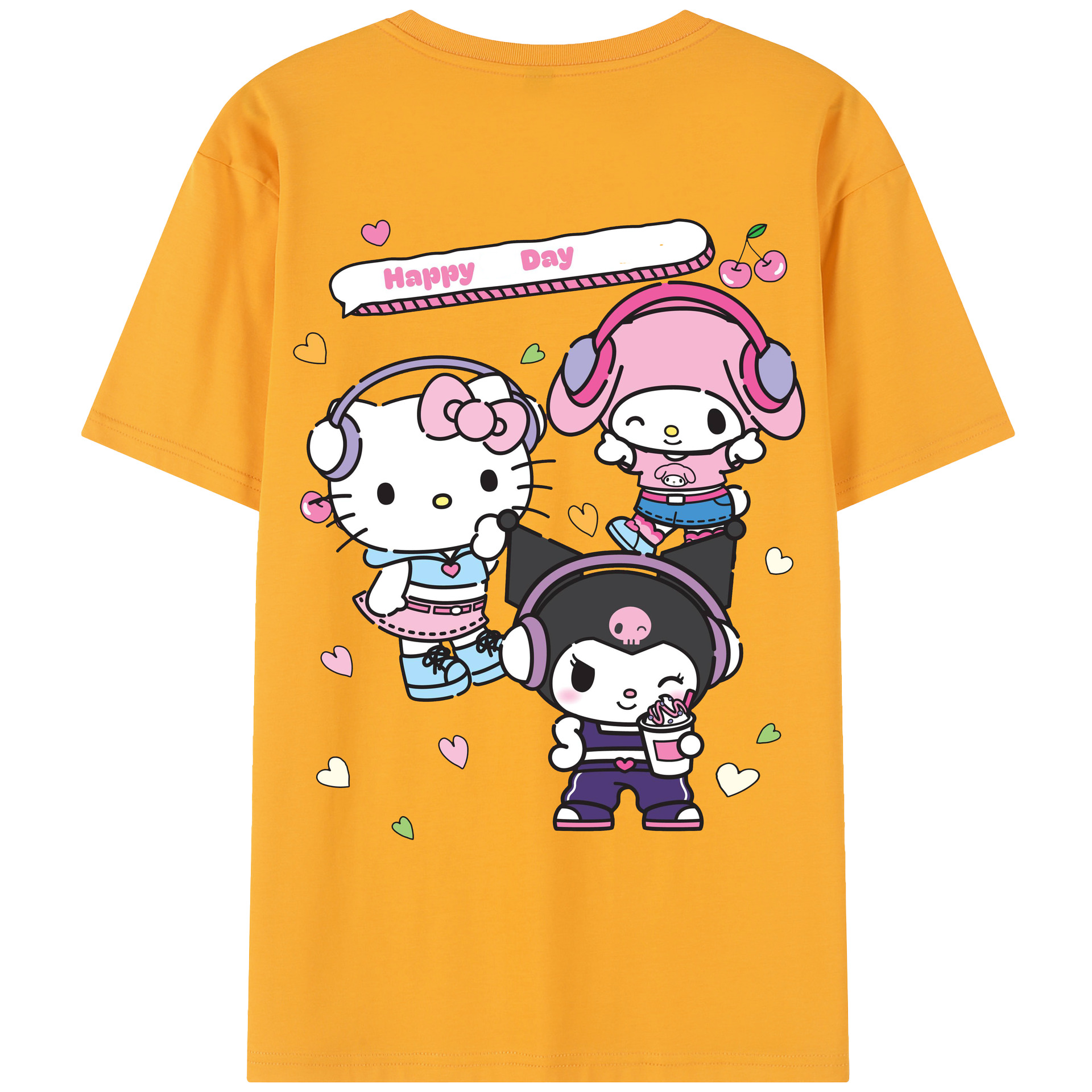 音楽を聴くサンリオキャラ - レディース半袖Tシャツ ・ 綿100% ・ バックプリント ・ 強化クルーネック ・ 二重折り袖口 ・ 快適 通気性 ・ フィットネス カジュアル 旅行用