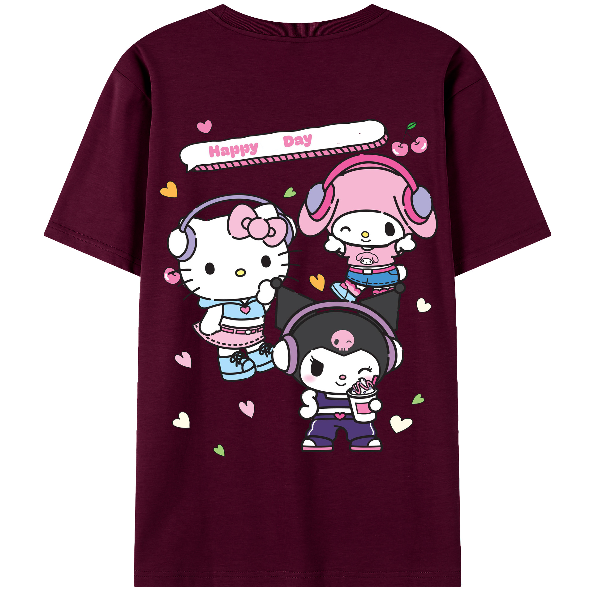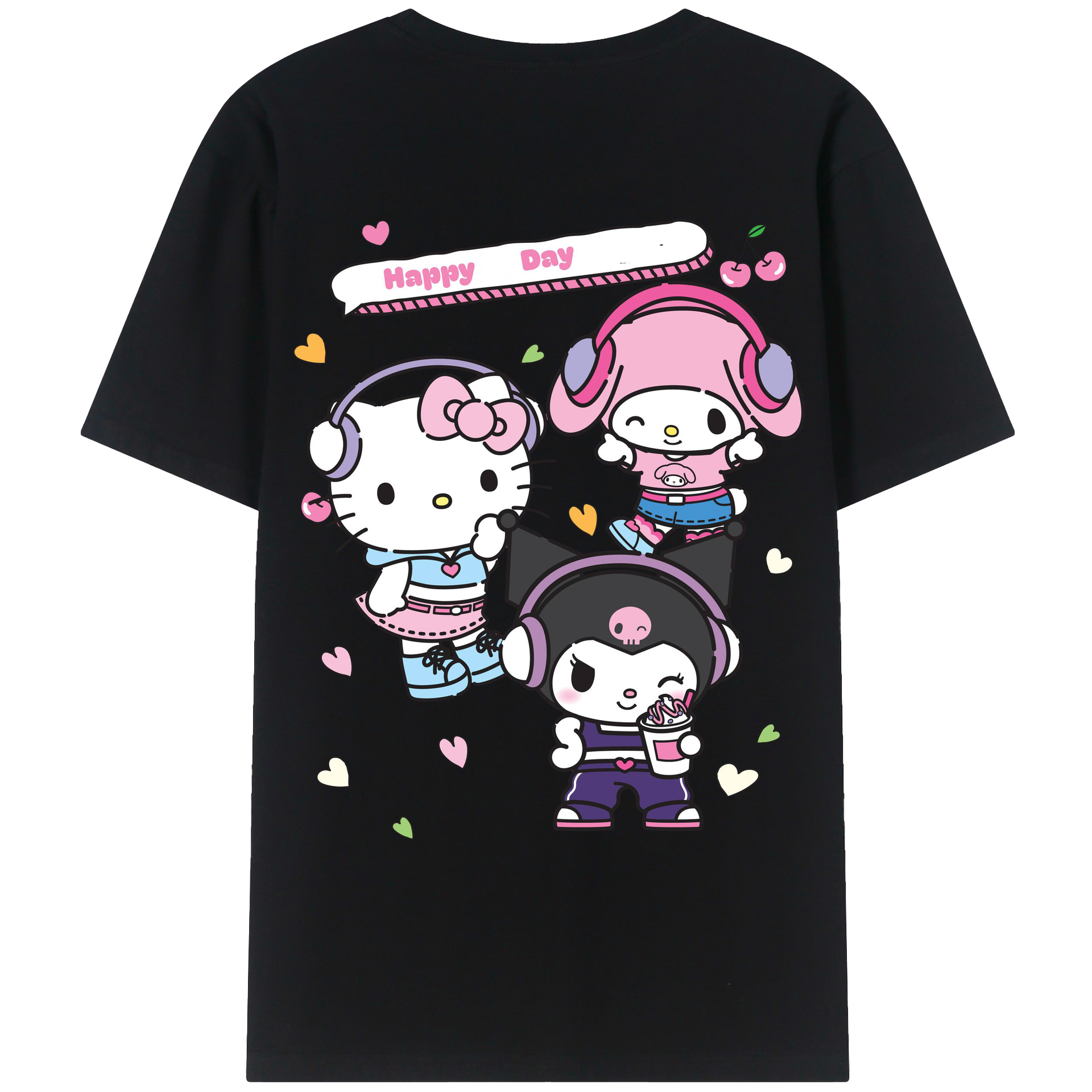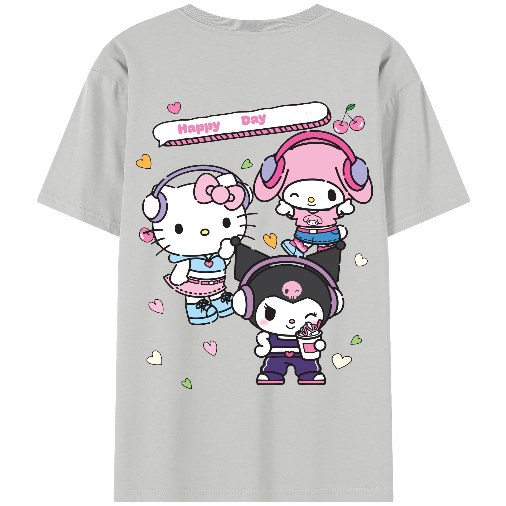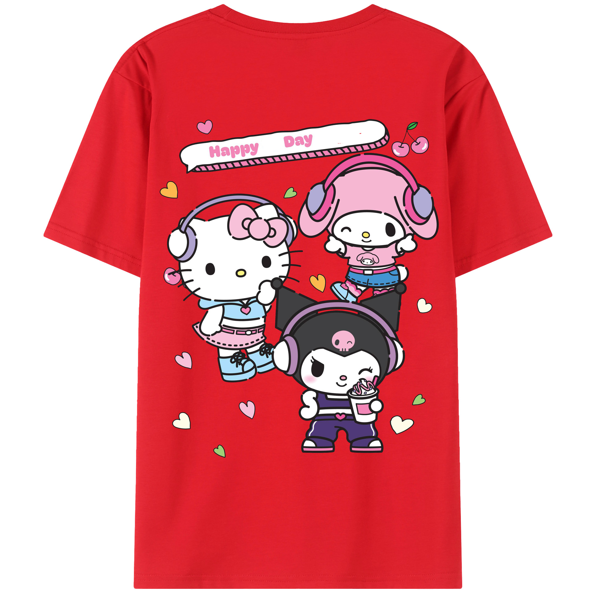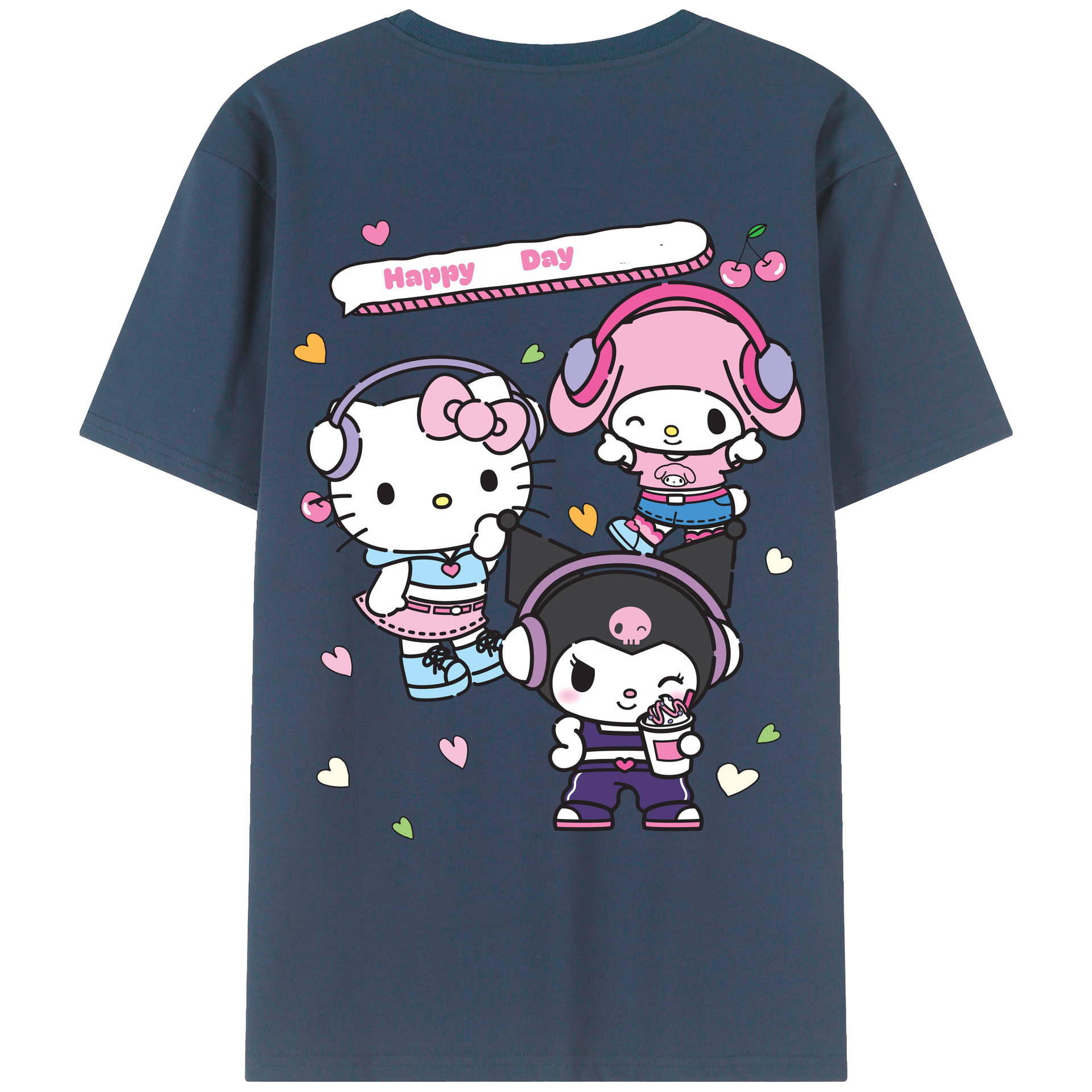 音楽を聴くサンリオキャラ - レディース半袖Tシャツ ・ 綿100% ・ バックプリント ・ 強化クルーネック ・ 二重折り袖口 ・ 快適 通気性 ・ フィットネス カジュアル 旅行用